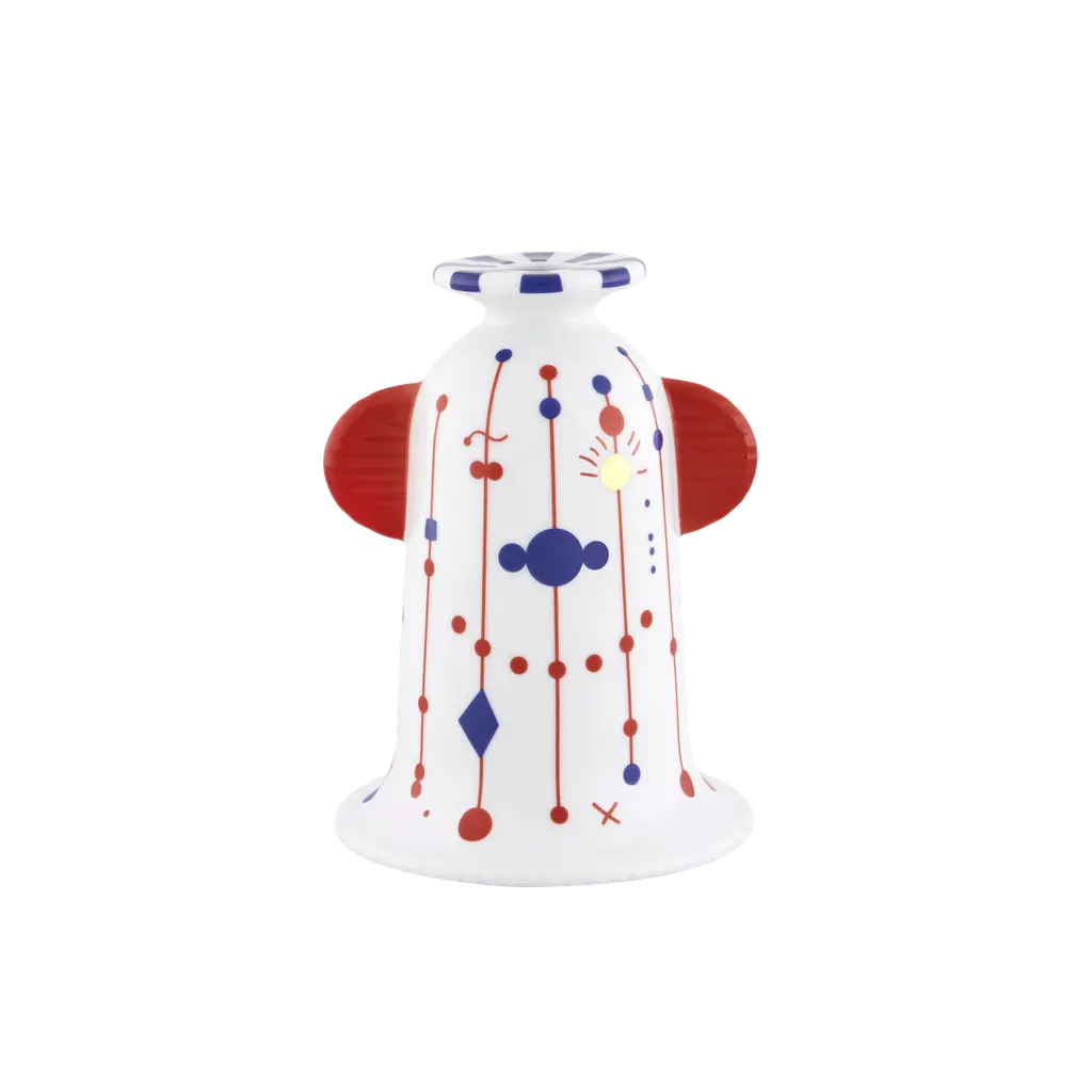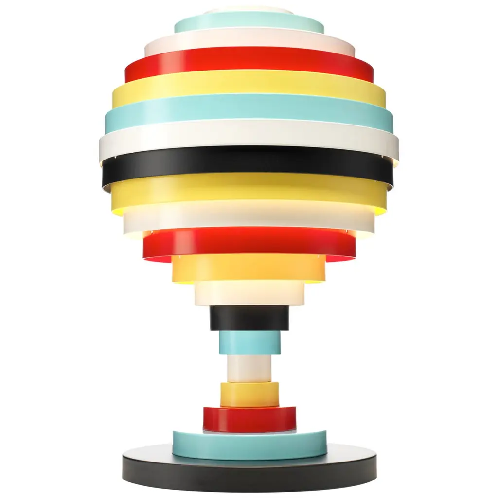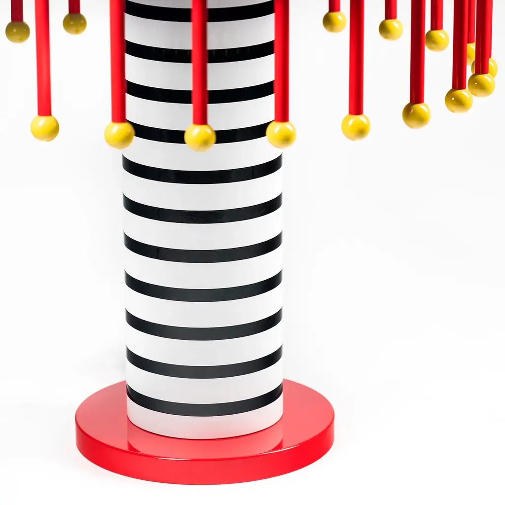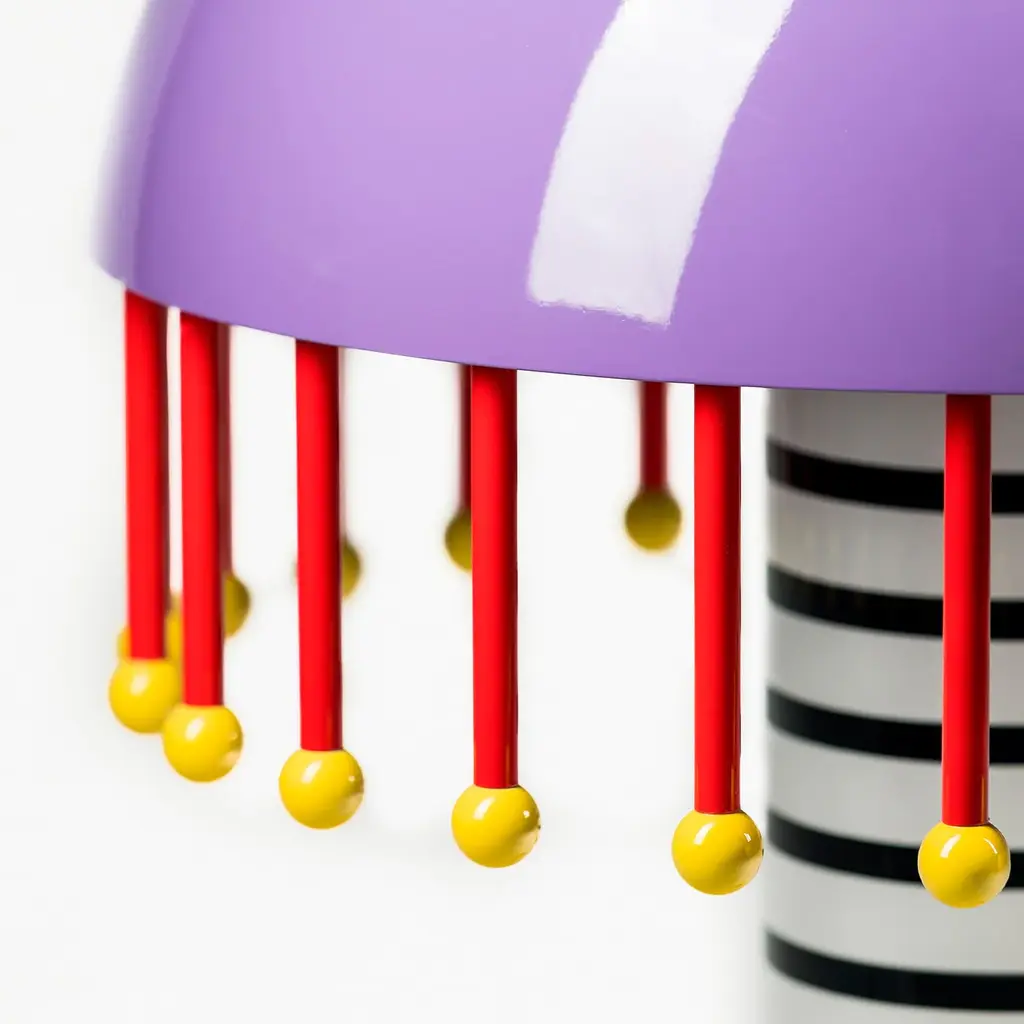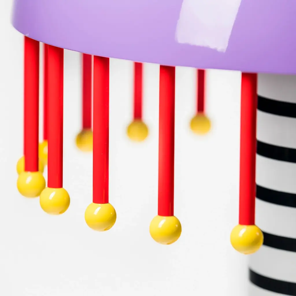 Dedicated to Josephine Baker, the American-born French entertainer whose banana costume became her most iconic image and a symbol of the Jazz Age and the 1920s, the whimsical silhouette of this colorful aluminum abat-jour will infuse a playful atmosphere in any room. Composed of a black-and-white striped cylinder on a red disk base, the semicircular purple shade embellished with red and yellow pendants evokes Baker's famous banana skirt. This captivating lamp will stand out on an entryway console, a side table, a bedroom vanity where it will bring a feminine and unconventional exotic touch.