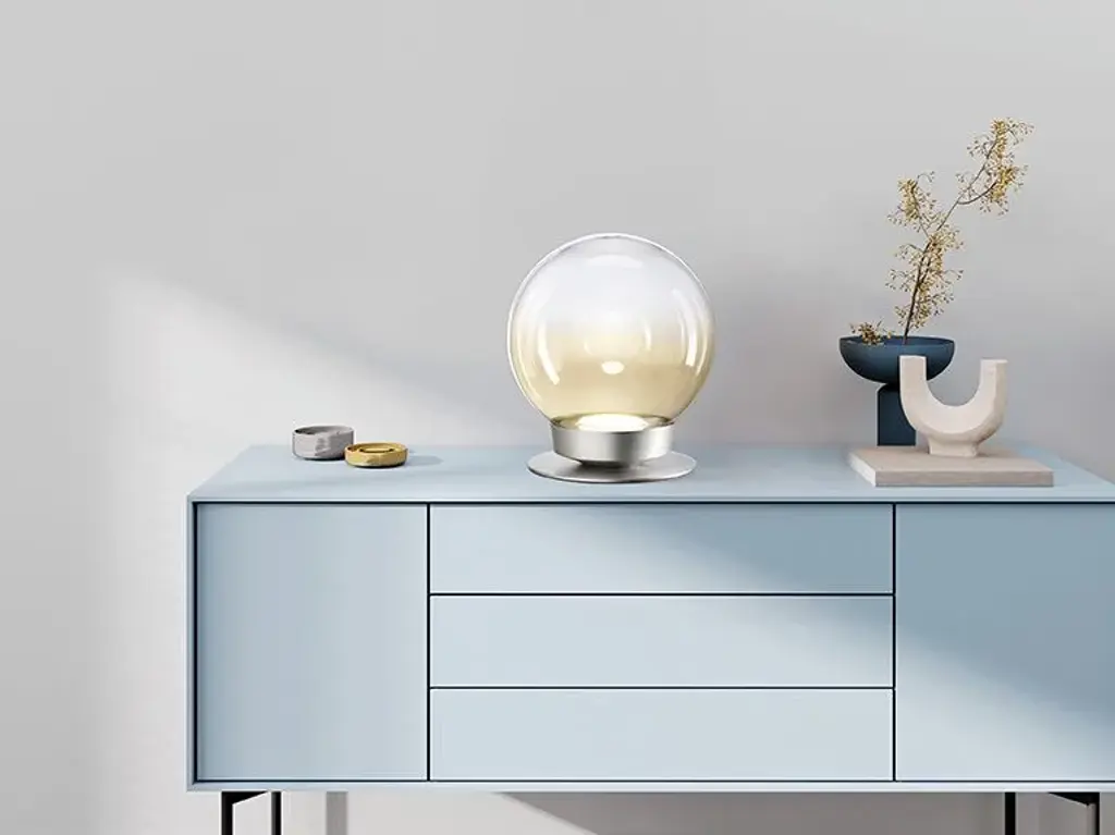 Table lamp from the JOTTO collection made of brushed aluminium metal and transparent Pyrex glass with amber shade (diam. 25 cm). Equipped with dimmer.Light source: GX53, Power: 1x10WLED - DIMMThe strength to fit into any context, the originality to be unparalleled. JOTTO's spherical shape means that it can easily fit into any environment, while the brushed steel support in which the sphere is set, thanks to the technical and severe touch given by the double inclination, makes it unique and clearly distinguishable. Placed in the same environment, JOTTO's multiple identities create coherence and continuity.