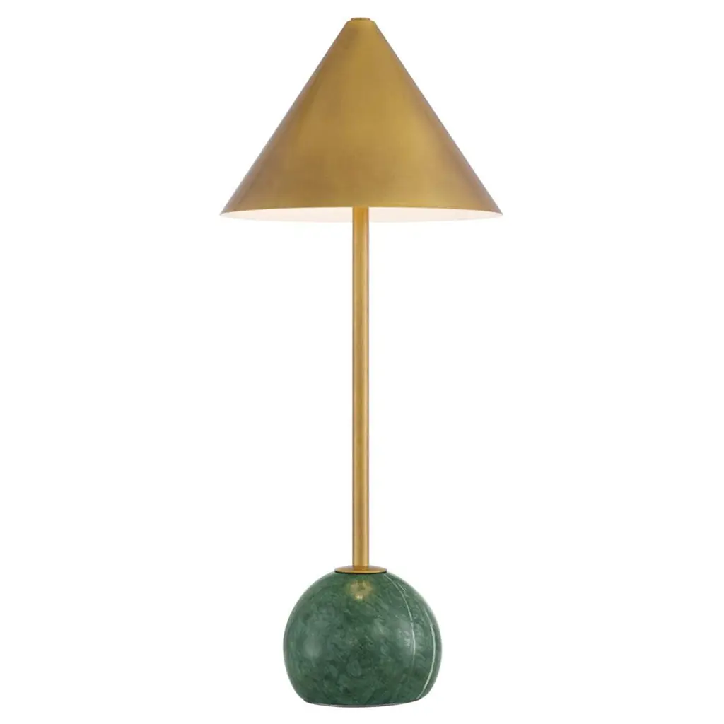 The Journey Green & Brass Cordless Table Lamp packs a fashionable punch for a portable design. The antique brass finish on the long thin stem and the cone-shaped shade brings it a subdued sophisticated gleam, while the green marble globeon the bottom anchors the piece. At less than 20 inches tall, the gold lamp has an on and off button and a battery-life indication light that alerts when it is time to recharge on the side of the base.