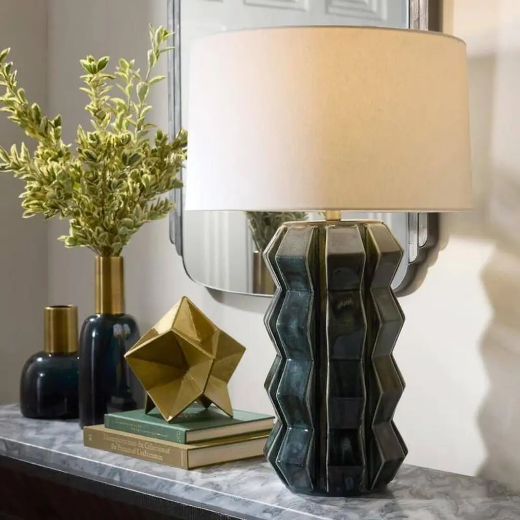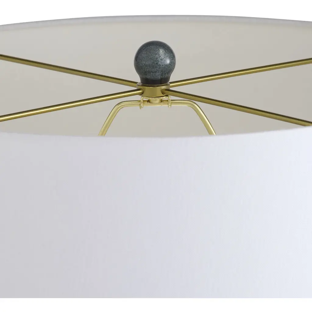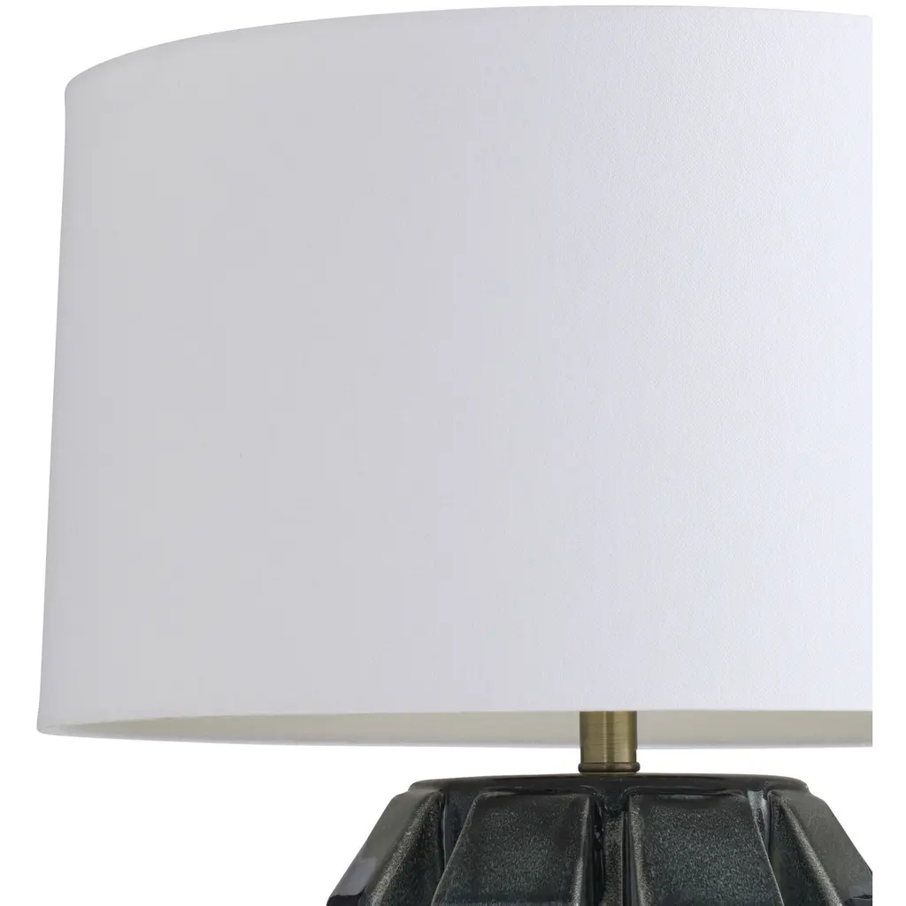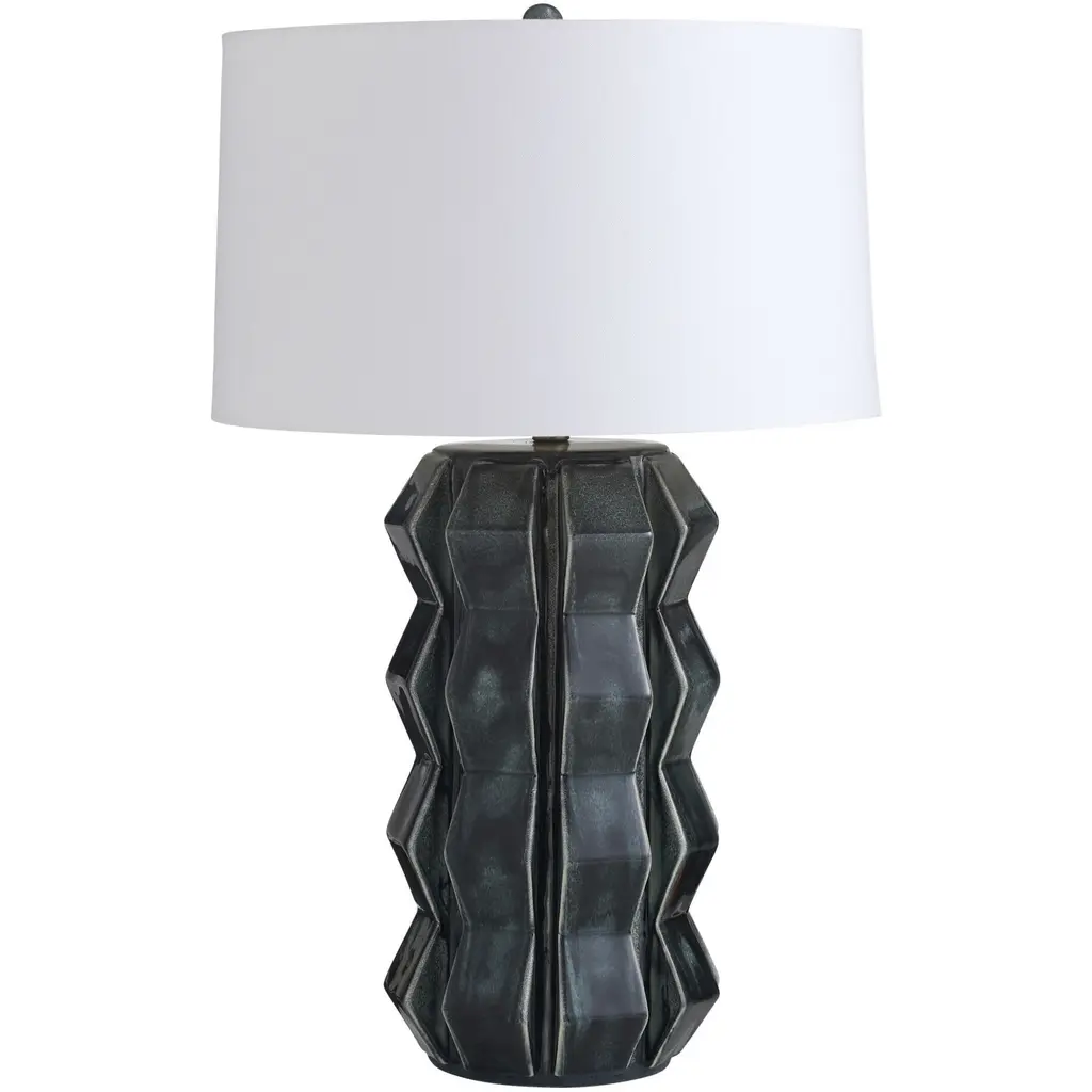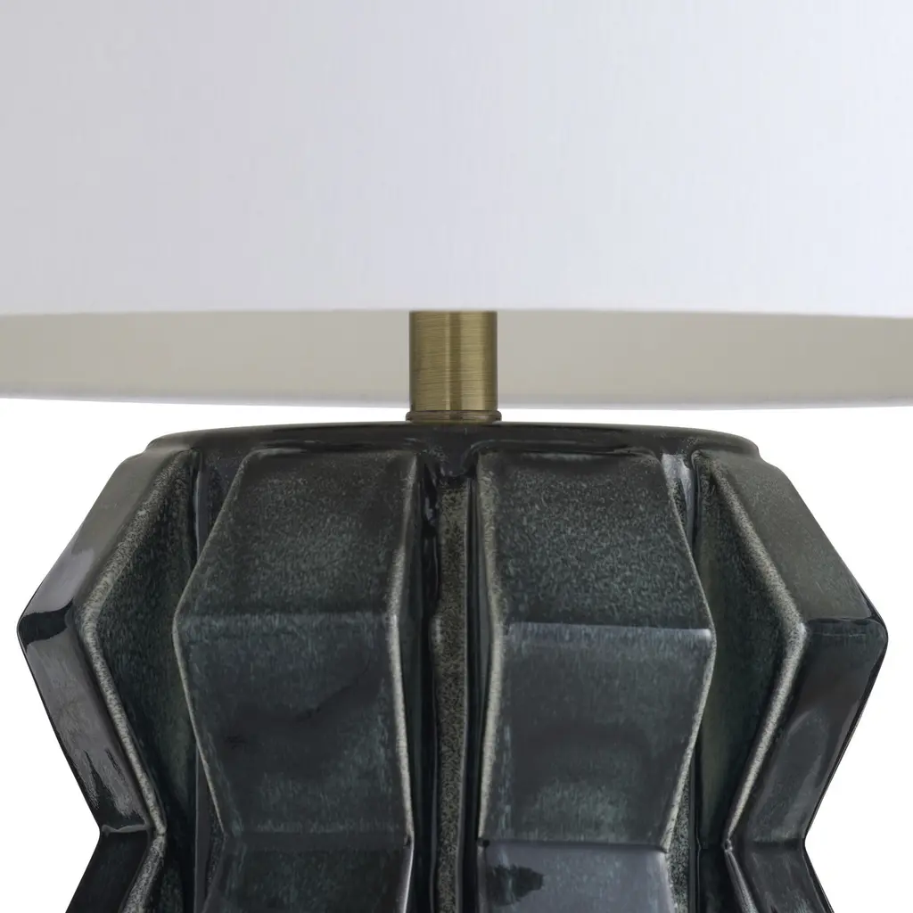 Shaped and glazed to create playful movement, our ceramic Journey is a modern update of a hand-thrown lamp from the mid-century. The zig-zag form is glazed in ocean reactive for subtle gradation and accented with antique brass hardware. Topped with a white linen drum shade and matching ceramic finial. Finish will vary.