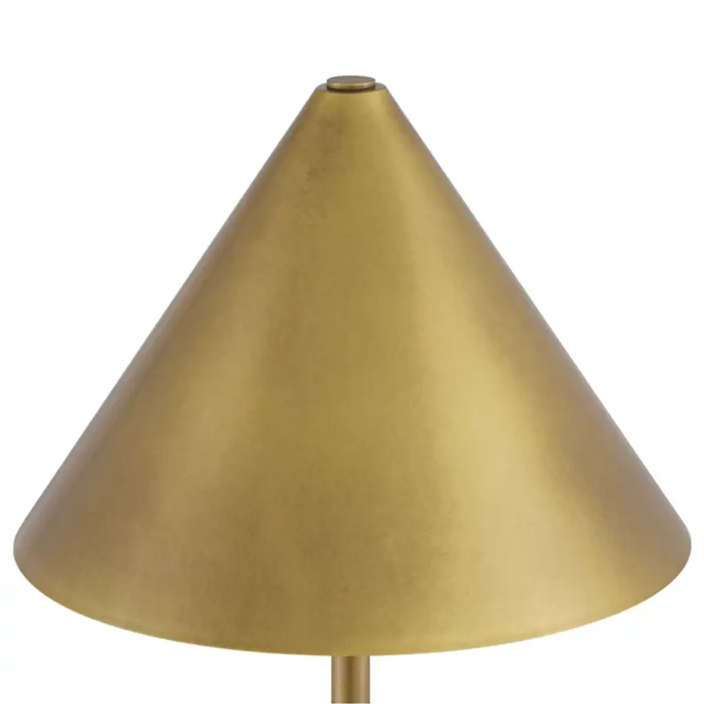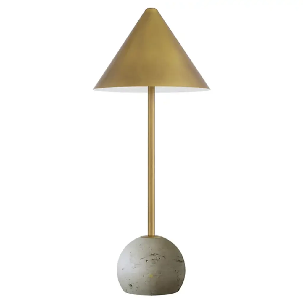 The Journey Cordless Table Lamp from Currey & Company pairs natural marble with minimalist metalwork. A spherical marble base provides a stable foundation for the slender stem, while the cone-shaped empire shade adds architectural interest. This portable design includes smart features like a battery life indicator and a convenient charging base. Its compact size allows for versatile placement. The metallic finishes throughout enhance the natural veining patterns in the marble base. Each piece exhibits unique stone characteristics, making every lamp one-of-a-kind.