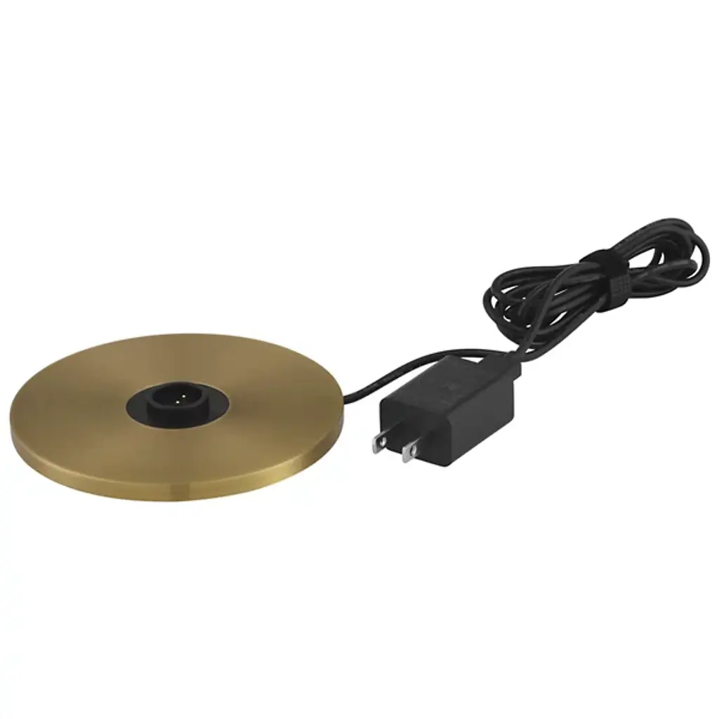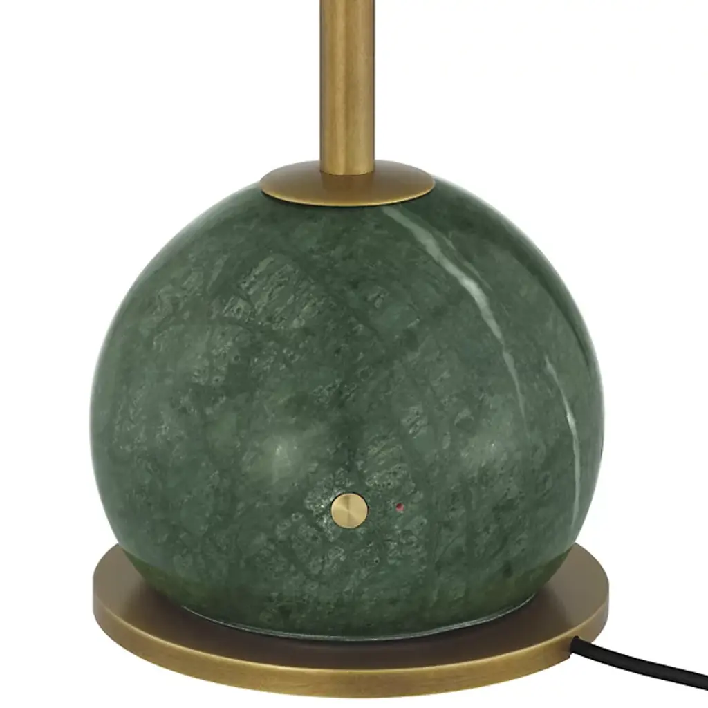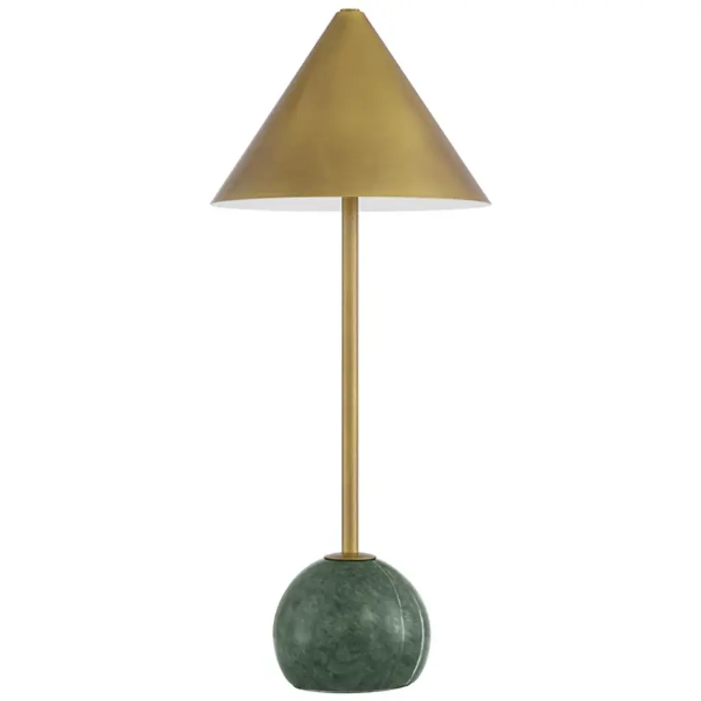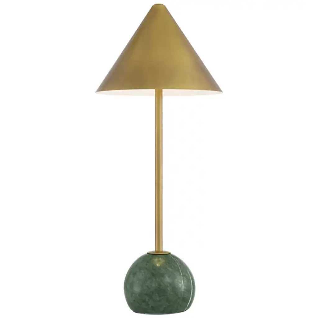 The Journey Cordless Table Lamp from Currey & Company pairs natural marble with minimalist metalwork. A spherical marble base provides a stable foundation for the slender stem, while the cone-shaped empire shade adds architectural interest. This portable design includes smart features like a battery life indicator and a convenient charging base. Its compact size allows for versatile placement. The metallic finishes throughout enhance the natural veining patterns in the marble base. Each piece exhibits unique stone characteristics, making every lamp one-of-a-kind.