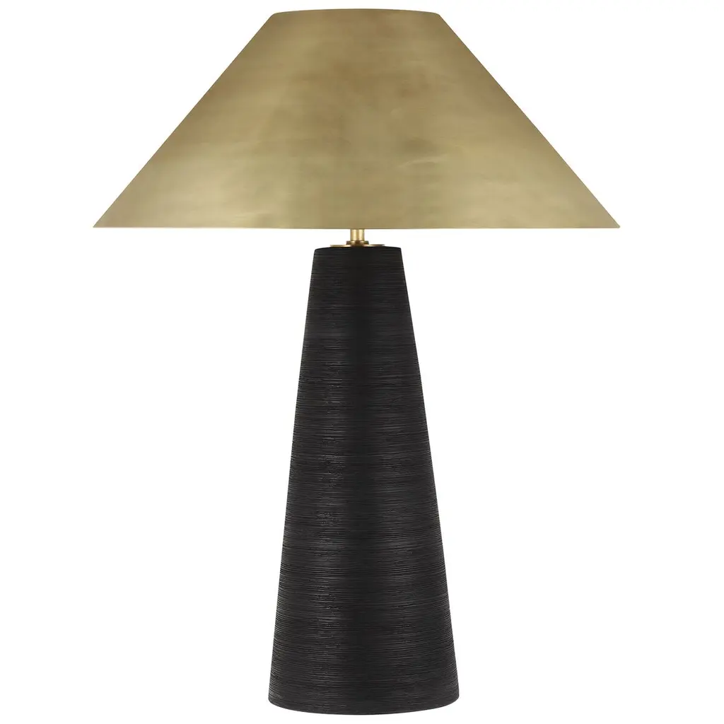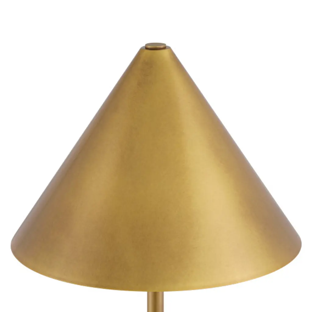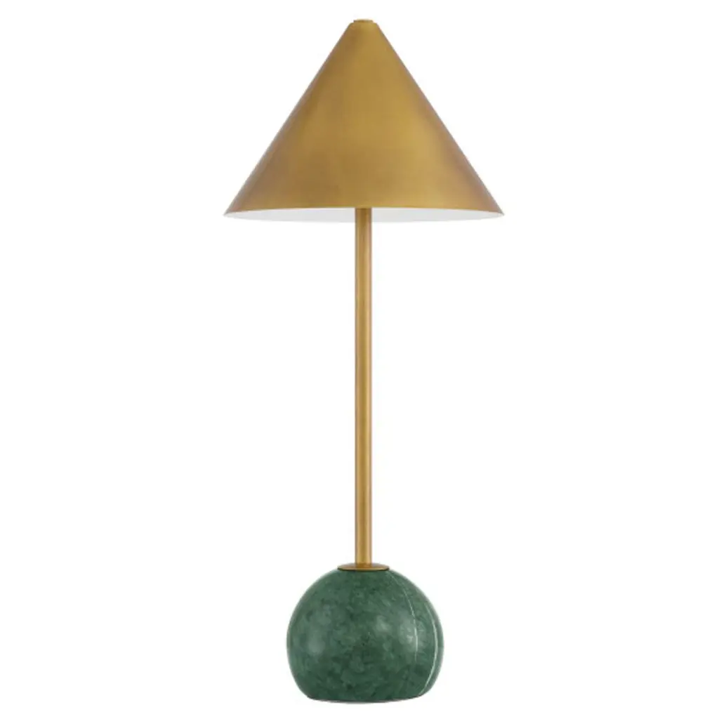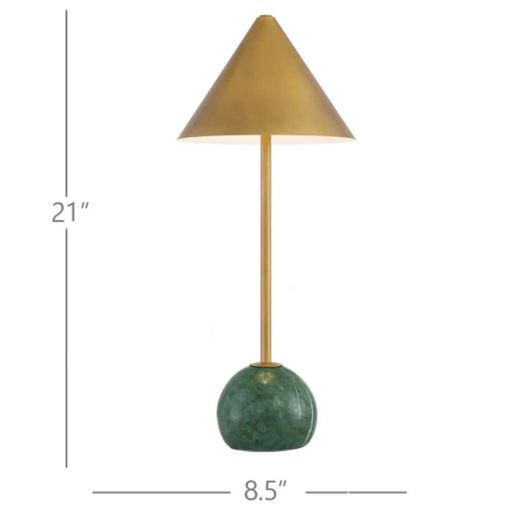 The Journey Cordless Table Lamp packs a fashionable punch for a portable design. The antique brass finish on the long thin stem and the cone-shaped shade brings it a subdued sophisticated gleam, while the marble globe on the bottom anchors the piece. At less than 20 inches tall, the lamp has an on and off button and a battery-life indication light that alerts when it is time to recharge on the side of the base.