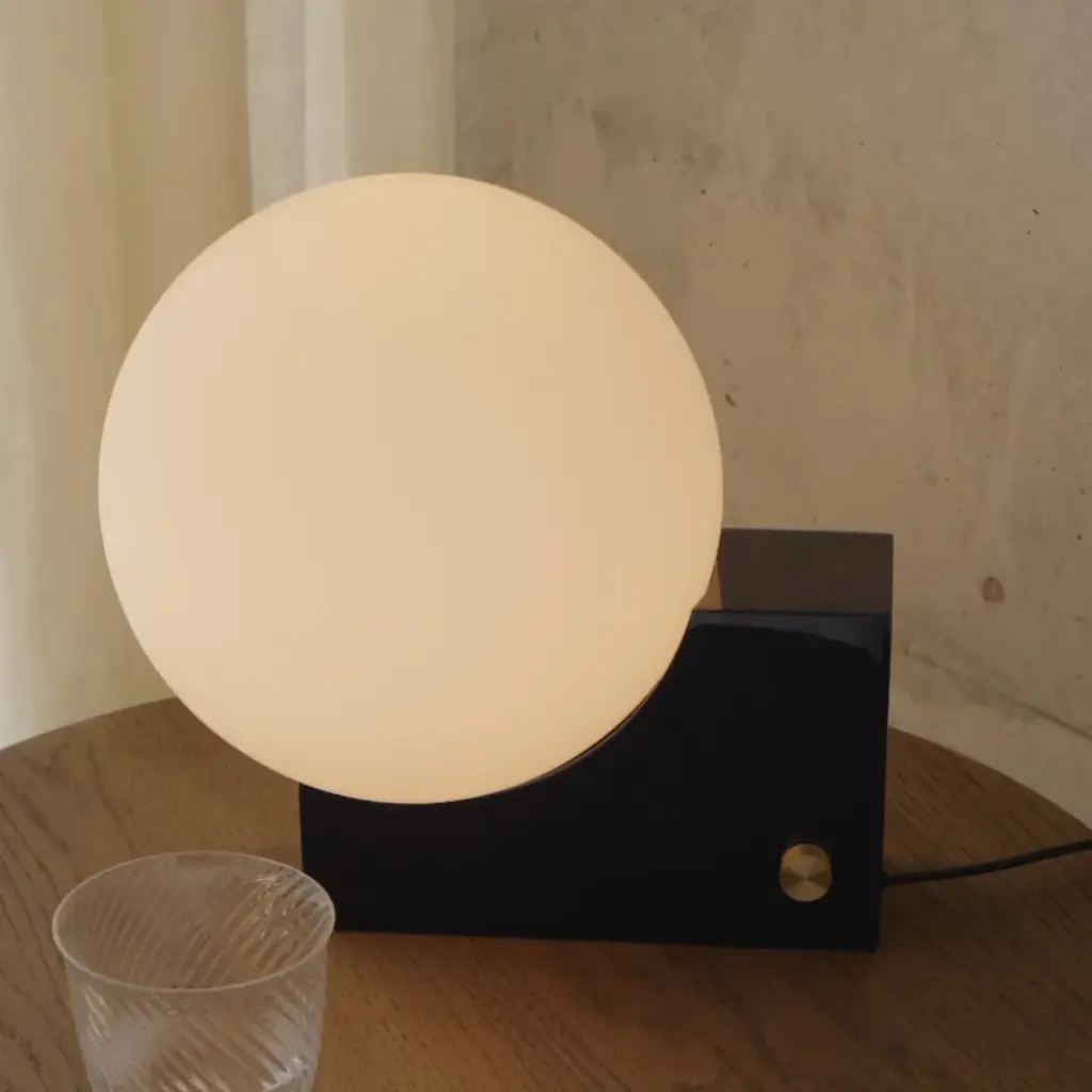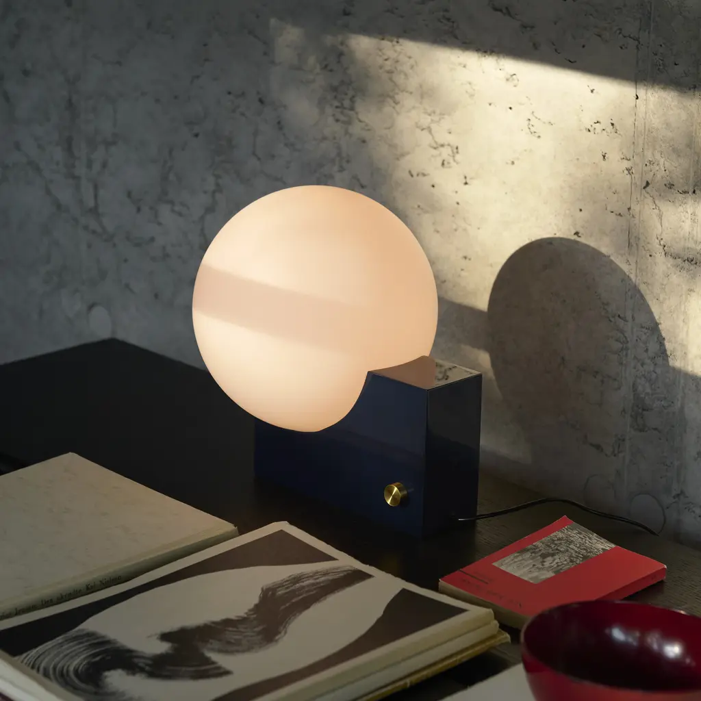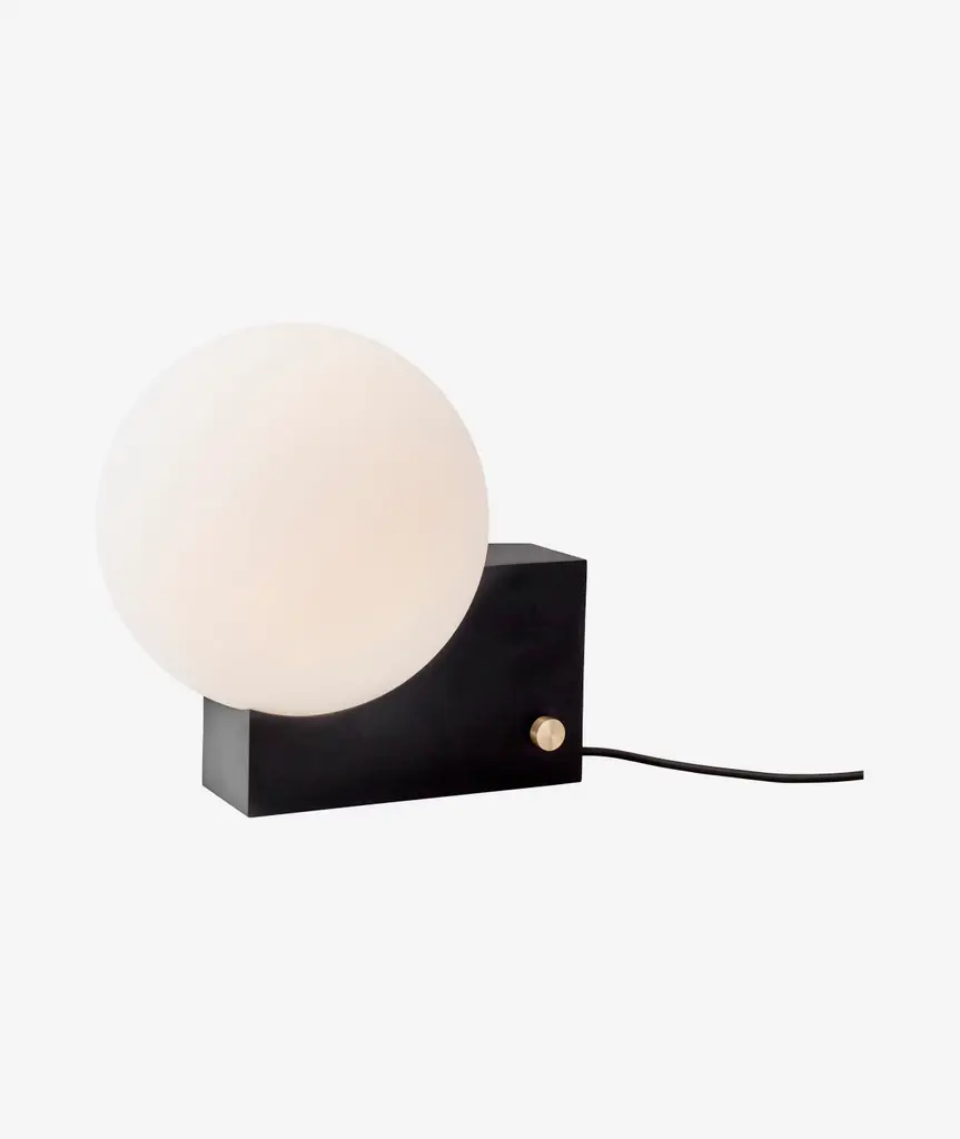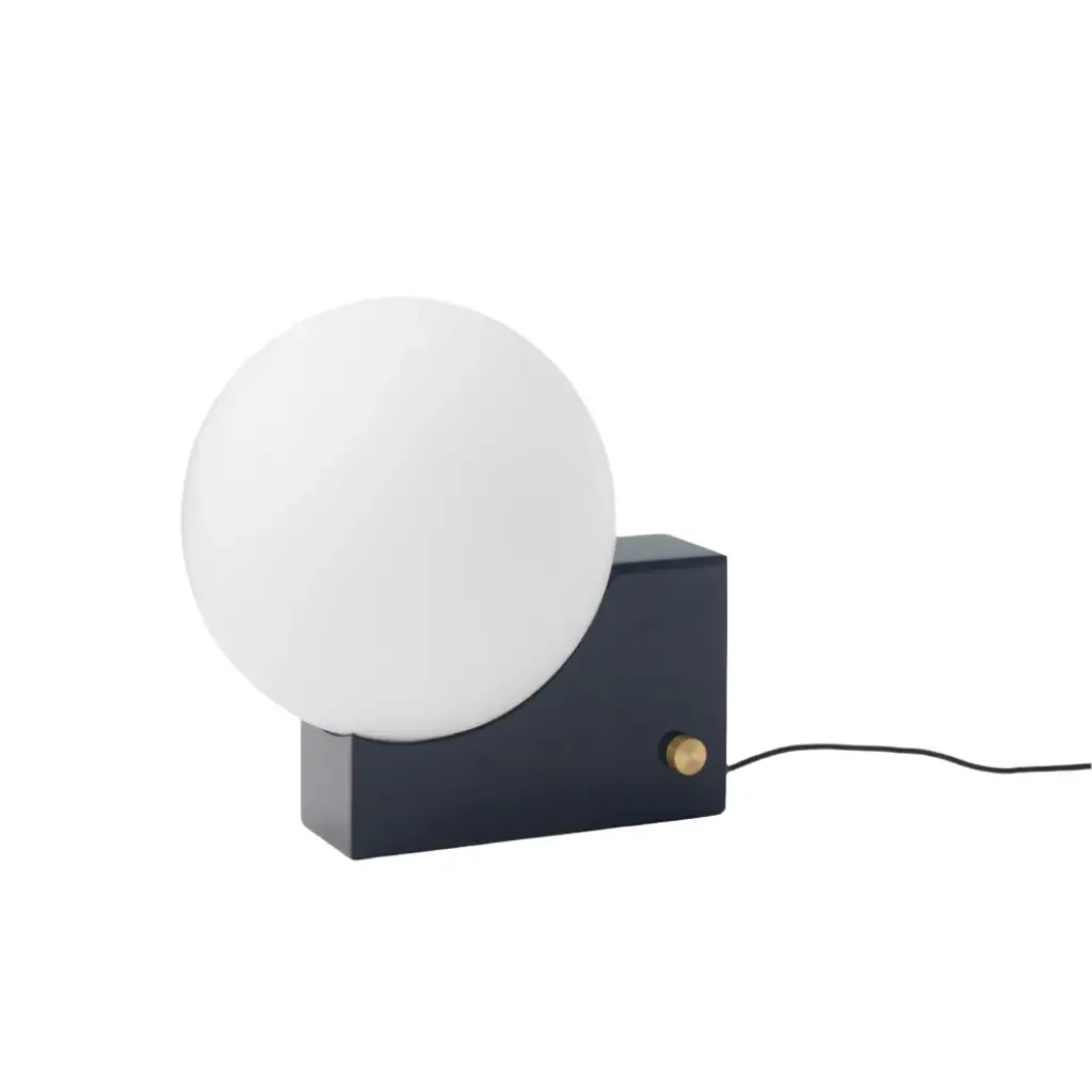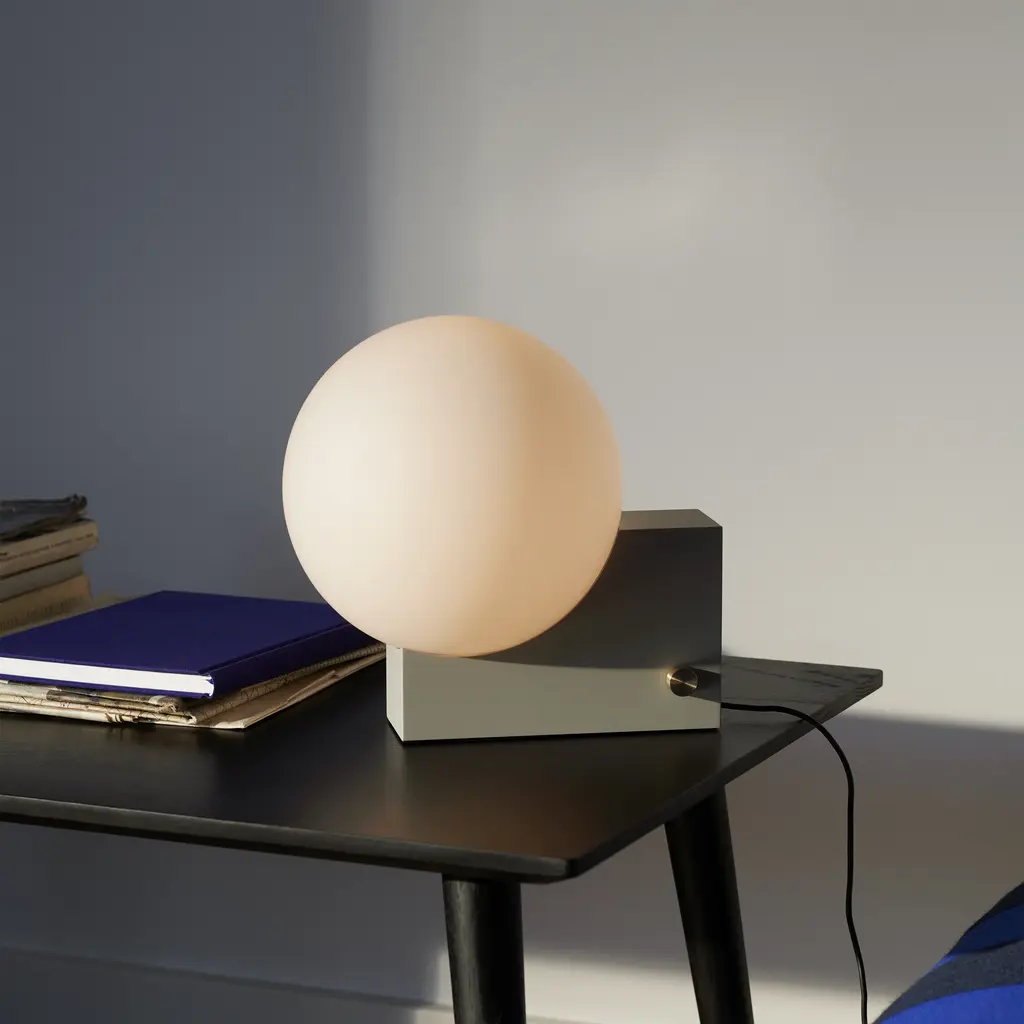 After pursuing various configurations joining a sphere and a rectangle, this lesson in geometry led designer Signe Hytte to a beautifully balanced lamp embracing both. The Journey lamp cradled in the curve of its upright rectangular base, the sphere, when lit, conjures up the feeling of a full moon. And with the dimmer function, it’s a lamp that lets you adjust the atmosphere to suit your mood. In terms of lighting, the dim to warm feature reflects science-based discoveries about how the right light contributes to our health and sense of well-being. Already incorporated into the Journey lamp, it’s a state-of-the-art dimmer function in line with the findings from this year’s Nobel Prize winners. Confirm our inner biological clock and the importance of colder, white light for an energy boost and warm light for creating a sense of calm. The Journey lamp works as a table lamp and a wall lamp. The opal glass shade exudes a soft, ambient light seamlessly controlled via the dimmer knob on the base. Choose from a matte black base with a brass dimmer. Or a clay-toned base with a brass dimmer. Either way, the merging of round and rectangular is a true tribute to Euclid, considered the Father of Geometry. Features