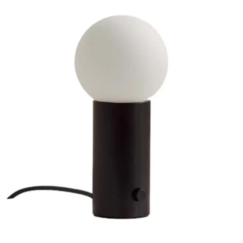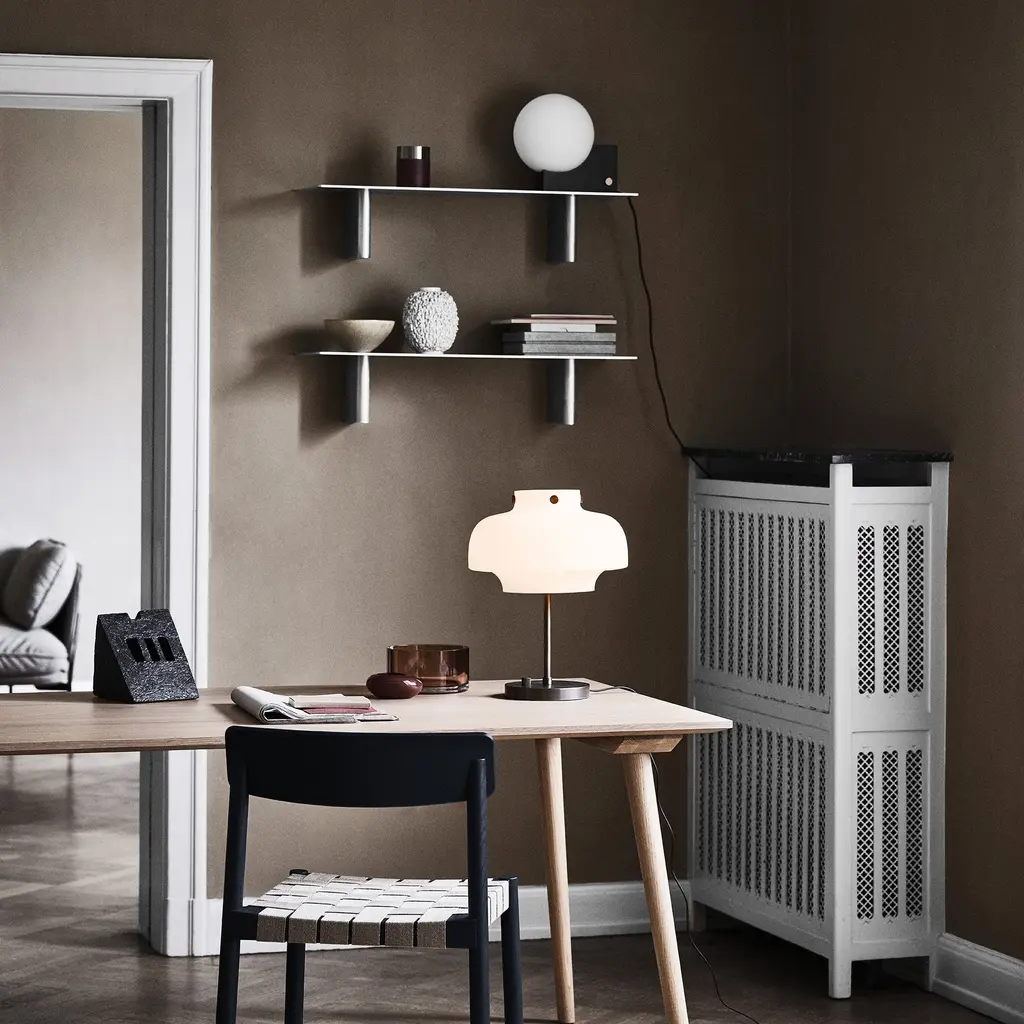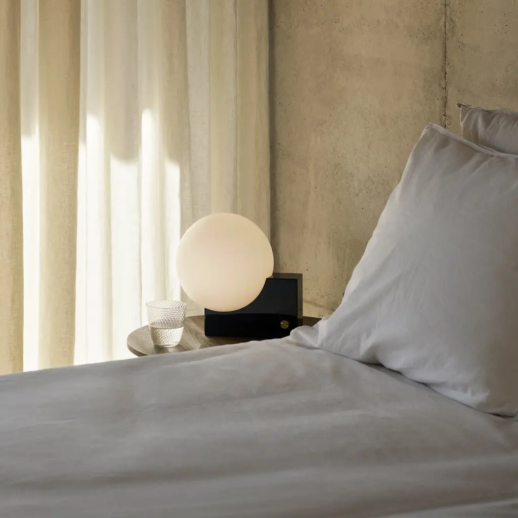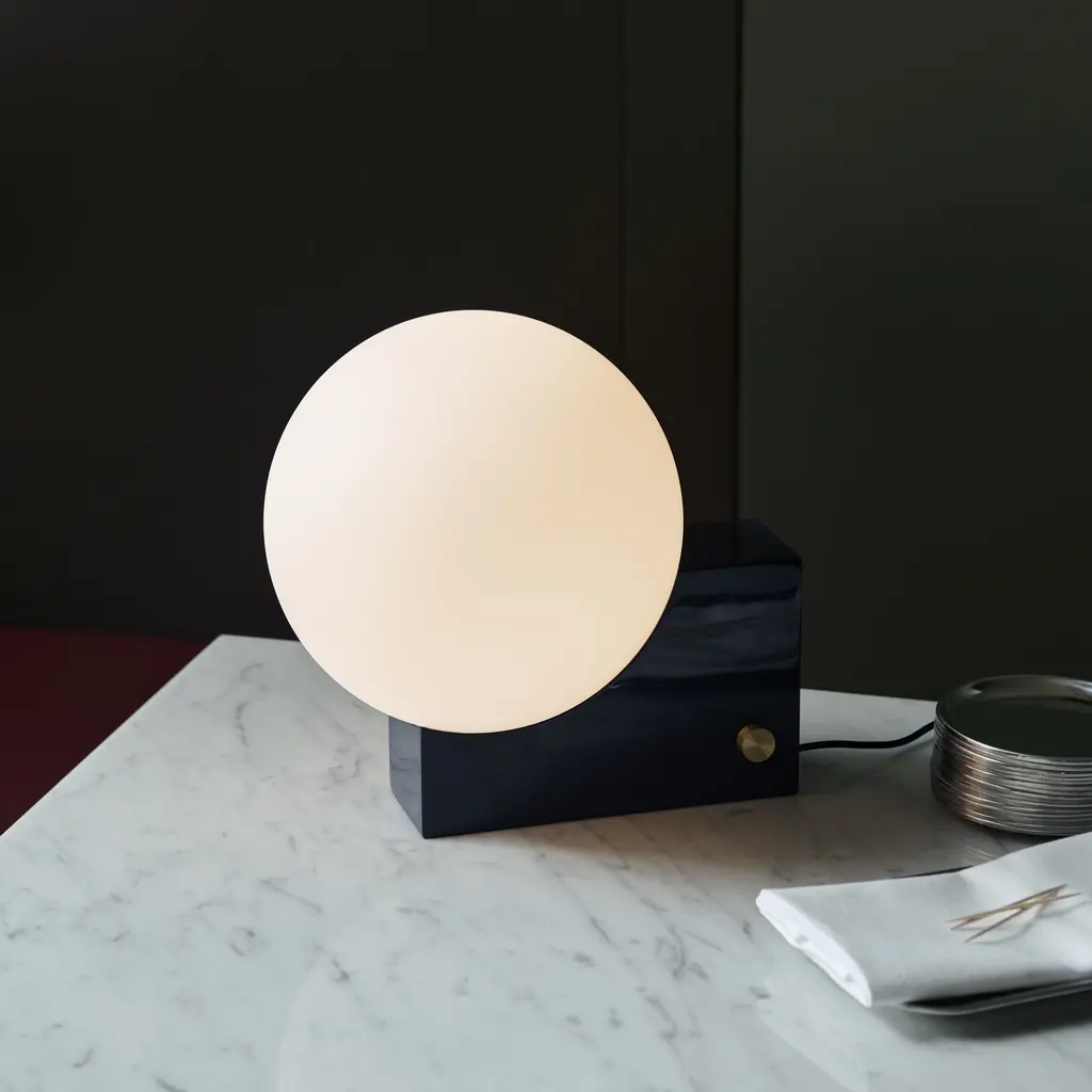 After pursuing various configurations joining a sphere and a rectangle, this lesson in geometry led designer Signe Hytte to a beautifully balanced lamp embracing both. The Journey lamp cradled in the curve of its upright rectangular base, the sphere, when lit, conjures up the feeling of a full moon. And with the dimmer function, it’s a lamp that lets you adjust the atmosphere to suit your mood. In terms of lighting, the dim to warm feature reflects science-based discoveries about how the right light contributes to our health and sense of well-being. Already incorporated into the Journey lamp, it’s a state-of-the-art dimmer function in line with the findings from this year’s Nobel Prize winners. Confirm our inner biological clock and the importance of colder, white light for an energy boost and warm light for creating a sense of calm. The Journey lamp works as a table lamp and a wall lamp. The opal glass shade exudes a soft, ambient light seamlessly controlled via the dimmer knob on the base. Choose from a matte black base with a brass dimmer. Or a clay-toned base with a brass dimmer. Either way, the merging of round and rectangular is a true tribute to Euclid, considered the Father of Geometry. Features
