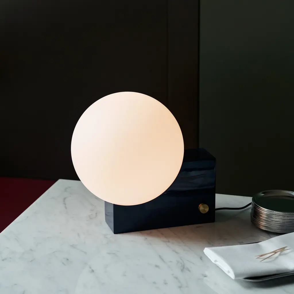 Opposites attract, at least when viewing the harmonizing geometric shapes of a sphere and a rectangle in &Tradition's Journey. Design manager Signe Hytte juxtaposes the lamp's mouth-blown opal glass shade with a squared-off base, available in mirrored chrome to catch the reflections, graphic matte black or a warm clay tone. To place on a table or hang on a wall, it also has a fully dimmable function for the permanent LED light module—to summon just the mood that's desired at any time.