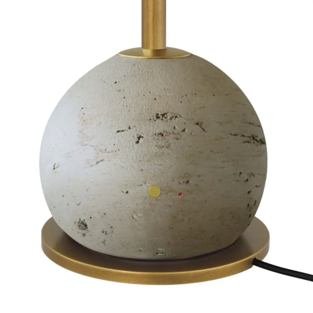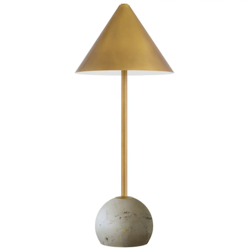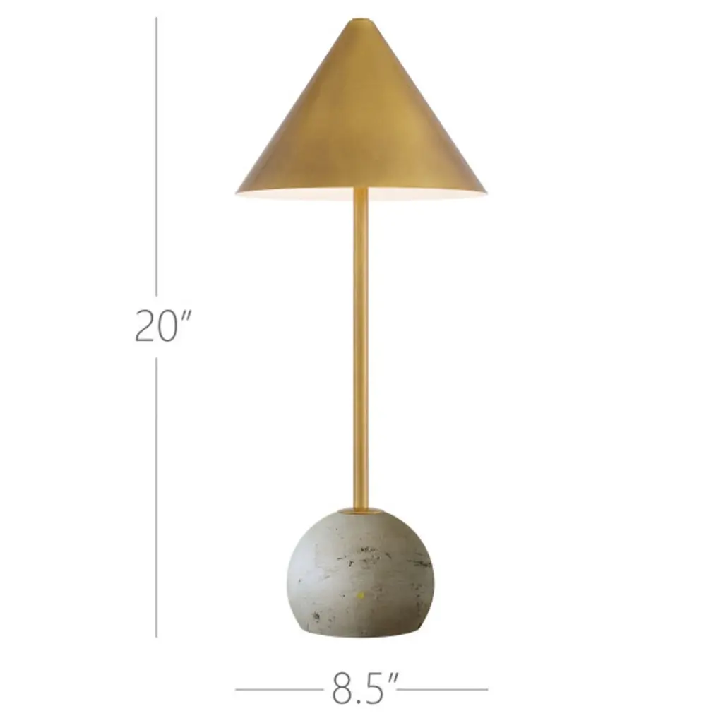 The Journey Cordless Table Lamp combines style and function in a sleek, portable design. A slender stem rises from a marble globe base, complemented by a matching cone-shaped shade that adds a soft, sophisticated gleam. At under 20 inches tall, this compact lamp is easy to move and features an on/off button and a discreet battery-life indicator light on the side of the base, making recharging simple. With its mix of warm metal and natural stone, this cordless piece delivers refined charm wherever it’s placed.