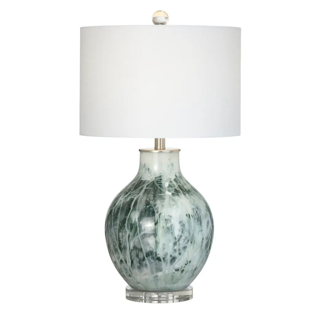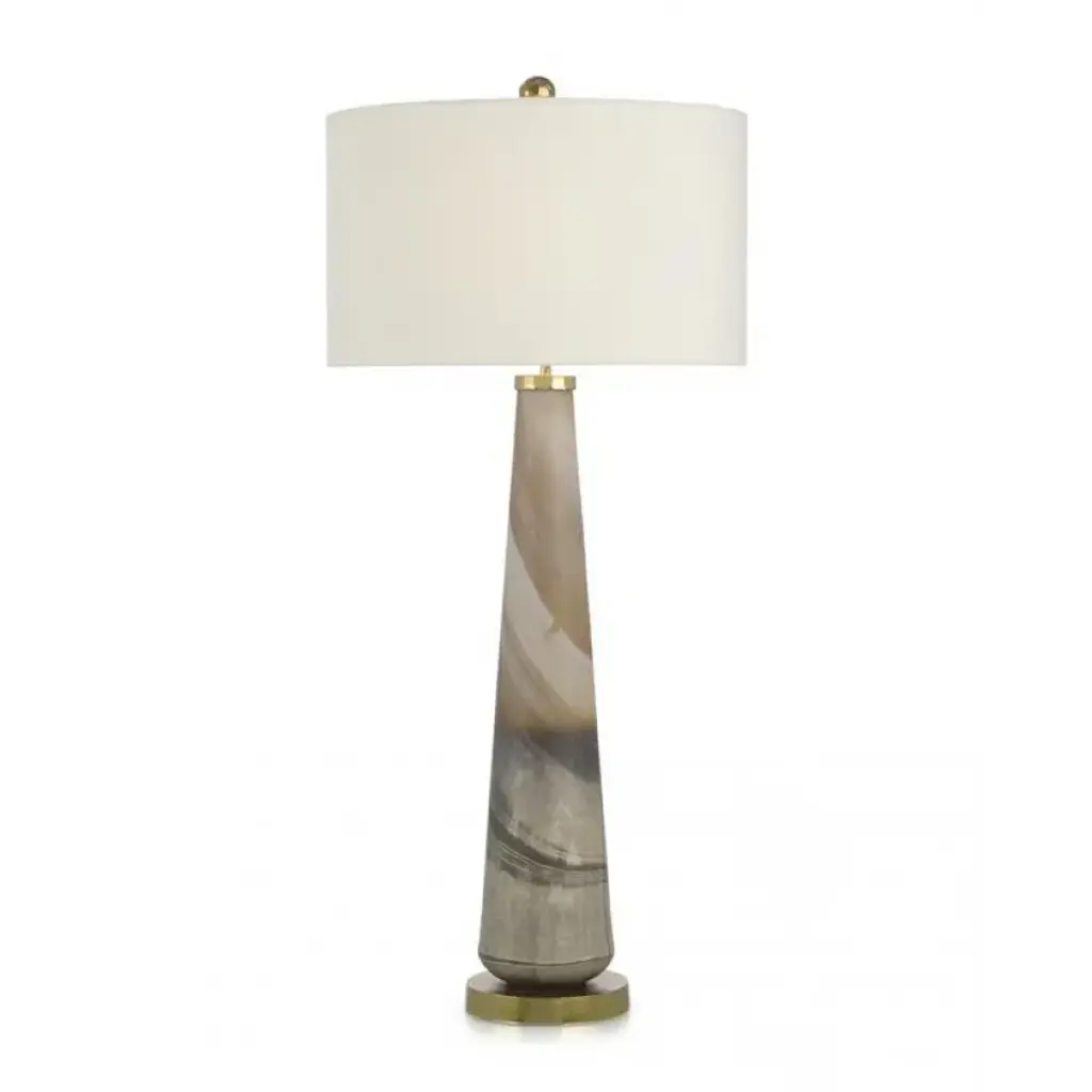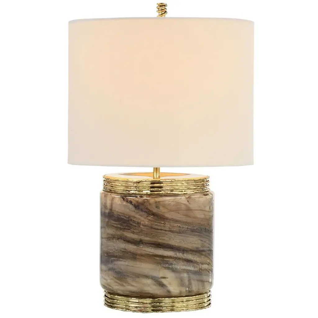 The Jovian Table Lamp is a gorgeous statement piece that commands attention within a space. Crafted from art glass, the piece showcases sweeping flourishes of brown, white, and blue. Strips of aluminum in a Light Gold finish create a gorgeous necklace, matching the circular base and ball finial.