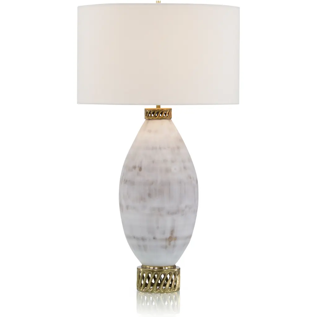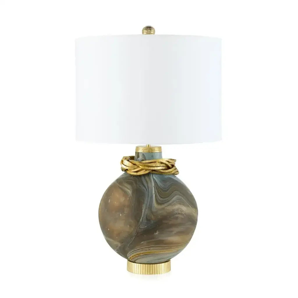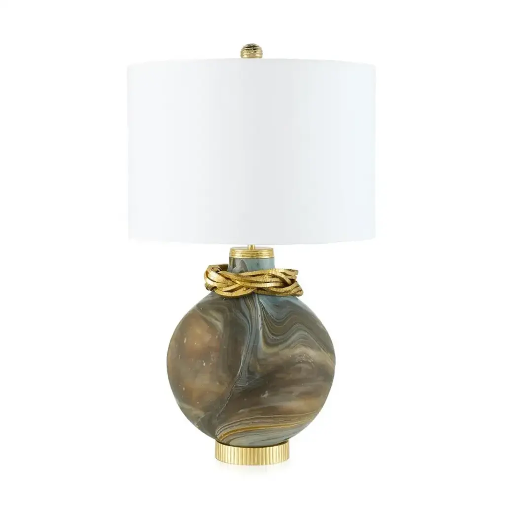 The Jovian Table Lamp is a gorgeous statement piece that commands attention within a space. Crafted from art glass, the piece showcases sweeping flourishes of brown, white, and blue. Strips of aluminum in a Light Gold finish create a gorgeous necklace, matching the circular base and ball finial.