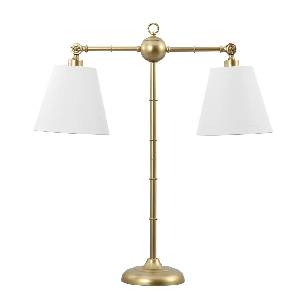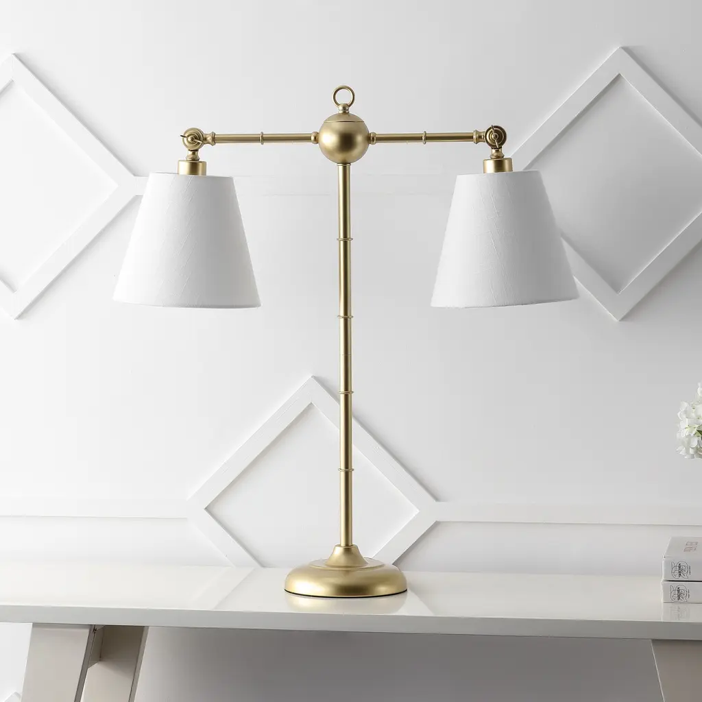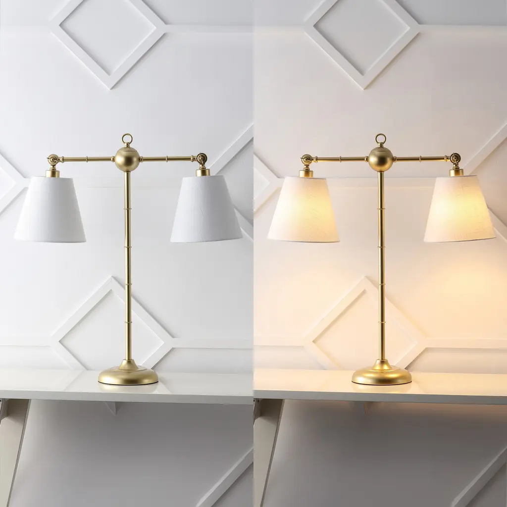 Like Lady Justice's scale, the two-light library light stands in perfect balance. Though instead of weighing support and opposition in equal measure, this table lamp balances two shaded bulbs, providing ample light to your law school reading or picture frames on a sideboard. At 31" high, the tall stature of this lamp would be excellent on an end table between two arm chairs, providing adequate light to both readers; on a desk, or above curios on a sideboard or buffet. Features:Dimensions:About us:You see a lamp.We see a decorative work of art.A perfectly curved shade casts a dramatic shadow on a floor. A silk cord you never want to hide. LED lightbulbs: as easy on the environment as they are on the eyes. The JONATHAN Y Lighting collection considers every detail from impeccably sourced materials to designer styling. And our prices are so attractive, we've transformed a functional necessity into a fashion accessory.JONATHAN Y Lighting - a fashion revolution in home decor.