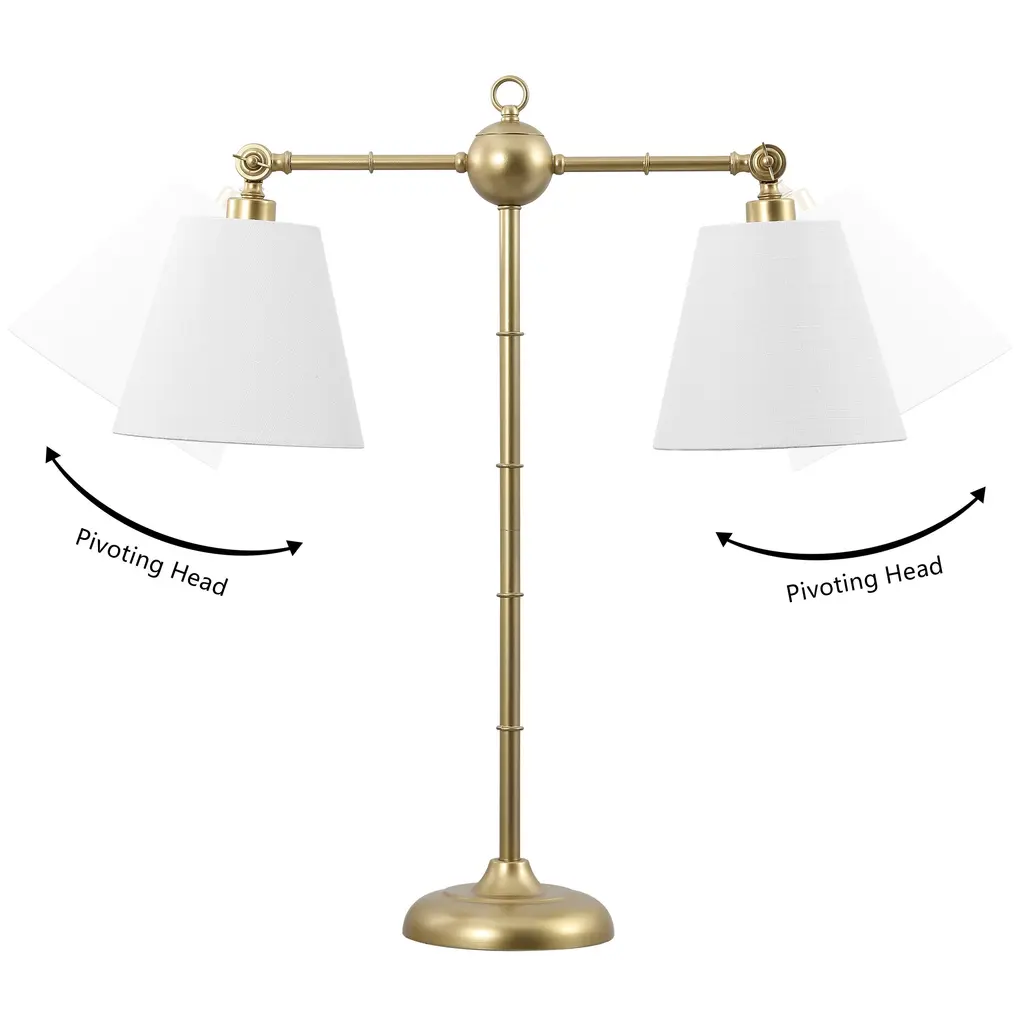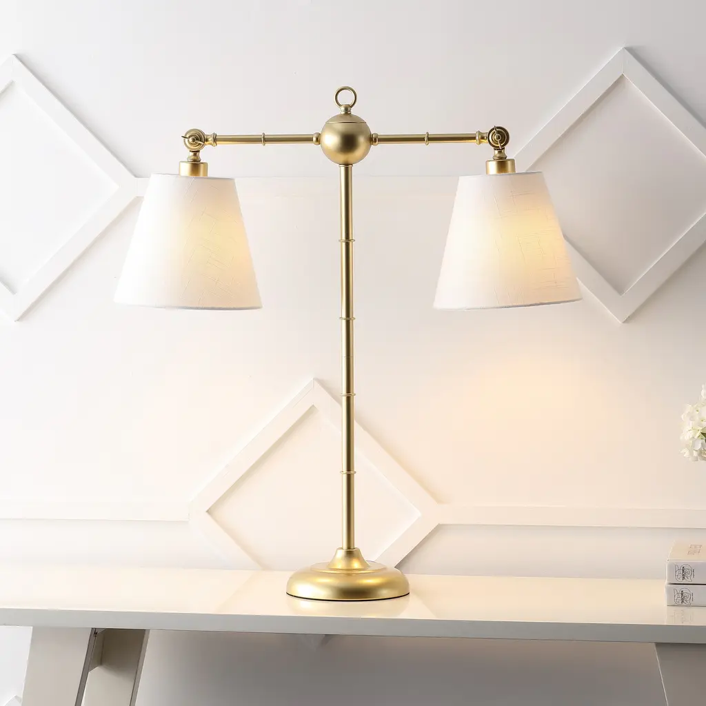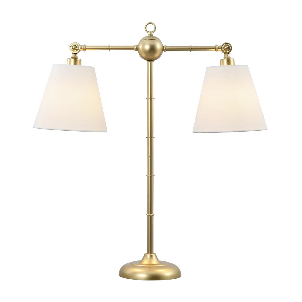 Like Lady Justice's scale, the two-light library light stands in perfect balance. Though instead of weighing support and opposition in equal measure, this table lamp balances two shaded bulbs, providing ample light to your law school reading or picture frames on a sideboard. At 31" high, the tall stature of this lamp would be excellent on an end table between two arm chairs, providing adequate light to both readers; on a desk, or above curios on a sideboard or buffet. Features:Dimensions:About us:You see a lamp.We see a decorative work of art.A perfectly curved shade casts a dramatic shadow on a floor. A silk cord you never want to hide. LED lightbulbs: as easy on the environment as they are on the eyes. The JONATHAN Y Lighting collection considers every detail from impeccably sourced materials to designer styling. And our prices are so attractive, we've transformed a functional necessity into a fashion accessory.JONATHAN Y Lighting - a fashion revolution in home decor.