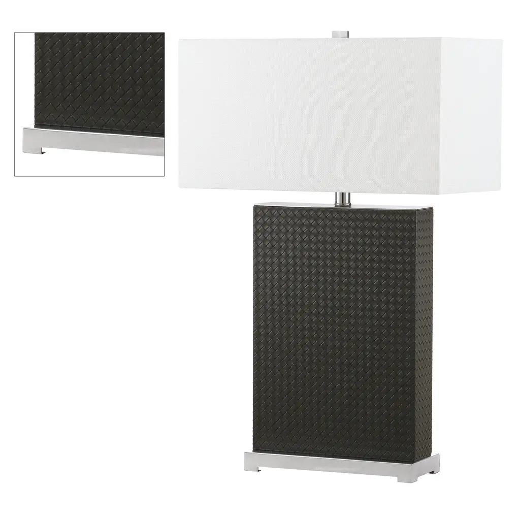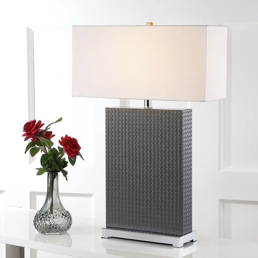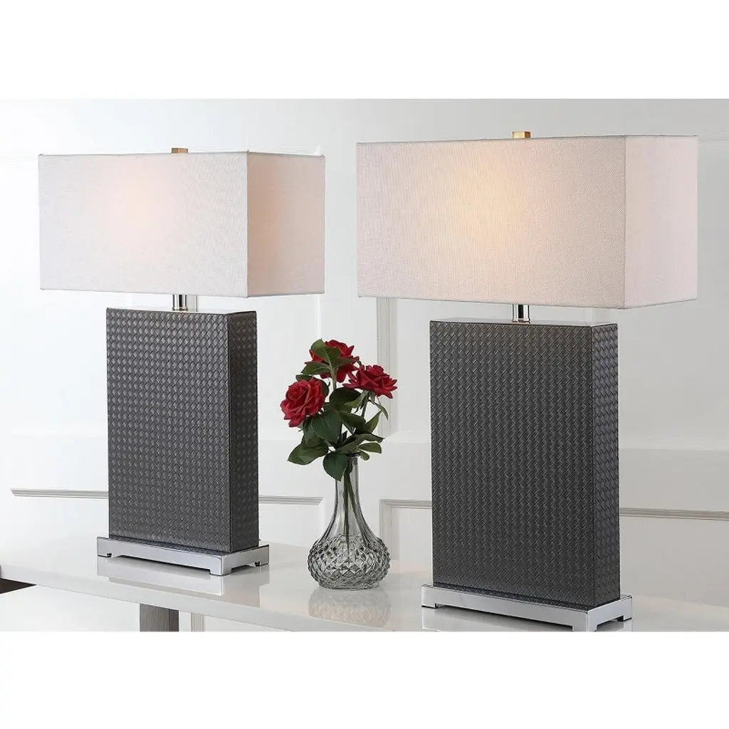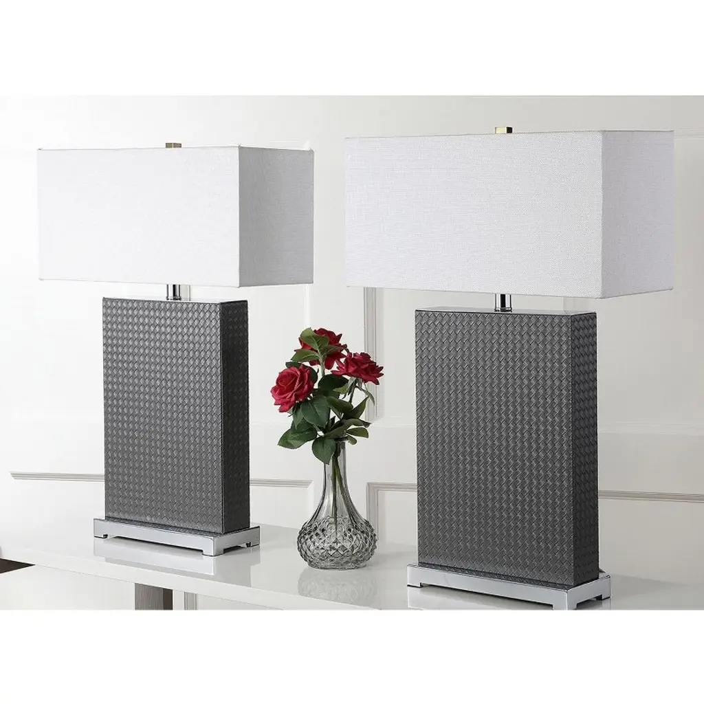 Introducing the Joyce table lamp set, where elegance meets functionality. These 27.75 inch lamps are crafted with woven pu leather and sturdy iron, offering a perfect blend of texture and strength. The grey woven finish adds a touch of sophistication to any room, complementing both contemporary and classic decor styles. Designed as a set of two, these lamps are ideal for flanking your sofa or bedside for balanced and harmonious lighting. The iron base provides stability while the woven detailing brings a chic aesthetic. Whether youre reading a book or hosting guests, the Joyce lamps create a warm and inviting atmosphere. Illuminate your space with style and make a statement with these beautifully crafted lamps. Transform your home lighting and bask in the ambient glow that these unique pieces provide.