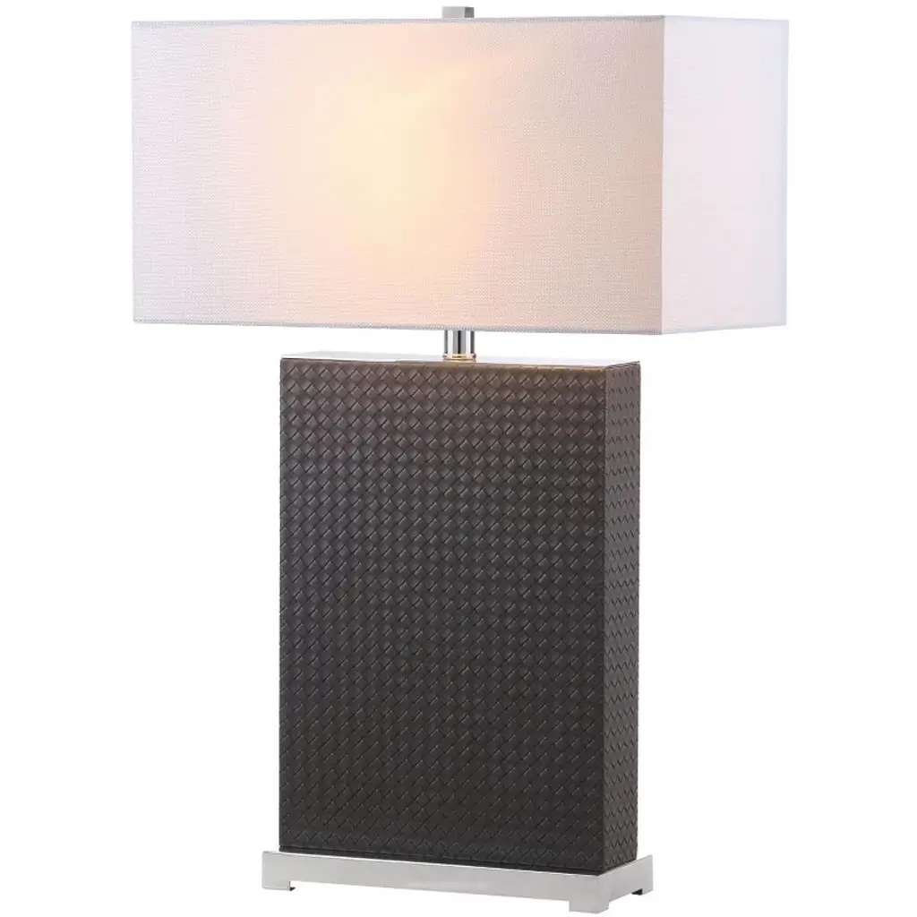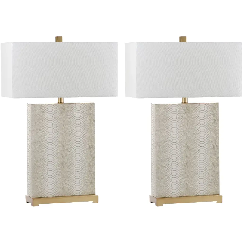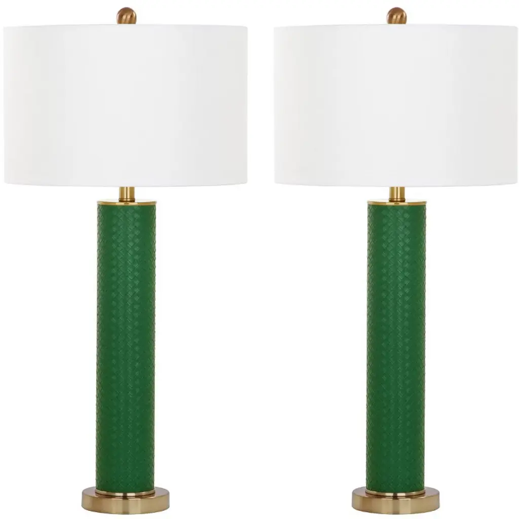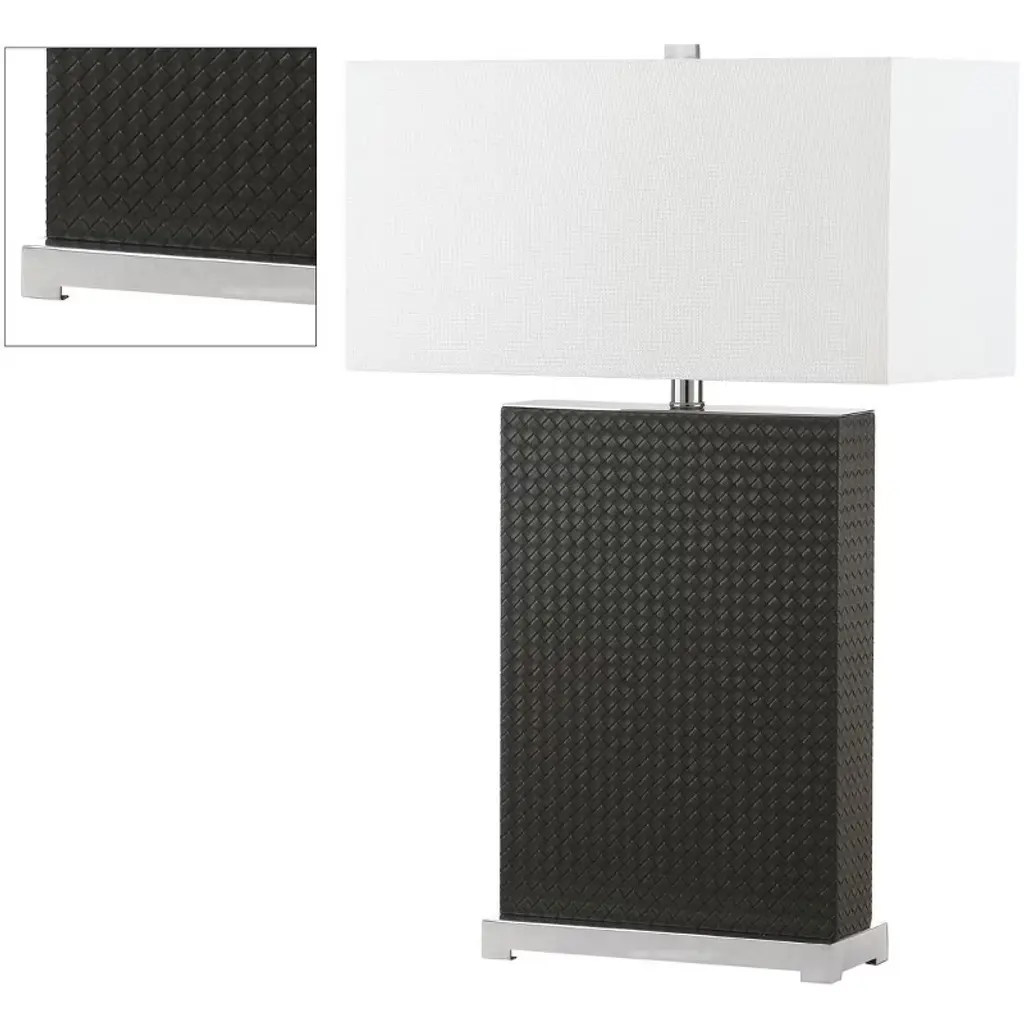 Introducing the Joyce table lamp set, where elegance meets functionality. These 27.75 inch lamps are crafted with woven pu leather and sturdy iron, offering a perfect blend of texture and strength. The grey woven finish adds a touch of sophistication to any room, complementing both contemporary and classic decor styles. Designed as a set of two, these lamps are ideal for flanking your sofa or bedside for balanced and harmonious lighting. The iron base provides stability while the woven detailing brings a chic aesthetic. Whether youre reading a book or hosting guests, the Joyce lamps create a warm and inviting atmosphere. Illuminate your space with style and make a statement with these beautifully crafted lamps. Transform your home lighting and bask in the ambient glow that these unique pieces provide.
