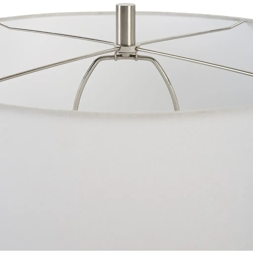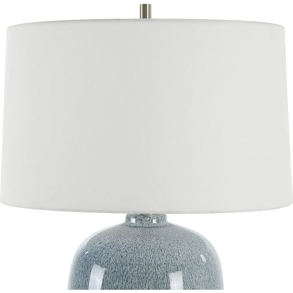 This Ceramic Table Lamp Features A Peaceful Sky Blue Glaze With Cobalt Mottled Details Paired With Plated Brushed Nickel Accents. The Round Hardback Shade Is Covered In A Crisp White Linen Fabric. Due To The Nature Of Fired Glazes On Ceramic Lamps, Finishes Will Vary Slightly.