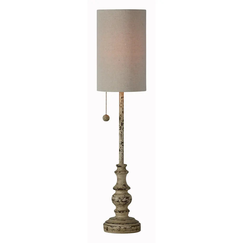 Slim enough to fit in those tight spaces that need some light, the handsome Jude buffet lamp sports a distressed beige and brown finish that packs a punch in a small space. Each resin lamp in this set of 2 stands 28 inches high and has an elongated hardback shade that attaches with an UNO fitting. The Jude has a pull chain switch and uses a maximum 40 watt bulb (not included). Features: