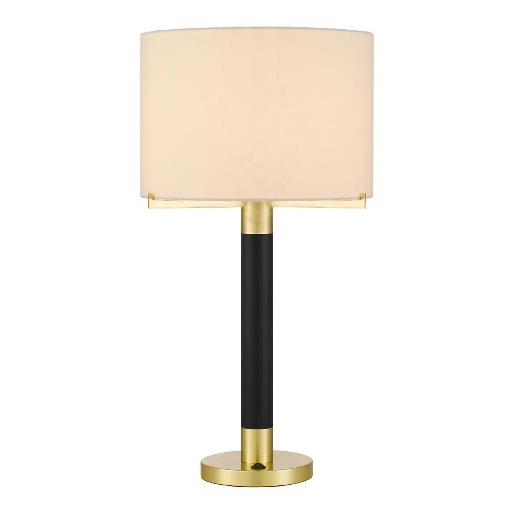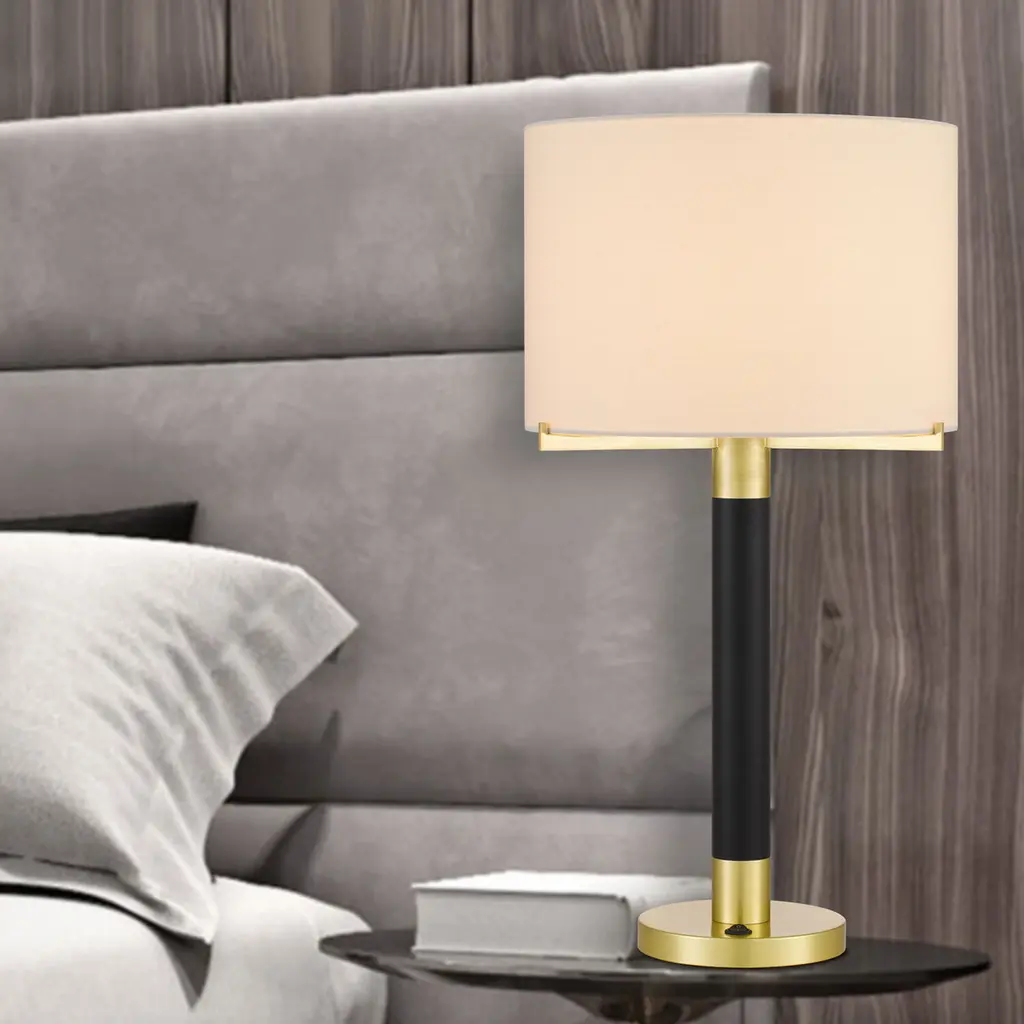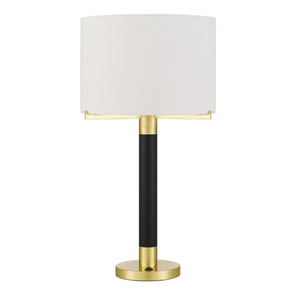 The Jules tabletop lamp is both modern decor and an inviting source of light that enhances any room in the home. This clean-lined lamp has mixed-metal appeal with an antique brass and matte-black base. Topped with a timeless white linen drum shade that diffuses light into a soft glow, it's a refined finishing touch for a nightstand, desk or end table.