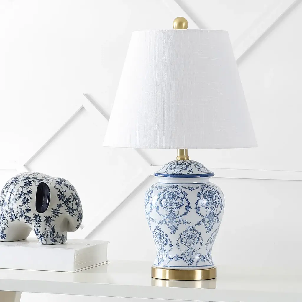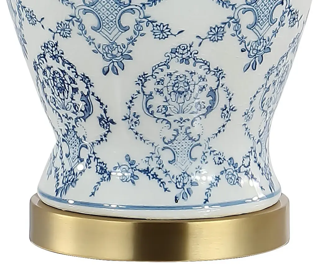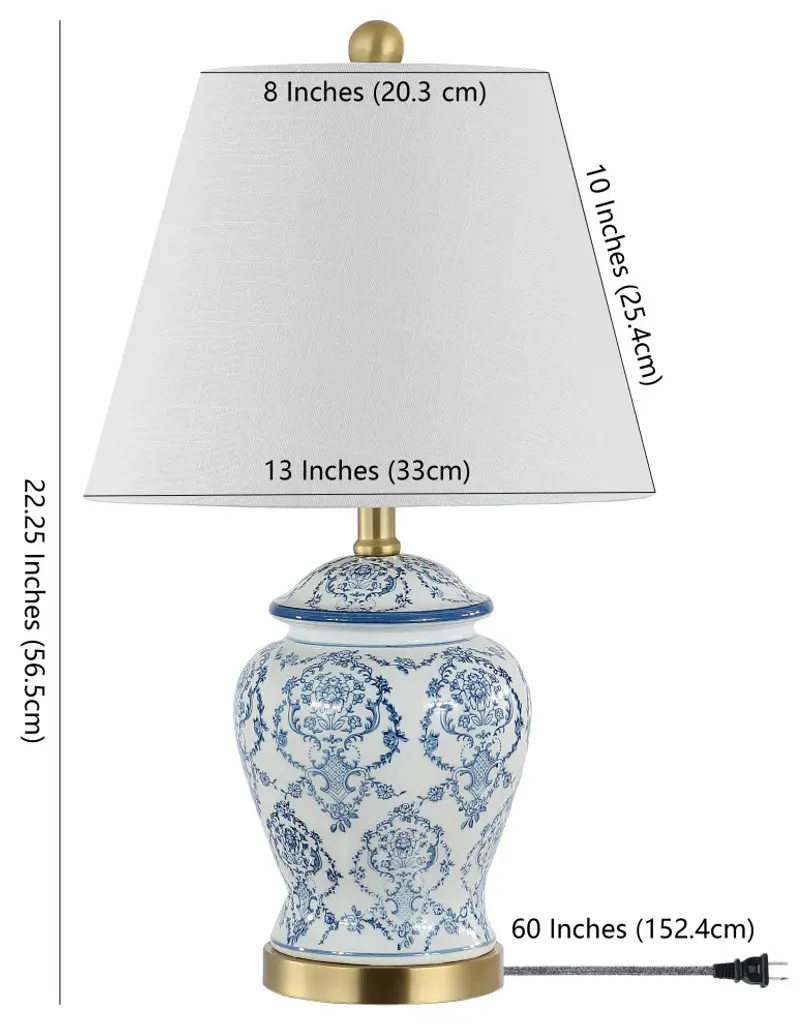 This table lamp adorned in a blue and white pattern brings home breathtaking details hand-painted on an elegant ceramic base. Shaped like an urn, this Asian-inspired design adds classic appeal that will enhance any decor. Finished with a tapered empire drum shade, the traditional design of this style is simultaneously modern.-The designer touches extend all the way to the plug - the 60" cord is silk-wrapped-The shade is made from 100% cotton-Takes 1 bulb and compatible with 9W LED or 60W TYPE "A" or 13W CFL-Eco-friendly 9W LED bulb included-Fixture can be dimmable with a dimmable bulb (not included) and Electric Low Voltage dimmer (sold separately)-Color Temperature: 2700K-CRI: 80-Color: Blue/White with white shade-Body Material: Ceramic-Base Material: Iron -Finial Material: Metal-Finial Color: Brass Gold-Harp Color: Brass Gold-Includes: One (1) lamp-Assembly Required-Lamp: 22.25 inches high x 13 inches wide x 13 inches deep-Shade: 10 inches high x 13 inches wide x 13 inches deepYou see a lamp.We see a decorative work of art.A perfectly curved shade casts a dramatic shadow on a floor. A silk cord you never want to hide. Compatible with LED lightbulbs: as easy on the environment as they are on the eyes. The JONATHAN Y Lighting collection considers every detail from impeccably sourced materials to designer styling. And our prices are so attractive, we''ve transformed a functional necessity into a fashion accessory.JONATHAN Y Lighting - a fashion revolution in home decor.