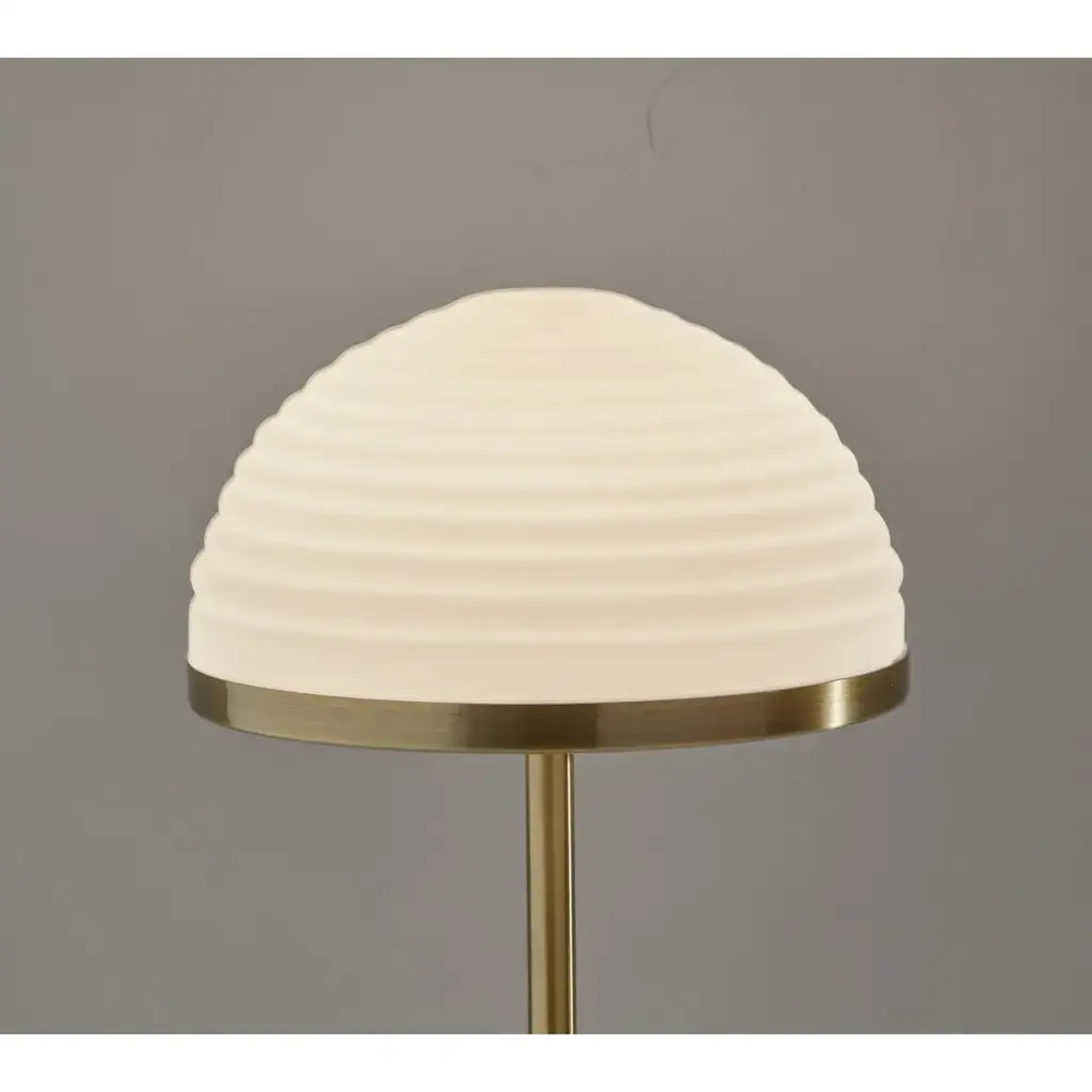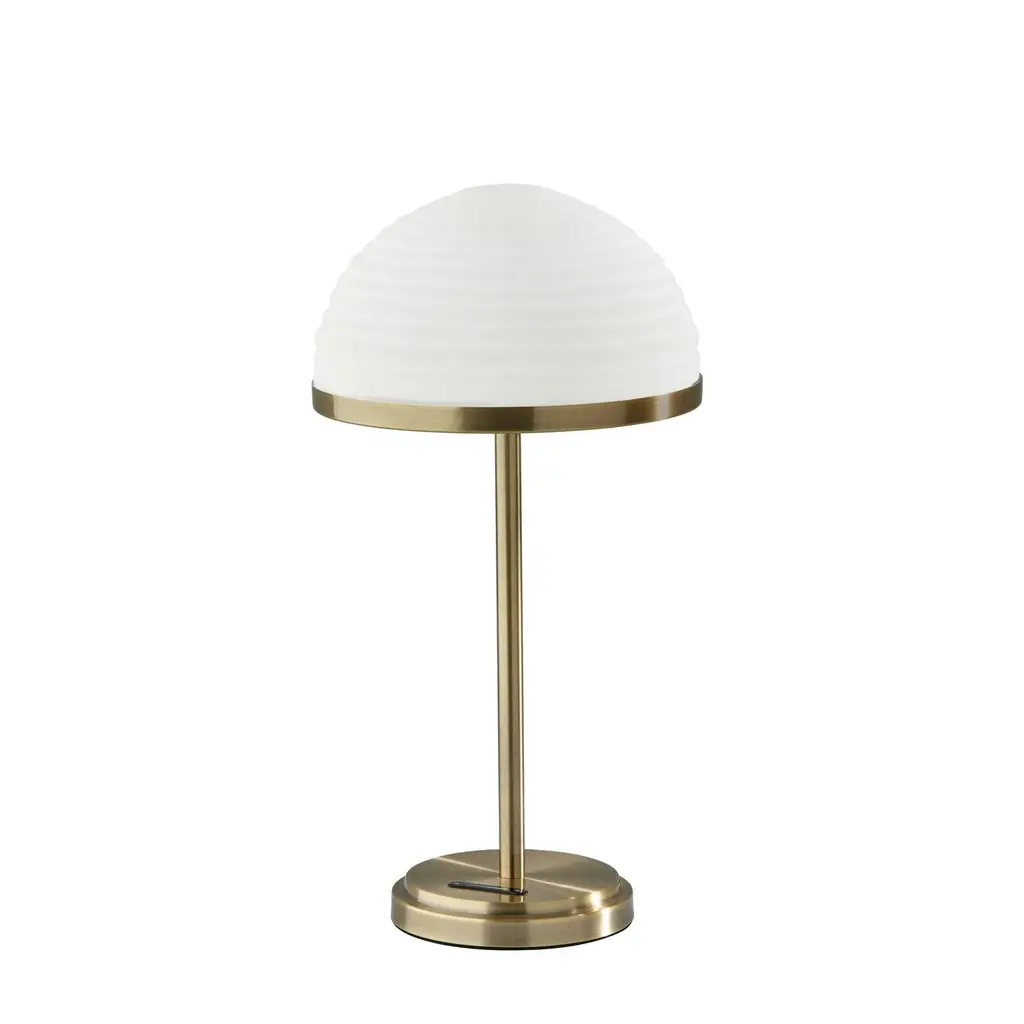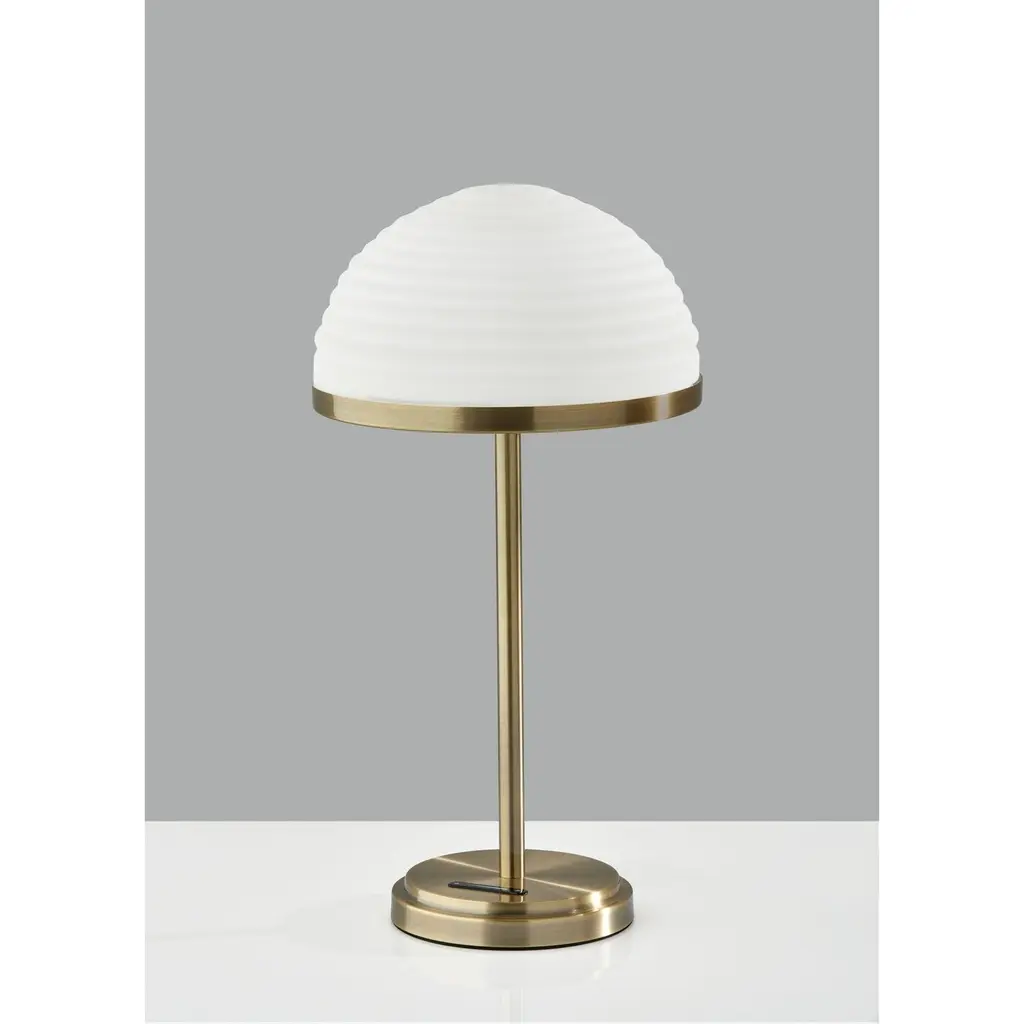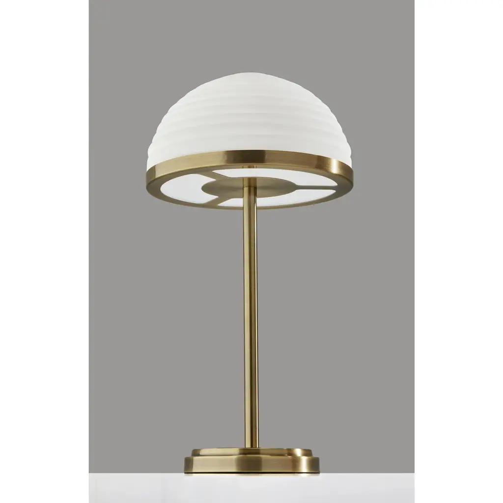 The Juliana LED table lamp brings versatile smart lighting and singularly stylish design to any space. The 21-inch tall lamp is crafted of antique brass with a slim and simple stem culminating in a furrowed, dome-shaped frosted glass shade. The stunning shade measures 11-inch in diameter and 6-inch high and houses an integrated 12W LED light that is economical and eco-friendly. Operated by a smart switch built into the round antique brass base, the Juliana table lamp provides highly versatile lighting at the touch of a finger. For optimum adjustability, the smart switch controls a full-range dimmer and 5 color temperature settings to match the LED brightness and temperature to your activity and the time of day. Complete your space's décor with the coordinating Juliana LED floor lamp. Features: