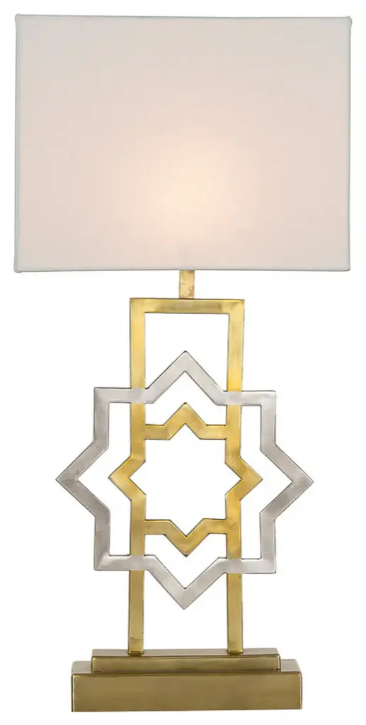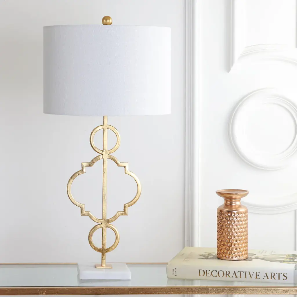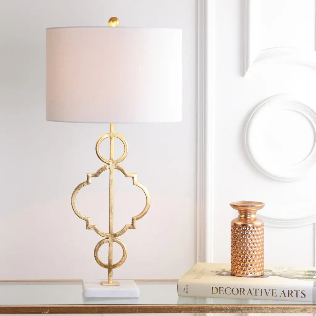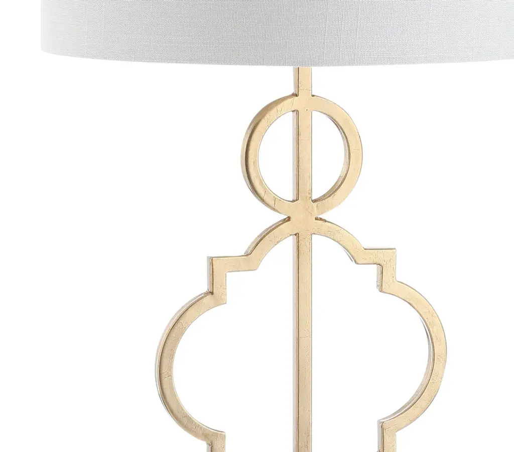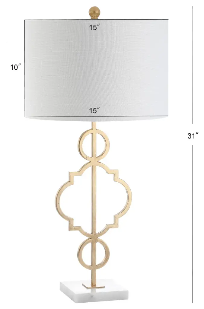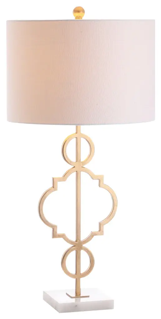 A quatrefoil motif gives this table lamp a bit of far-flung flair. The marble pedestal lends a contemporary edge while the gilded iron finish is a nod to the classics. Topped with a white linen drum shade, it works well with a variety of home dcor styles -- including your own! -A quatrefoil motif and marble base add far-flung flair to this functional piece -100% cotton hardback drum shade-60" silk cord with standard USA 2-prong plug -On-off switch on socket-Takes one maximum 100 watt or equivalent bulb -Eco-friendly 9W LED bulb included-UL Listed-Color: Gold/white marble base with white shade-Body Material: Metal-Base Material: Marble-Finial Material: Plastic-Finial Color: Gold Leaf-Harp Color: Gold-Includes: One (1) lamp(s)-Minor Assembly Required-Lamp: 31 inches high x 15 inches wide x 15 inches deep-Shade: 10 inches high x 15 inches wide x 15 inches deepYou see a lamp.We see a decorative work of art.A perfectly curved shade casts a dramatic shadow on a floor. A silk cord you never want to hide. LED lightbulbs: as easy on the environment as they are on the eyes. The JONTHAN Y Lighting collection considers every detail from impeccably sourced materials to designer styling. And our prices are so attractive, we''ve transformed a functional necessity into a fashion accessory.JONATHAN Y Lighting a fashion revolution in home decor.