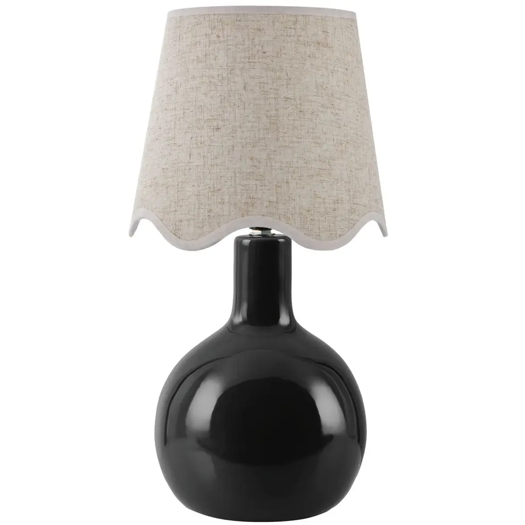 Ash June Contemporary Accent LampFeaturesNumber of bulb: 1Bulb type: AMax wattage: 150WVoltage: 120VSocket: Medium Keyless Threaded Alum Sheet E26Switch: Full Range DimmerSwitch location: Line SwitchFinish: Ash Glazed CeramicShade: Buff Linen ShadeCord color: SilverUL listed: DryDimensionsShade dimensions: 9 inches top x 14 inches bottom x 13.5 inches down sideBase dimensions: 10.88 inches height x 5.5 inches width x 5.5 inches depth