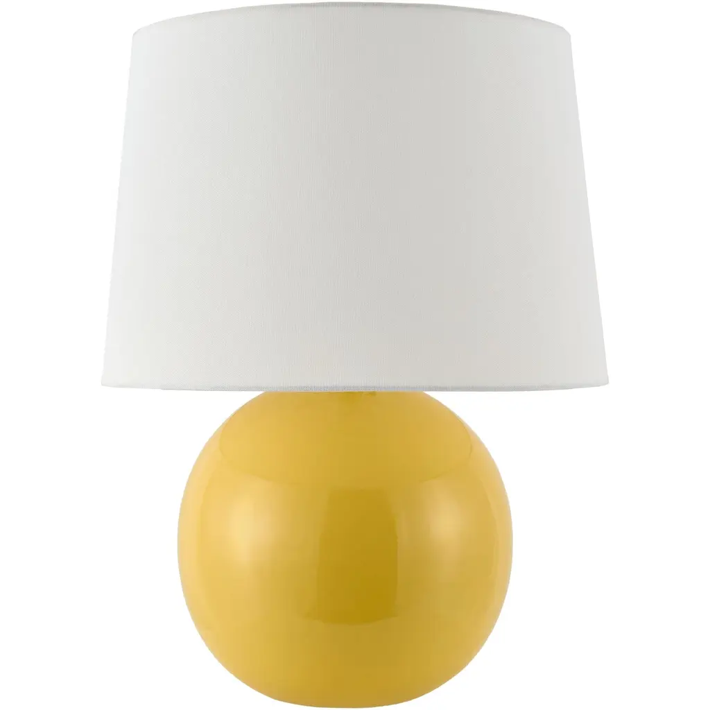 Sunset June Contemporary Accent LampFeaturesNumber of bulb: 1Bulb type: AMax wattage: 150WVoltage: 120VSocket: Medium Keyless Threaded Alum Sheet E26Switch: Full Range DimmerSwitch location: Line SwitchFinish: Sunset Yellow Glazed CeramicShade: Oyster Linen ShadeCord color: SilverUL listed: DryDimensionsShade dimensions: 9 inches top x 14 inches bottom x 13.5 inches down sideBase dimensions: 10.88 inches height x 5.5 inches width x 5.5 inches depth