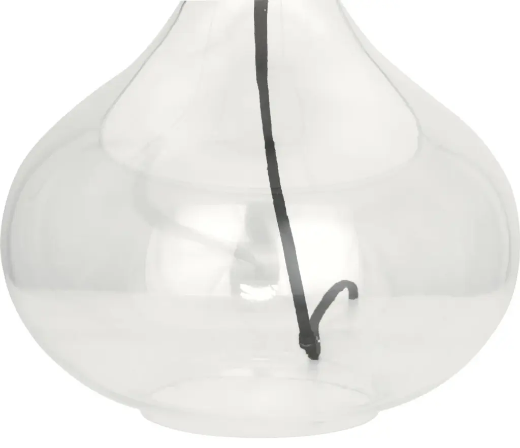 Clear June Contemporary Table LampFeaturesNumber of bulb: 1Bulb type: AMax wattage: 150WVoltage: 120VSocket: Medium Cast Threaded E26Switch: Full Range DimmerSwitch location: Line SwitchFinish: Clear Glass Body with Black Fabric Wrapped CordShade: White Organza Fabric ShadeCord color: Black Fabric WrappedUL listed: DryDimensionsShade dimensions: 13 inches top x 18 inches bottom x 16.5 inches down sideBase dimensions: 15.75 inches height x 7.75 inches width x 7.75 inches depth