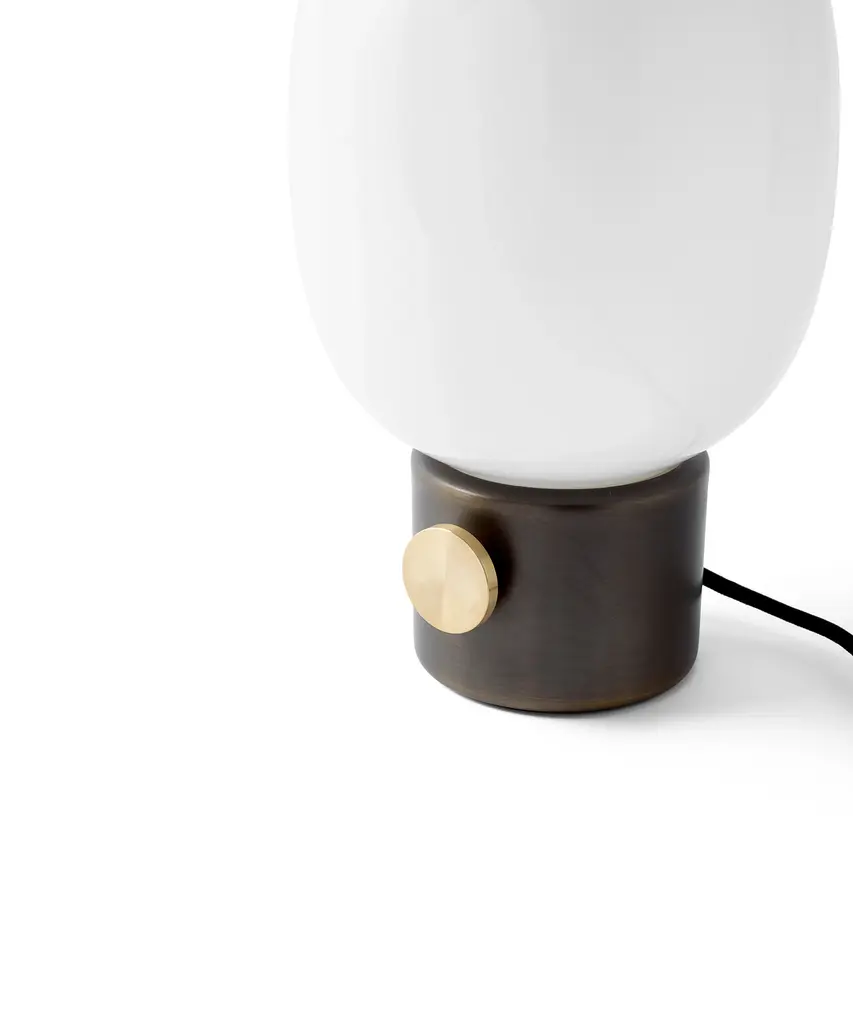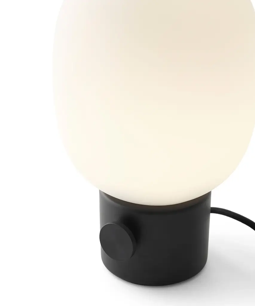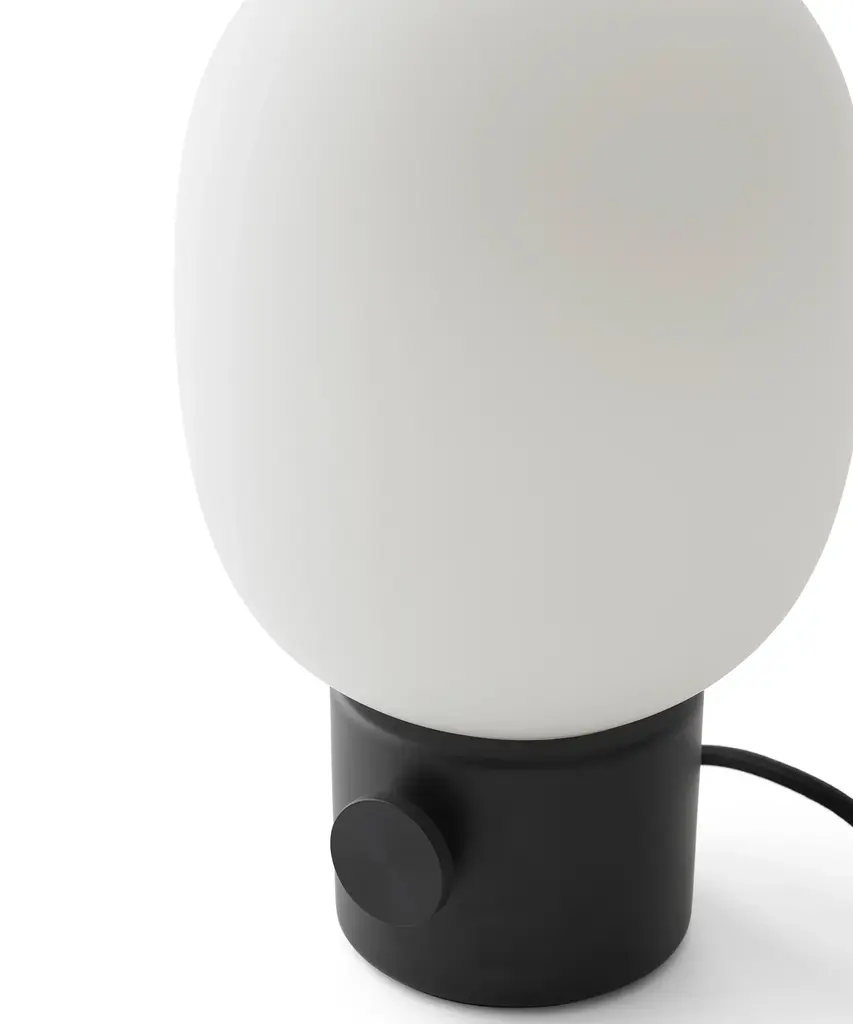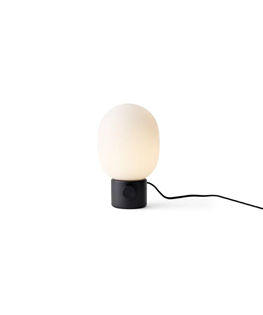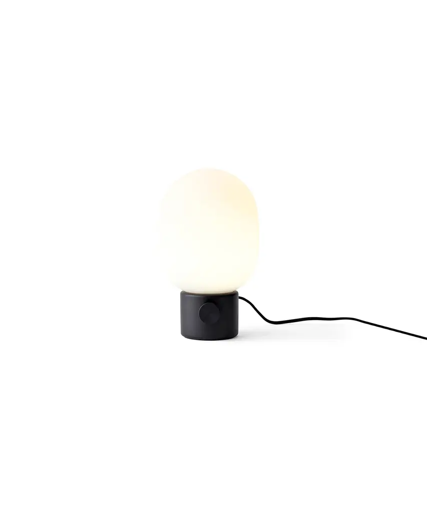 Add a touch of warmth to any space with this modern lighting fixture reminiscent of oil lamps.The JWDA Black Table Lamp has a smooth powder coated base and a matte opal glass shade. The circular knob functions as both switch and dimmer making this lamp a beautiful and functional addition to any desk or table.Designed by Jonas Wagnell for Danish design company Audo Copenhagen.
