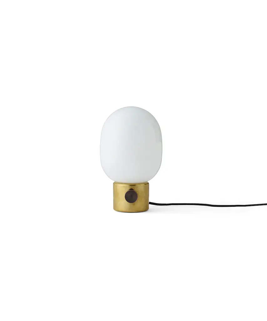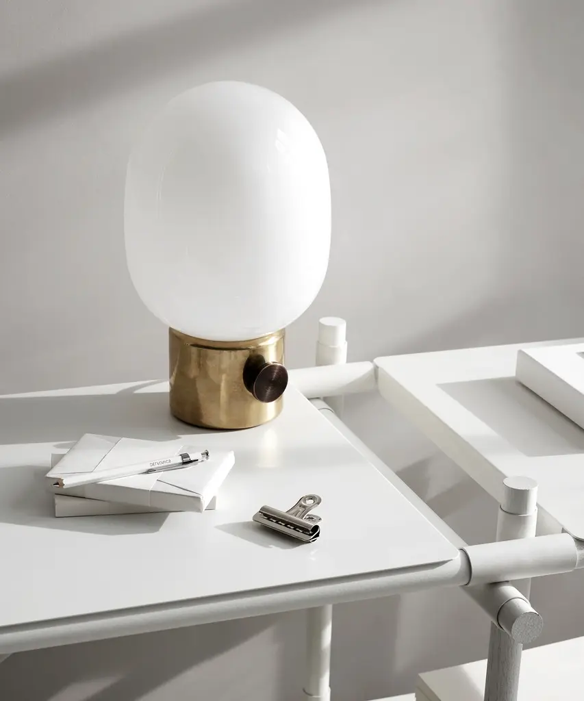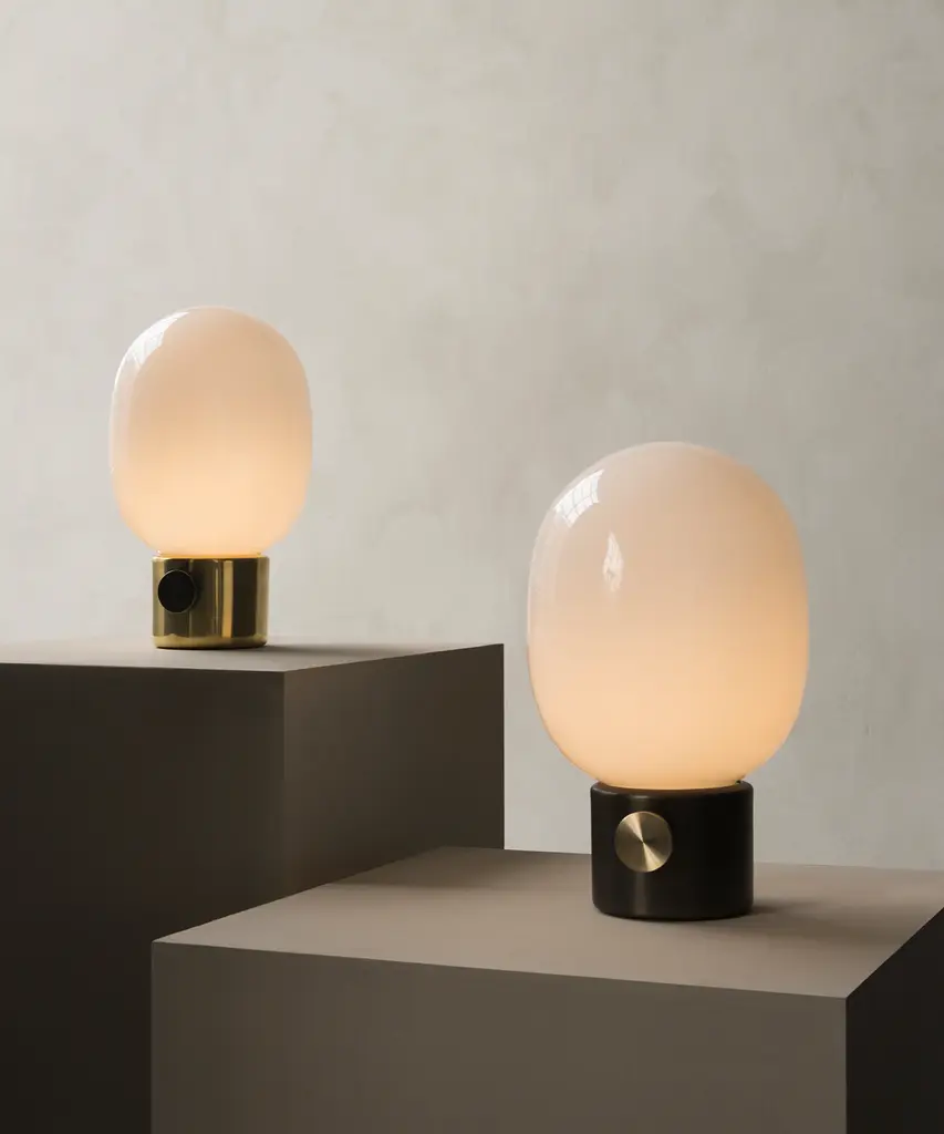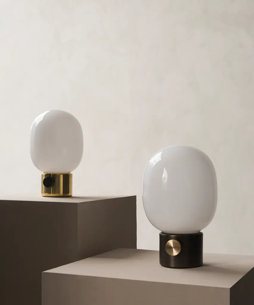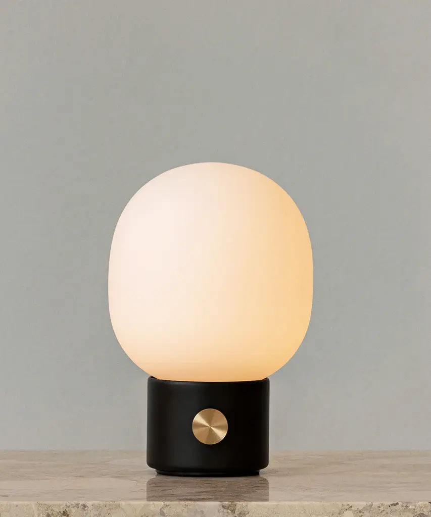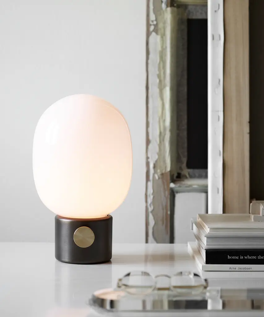 Add a touch of warmth to any space with this modern lighting fixture reminiscent of oil lamps.The JWDA Black Table Lamp has a smooth powder coated base and a matte opal glass shade. The circular knob functions as both switch and dimmer making this lamp a beautiful and functional addition to any desk or table.Designed by Jonas Wagnell for Danish design company Audo Copenhagen.