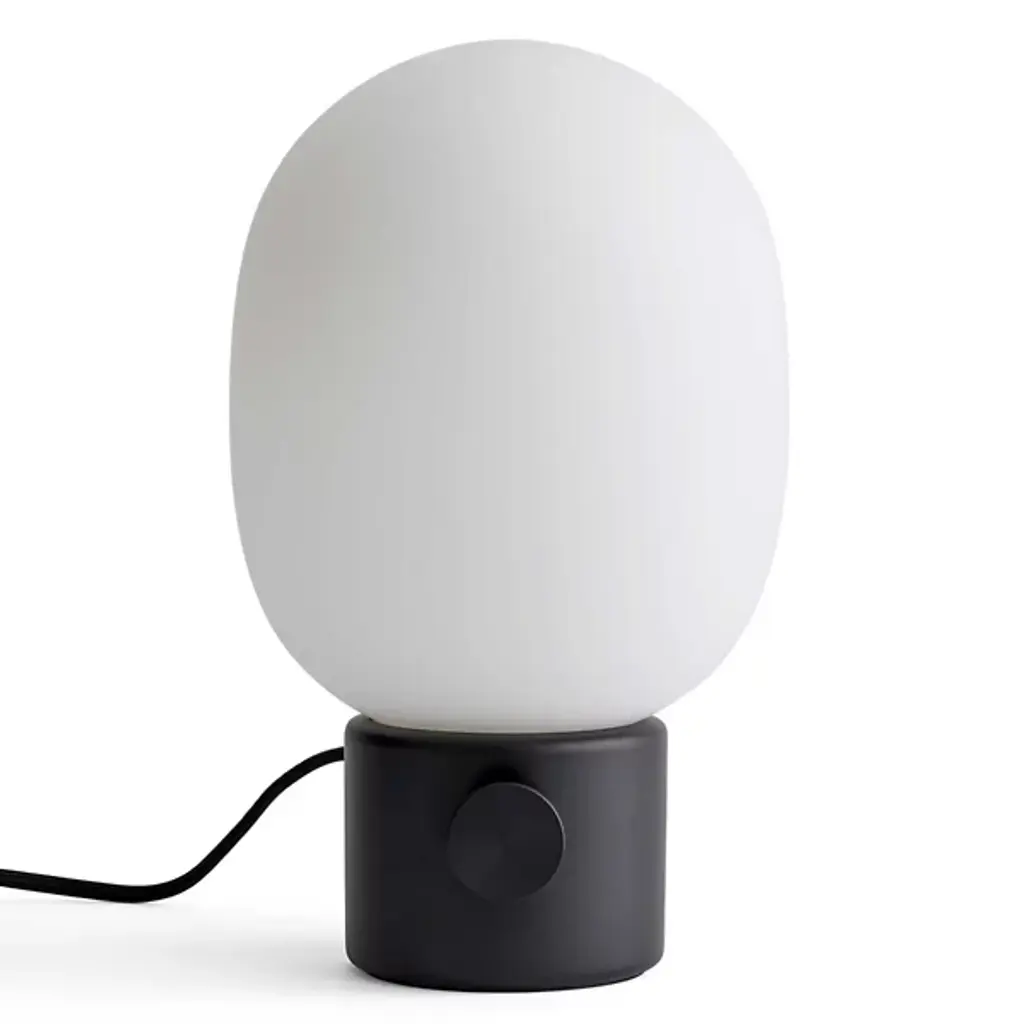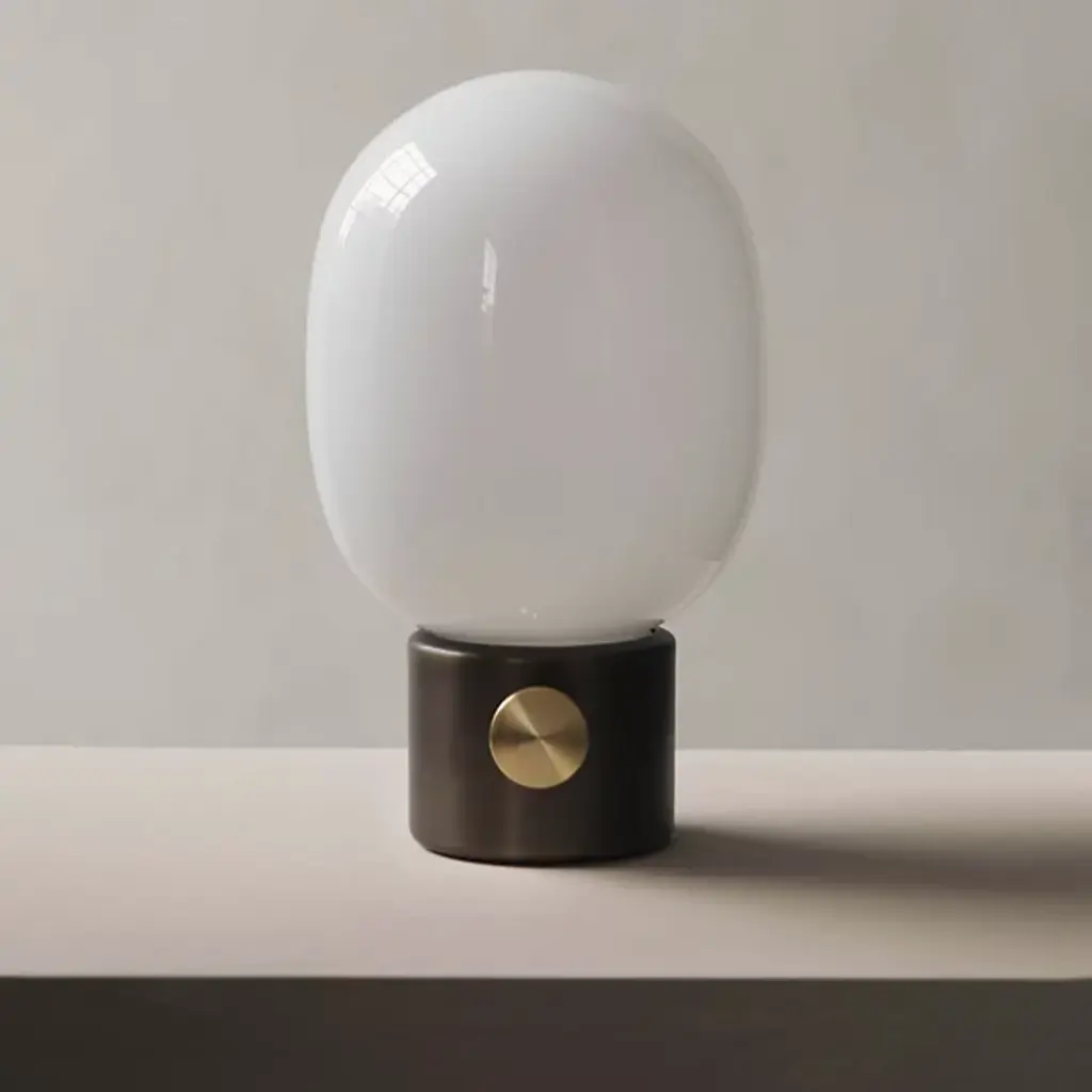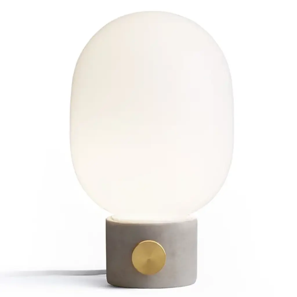 The JWDA Table Lamp from Audo Copenhagen, formerly known as Menu, exhibits a softer side to the roughness of industrial materials, smoothing rough material into a cylindrical base that supports a rounded glass diffuser. The white glass is delicately cradled within the base and glows warmly once lit like a large lightbulb. A stylish brass rotary switch buttons the collar of the rounded base, acting as a dimmer that can control the amount of ambient light from the fixture.