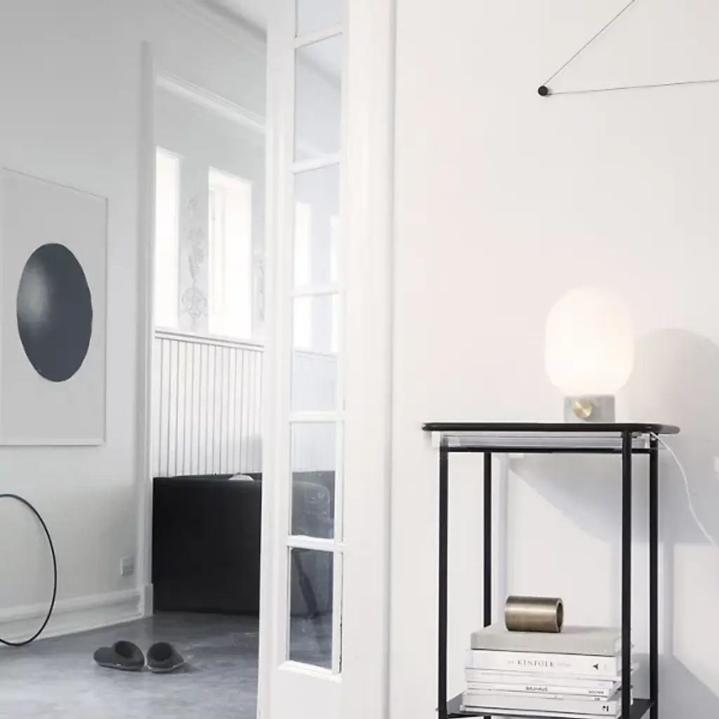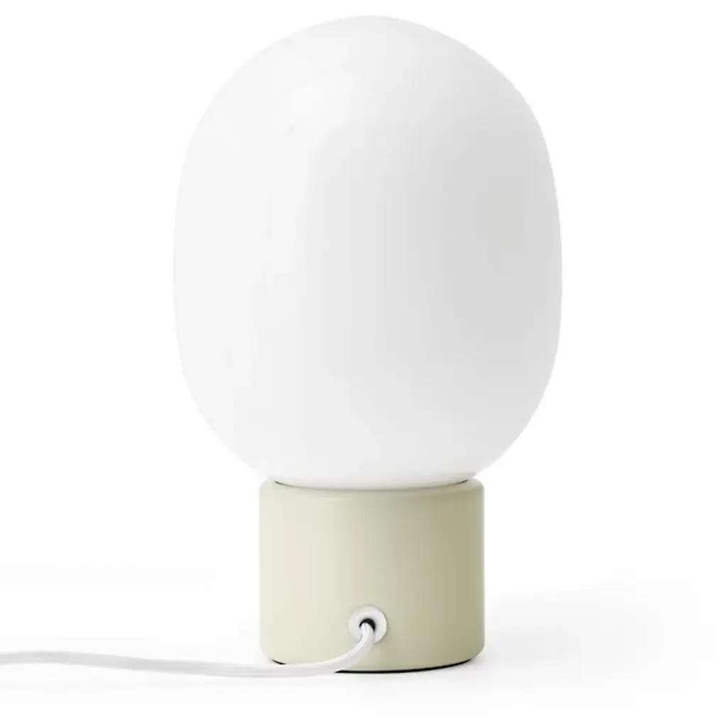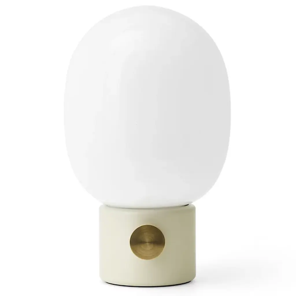 The JWDA Table Lamp from Audo Copenhagen, formerly known as Menu, exhibits a softer side to the roughness of industrial materials, smoothing rough material into a cylindrical base that supports a rounded glass diffuser. The white glass is delicately cradled within the base and glows warmly once lit like a large lightbulb. A stylish brass rotary switch buttons the collar of the rounded base, acting as a dimmer that can control the amount of ambient light from the fixture.