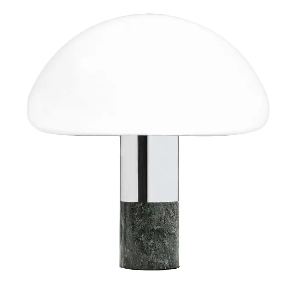 Original in its phytomorphic inspiration as it is luxurious in its combination of precious materials, this table lamp effortlessly synthesizes nature and geometry. Prized red marble and glossy brass cylinders trace the luxurious base, which sustains an opaline Murano glass shade playfully reminiscent of a mushroom's cap. Bulbs (3x E14 - 30W) are not included. Please contact the Concierge for customization inquiries.