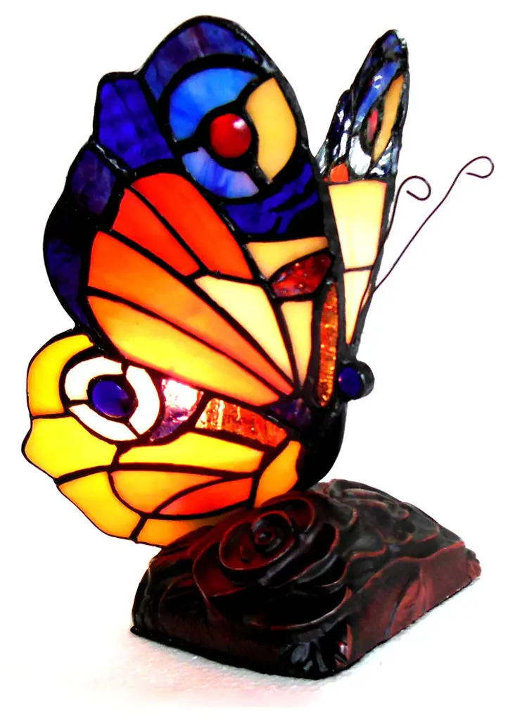This Tiffany style butterfly design accent lamp contains hand cut pieces of stained glass with bronze finish base and will compliment many decors throughout your home. (1) 25 Watt max E12 Type C Bulb (not included) On-cord rotary switch75pcs glass cut, 7 beadsUplightIndoor SettingSince these are hand crafted products, the exact color of glass pieces may vary. Colors of the glass will appear darker and less vibrant when not illuminated. Handmade glass will vary from one piece to the other; glass made at different times will also vary. Light bulbs used in lamps or ambient lighting may affect the appearance of the products. Stained glass product has been protected with mineral oil as part of the finishing process. Please use a soft dry cloth to remove any excess oil.