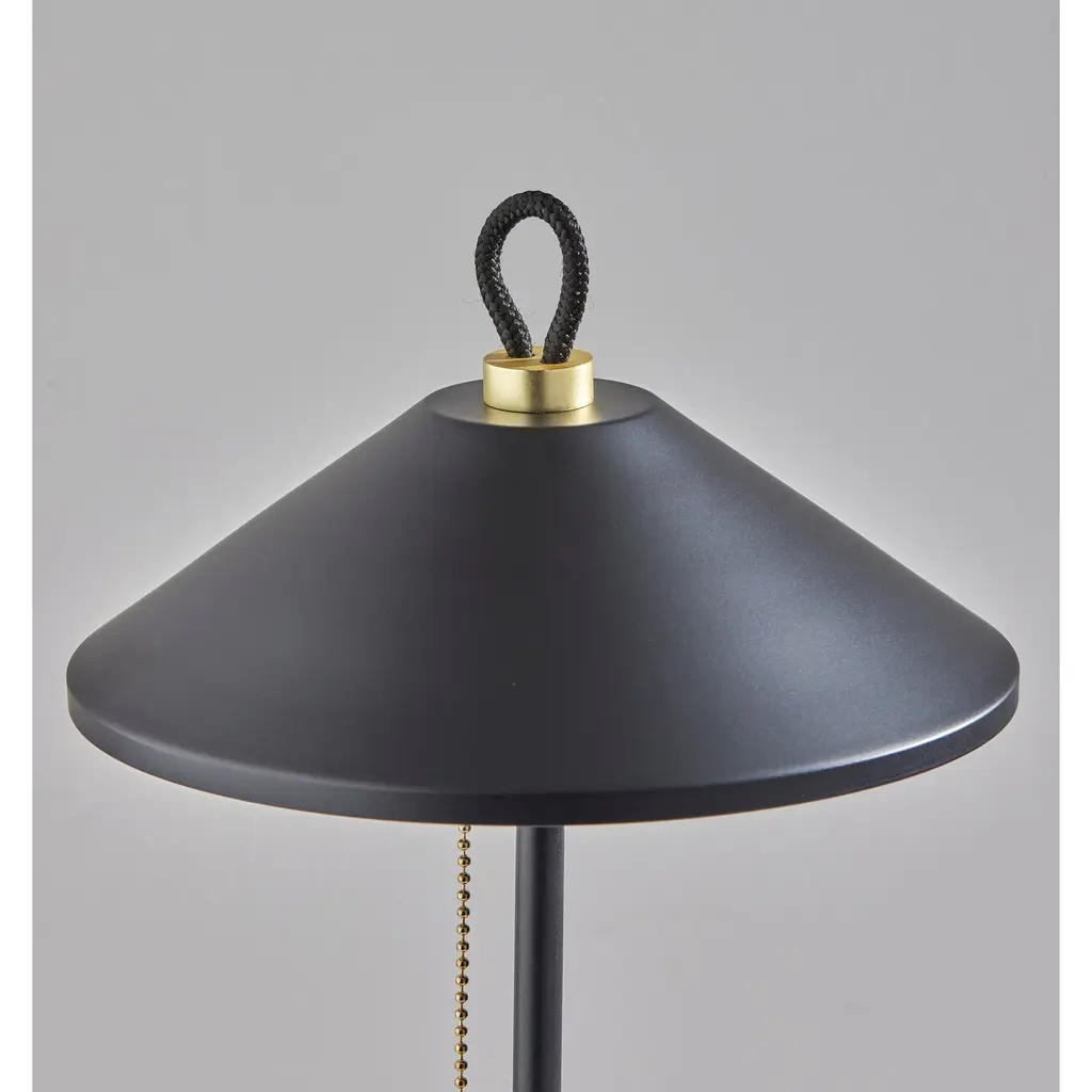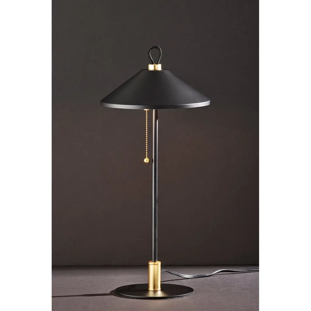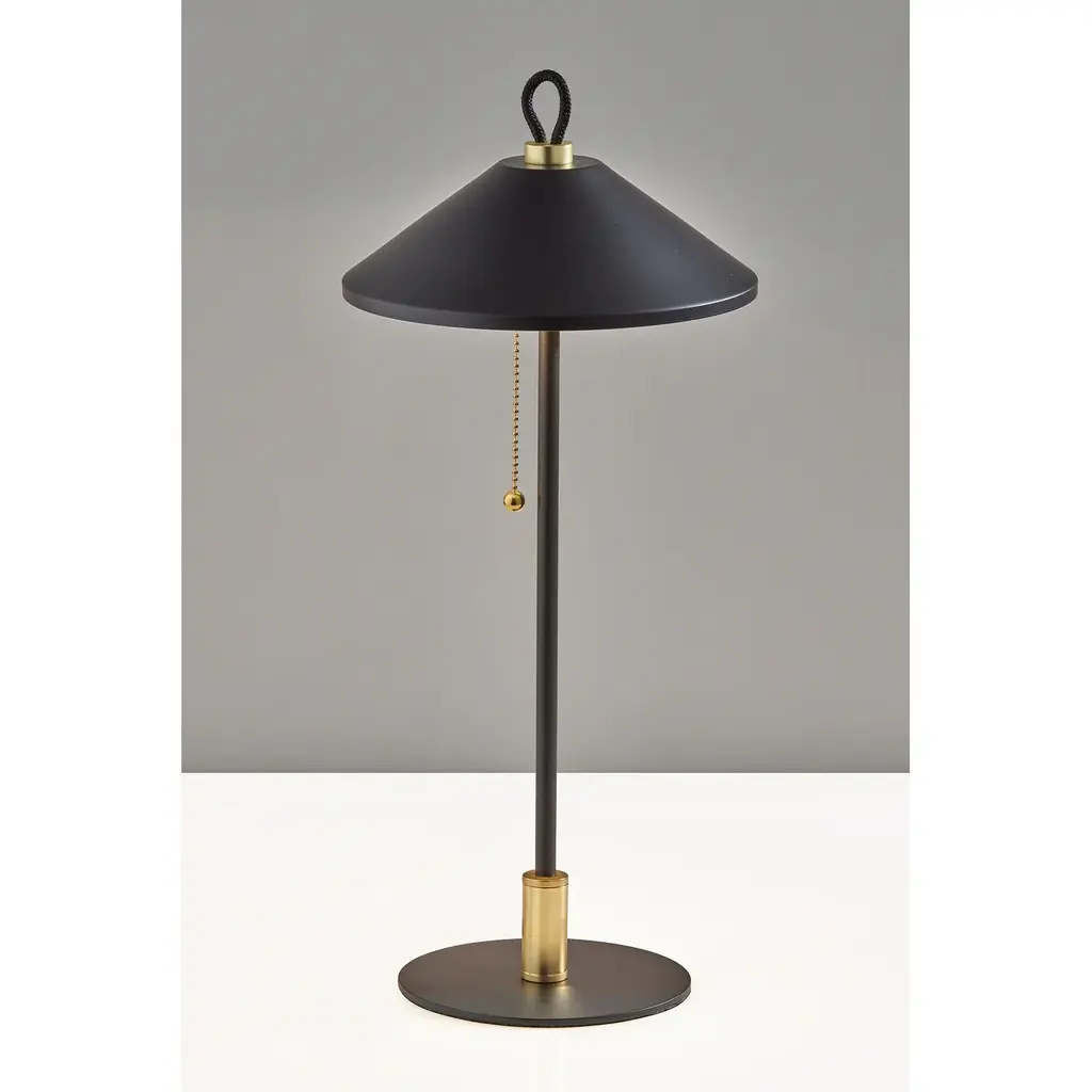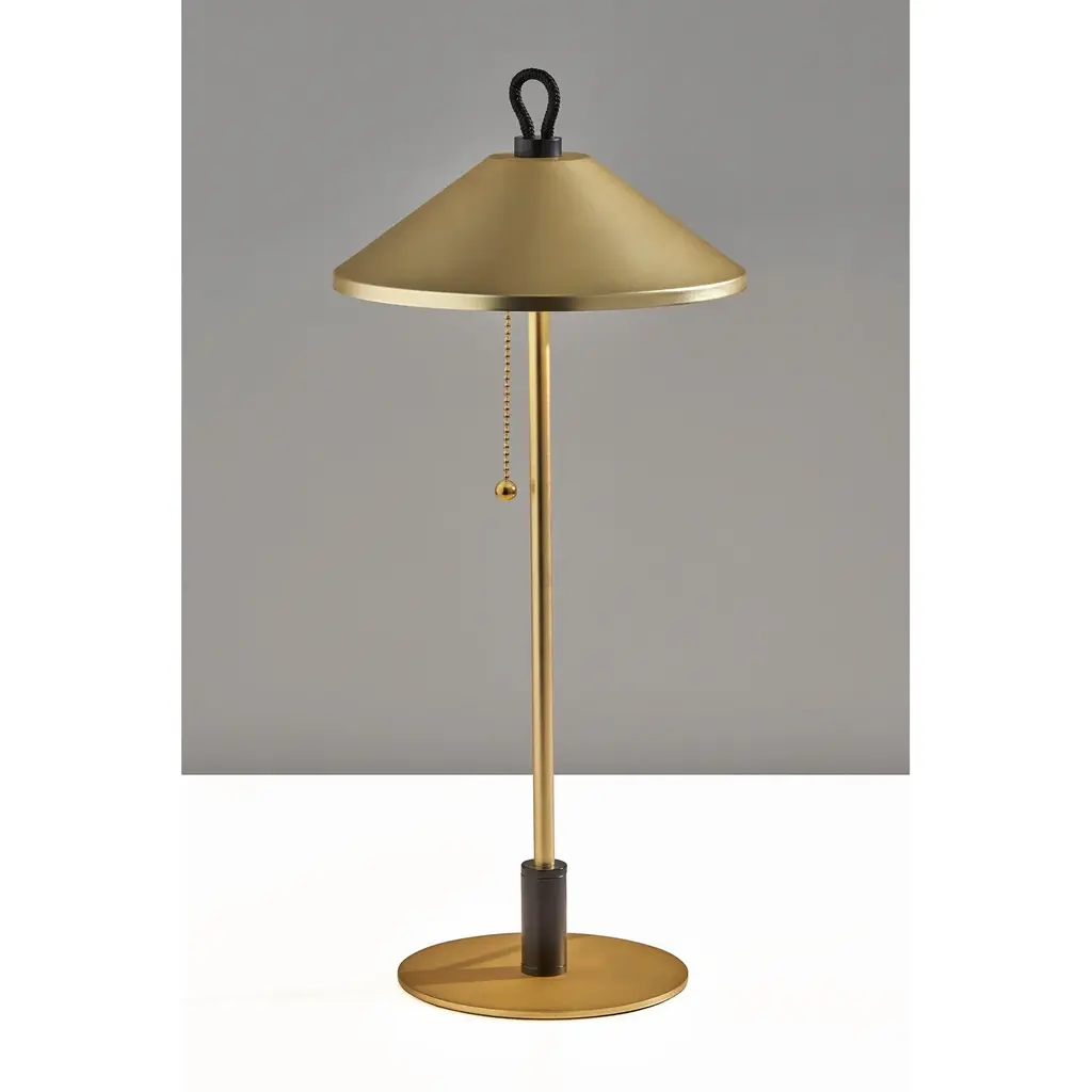 In classic form, the Kaden table lamp's mixed metal finish and elegant design adds a polished accent to your space. Featuring a slim round base, thin pole and tapered conical shade, the dual-metal design is crafted of black or brass metal with beautifully contrasting accents. Two 5W replaceable LED bulbs are included and illuminate your room with 450 lumens of warm light. A pull-chain switch in brass finish easily turns the light on or off, while the lamp is powered by a black fabric-covered cord. The Kaden table lamp is also available with a brass finish and black metal accents. Complete your décor with the coordinating Kaden floor lamp.