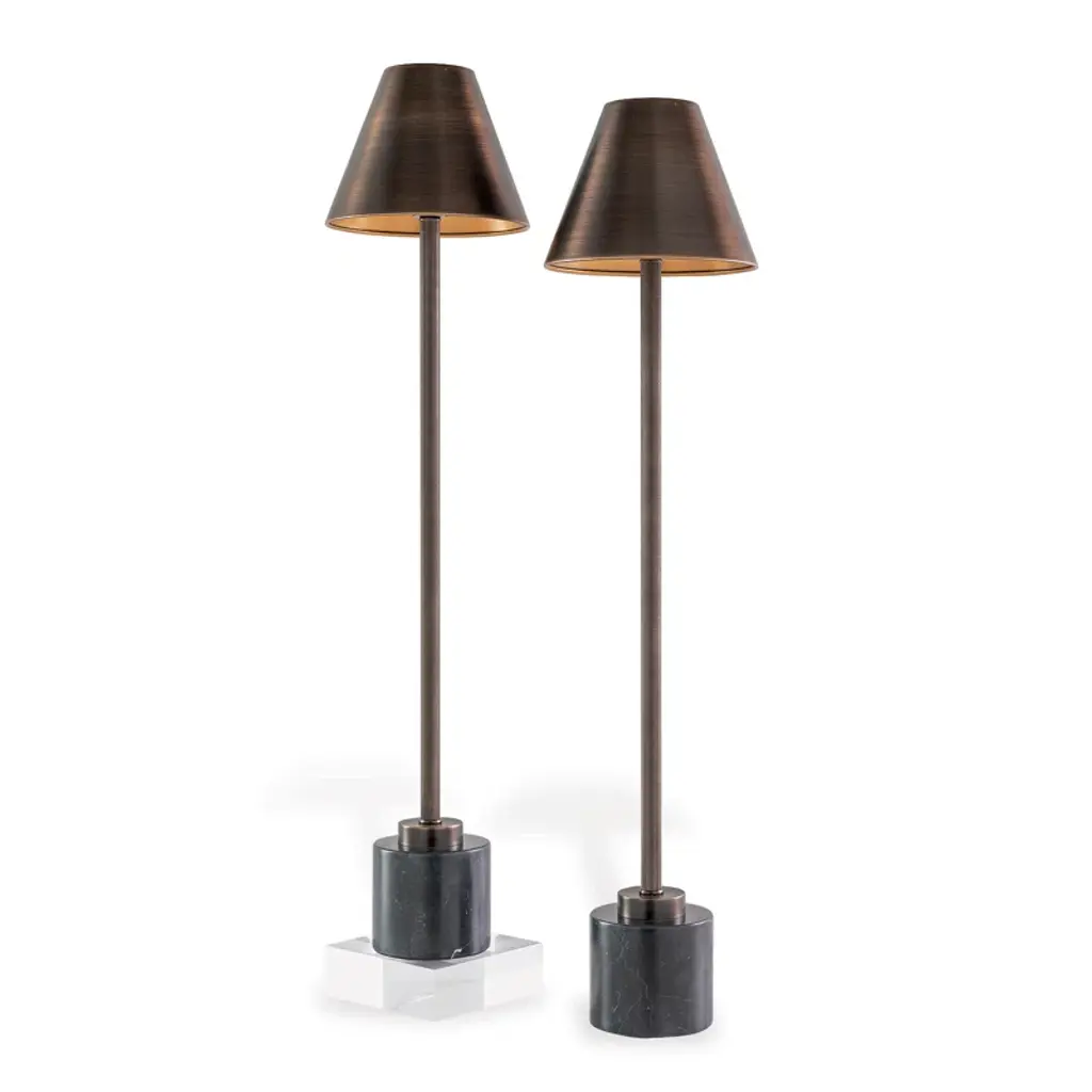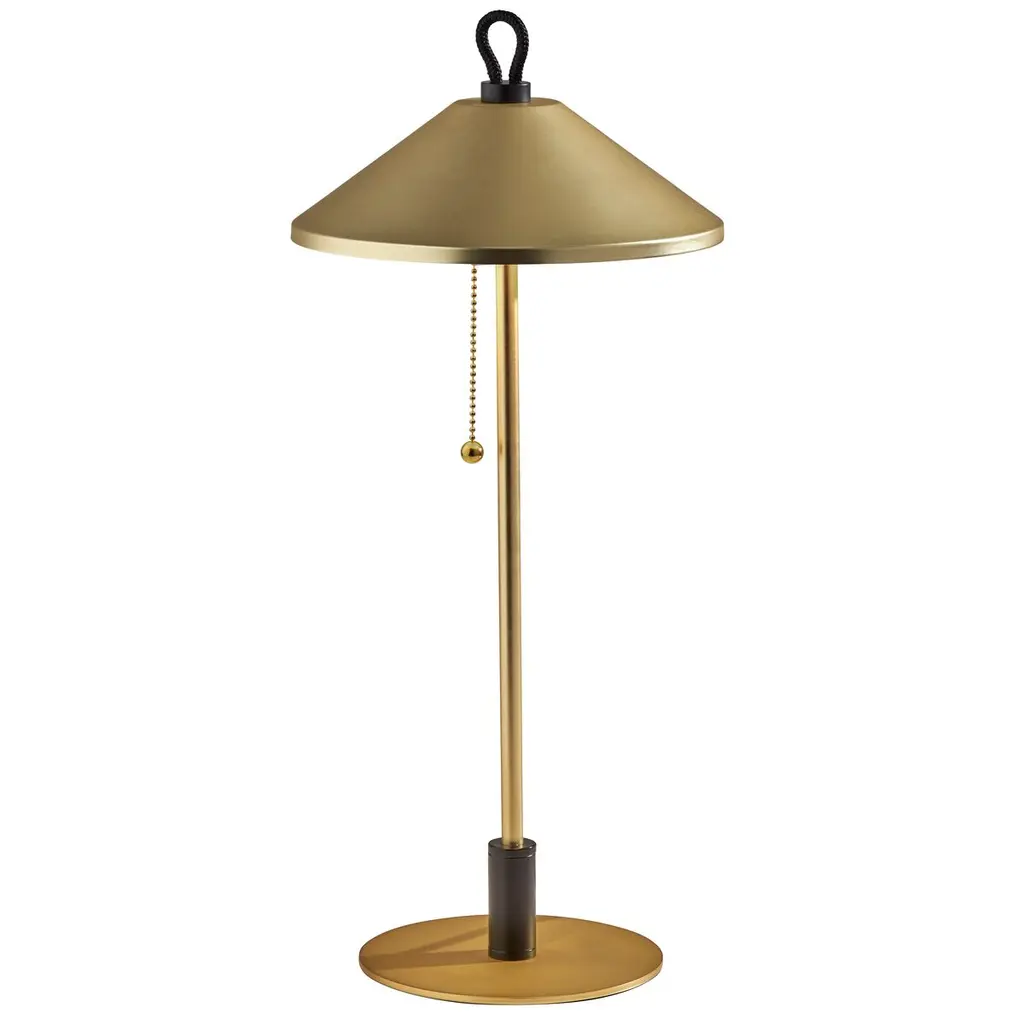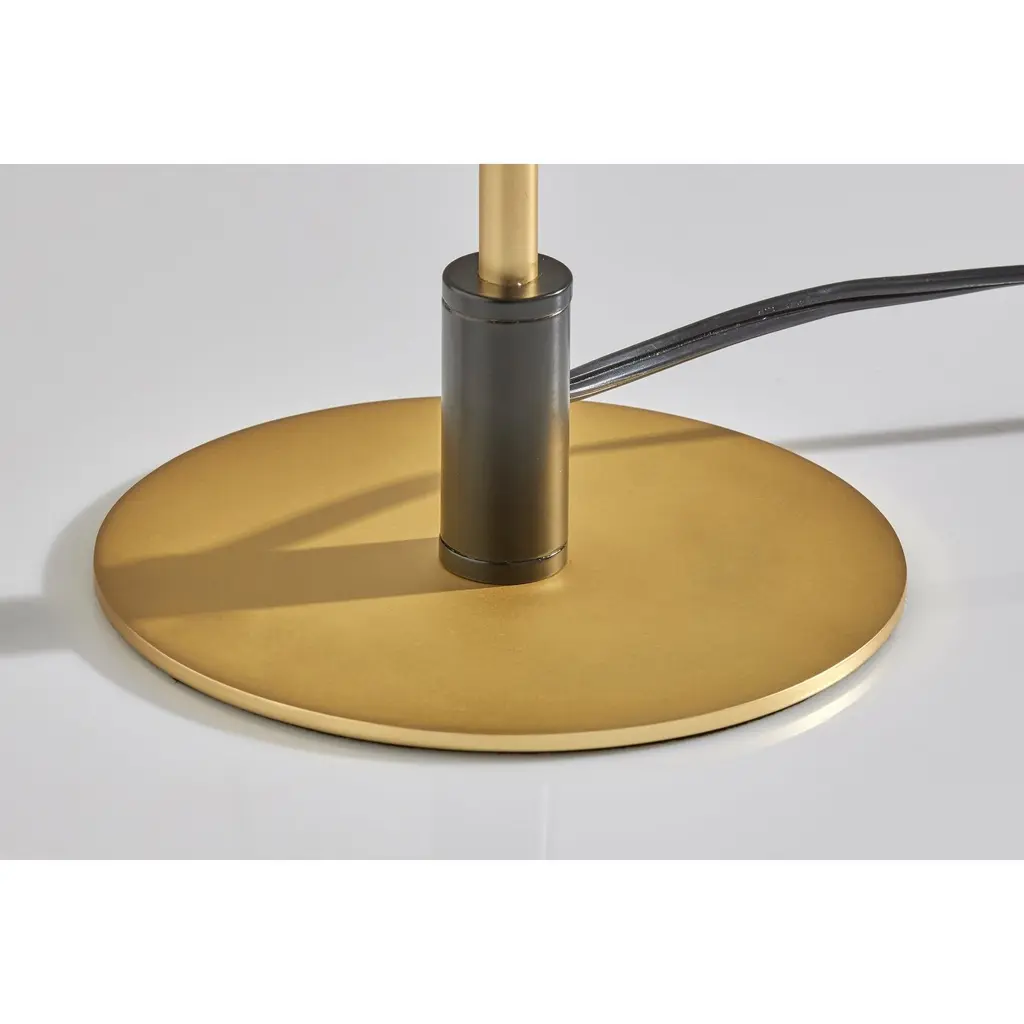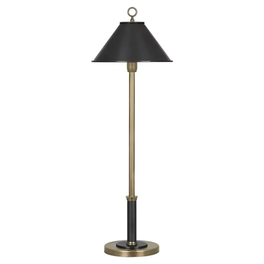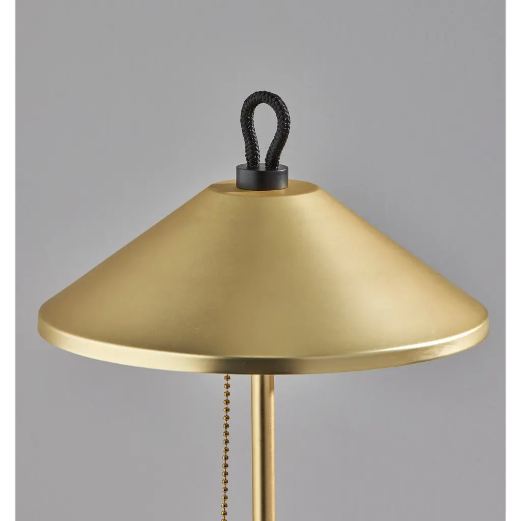 In classic form, the Kaden table lamp's mixed metal finish and elegant design adds a polished accent to your space. Featuring a slim round base, thin pole and tapered conical shade, the dual-metal design is crafted of black or brass metal with beautifully contrasting accents. Two 5W replaceable LED bulbs are included and illuminate your room with 450 lumens of warm light. A pull-chain switch in brass finish easily turns the light on or off, while the lamp is powered by a black fabric-covered cord. The Kaden table lamp is also available with a brass finish and black metal accents. Complete your décor with the coordinating Kaden floor lamp.