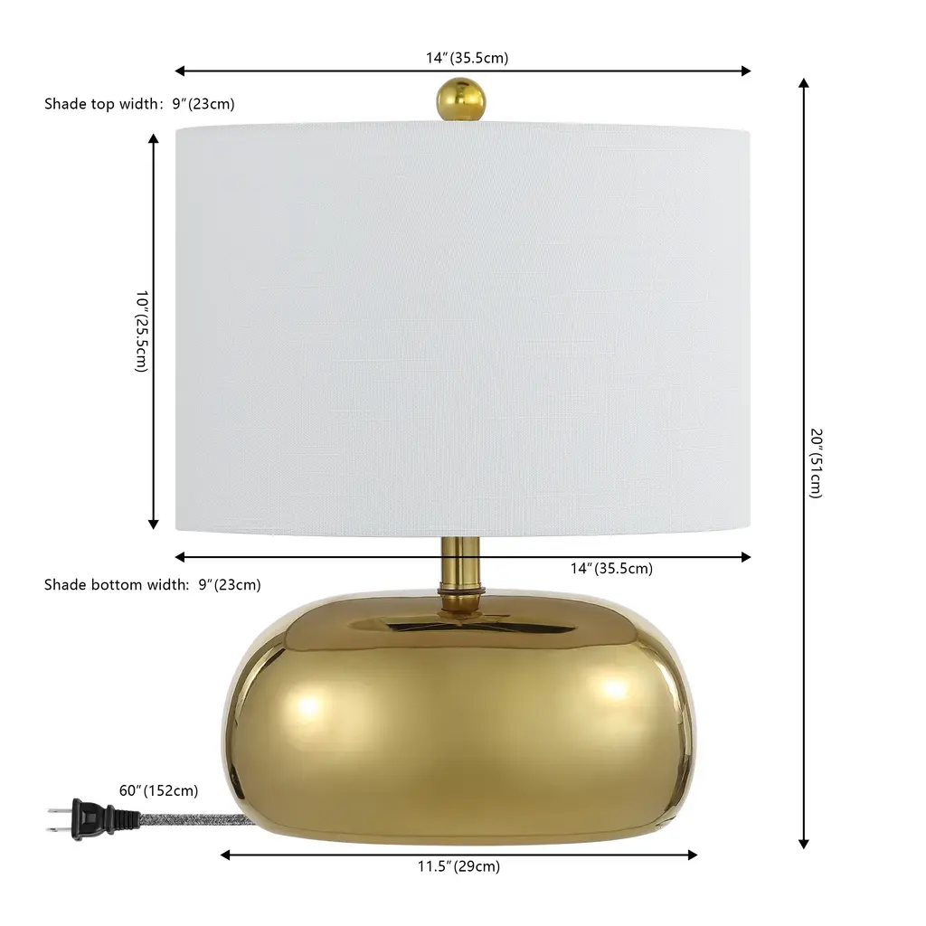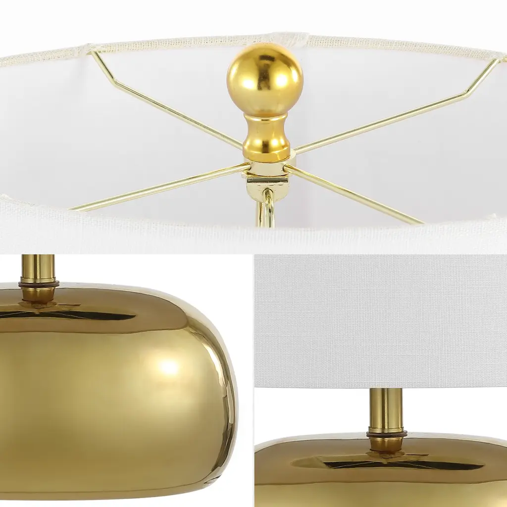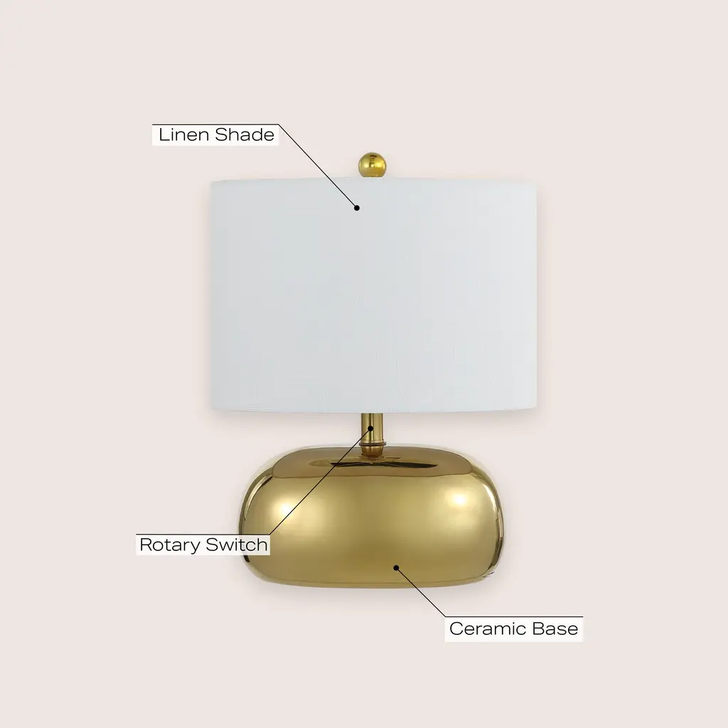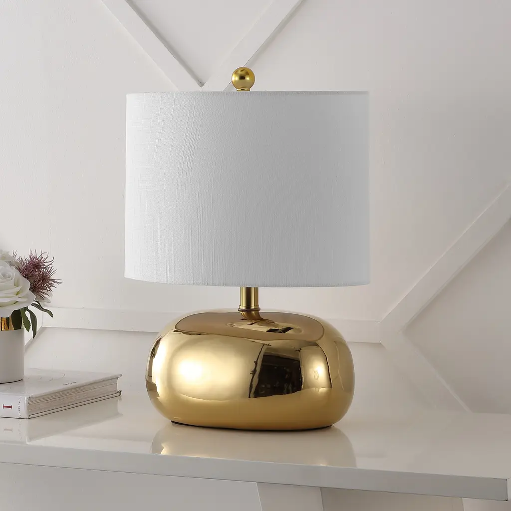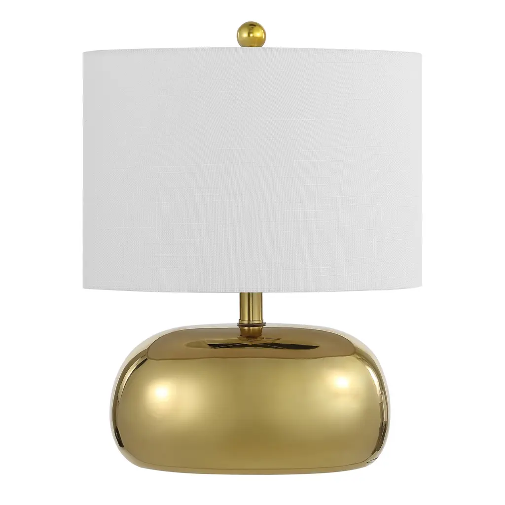 This chic, mid-century-inspired table lamp has an elliptical ceramic base and classic drum shade. An LED bulb provides plenty of warm, bright light. The metallic finish is perfect for a contemporary living room, office or bedroom; or use a pair on a long console.Features:Dimensions:About us:You see a lamp.We see a decorative work of art.A perfectly curved shade casts a dramatic shadow on a floor. Compatible with LED lightbulbs: as easy on the environment as they are on the eyes. The JONATHAN Y Lighting collection considers every detail from impeccably sourced materials to designer styling. And our prices are so attractive, we've transformed a functional necessity into a fashion accessory.JONATHAN Y Lighting - a fashion revolution in home decor.