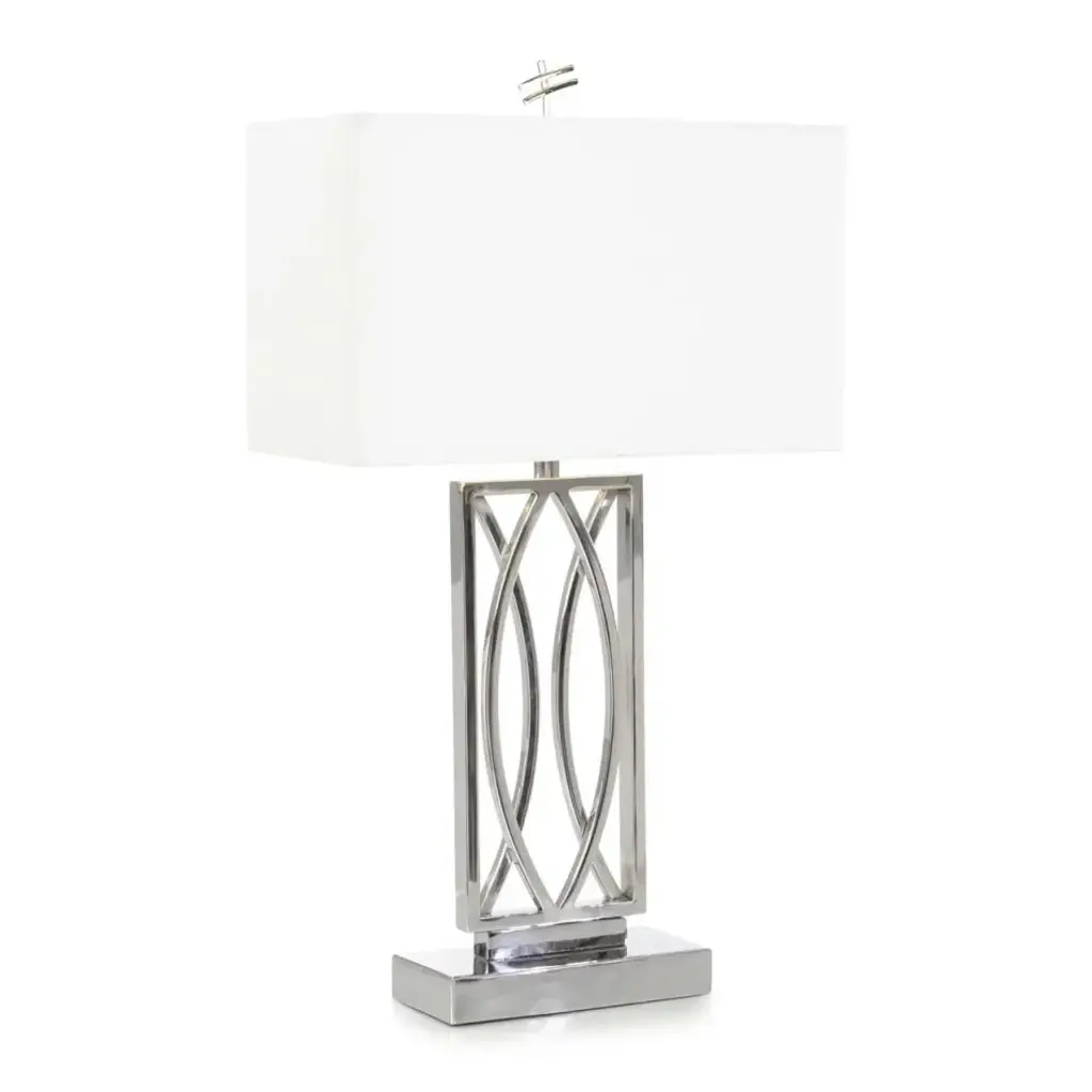 Crafted entirely of Polished Stainless Steel, the Kallan Table Lamp features a gorgeous symmetrical profile that displays two alluring ovate shapes in the center, providing textural depth to the piece. The piece rests atop a rectangular base, matching the body, providing a consistent look throughout. A cross-shaped finial adorns the apex, providing an asymmetric motif to playfully contrast the rest of the piece.