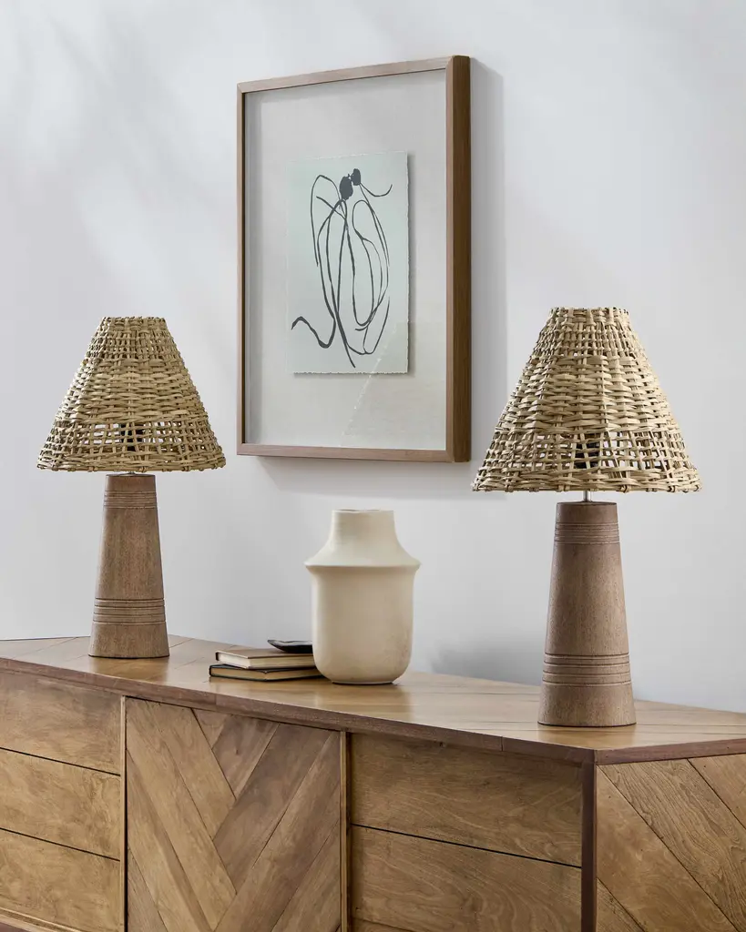 Collection: Kalyandurg Colors: Dark Red, Translucent Material: Body: Resin,Shade (Outside): Rattan,Shade (Inside): Rattan Made In: China Lighting Type: Accent Table Lighting Shade Material: Rattan, Rattan Shade Color: Brown, Brown Cord Length: 6' Switch Type: Rotary Number of Bulbs: 1 Socket Type: LED Bulb Wattage: 60W