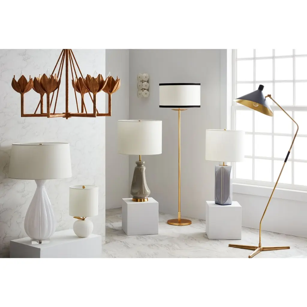 Dimpled accents gives this ceramic table lamp depth and shape, topped with a glossy blue finish and classic linen shade. A golden base elevates the look.