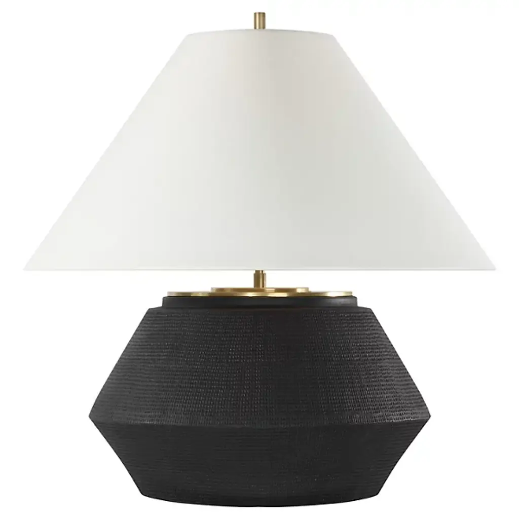 The Karam Medium Table Lamp by Sean Lavin for Tech Lighting invites function and elegance to a space, joining texture and scale to its contrasting design elements. The hand-combed artisanal ceramic base and smooth sleek brass shade convey a distinctive layering of light with a distinctly natural feel.