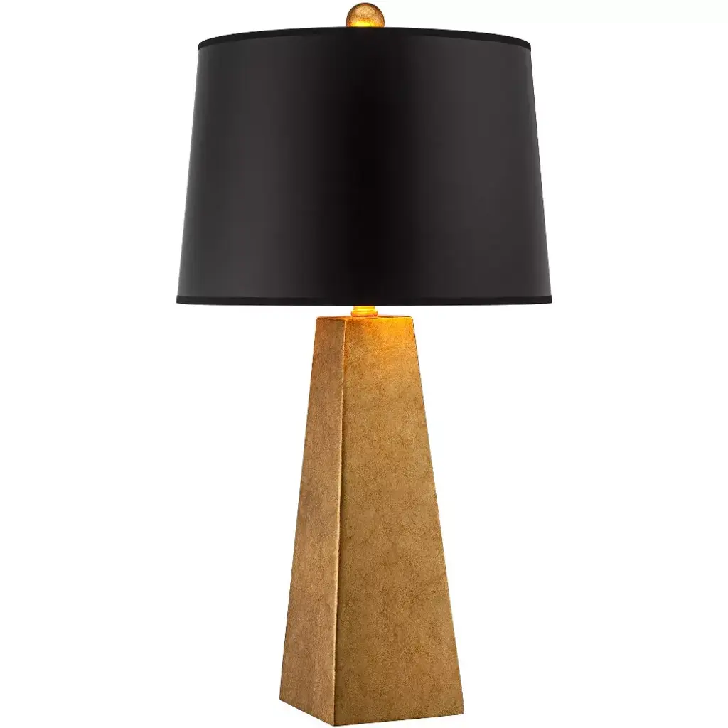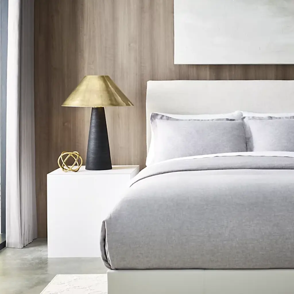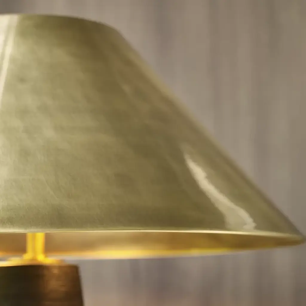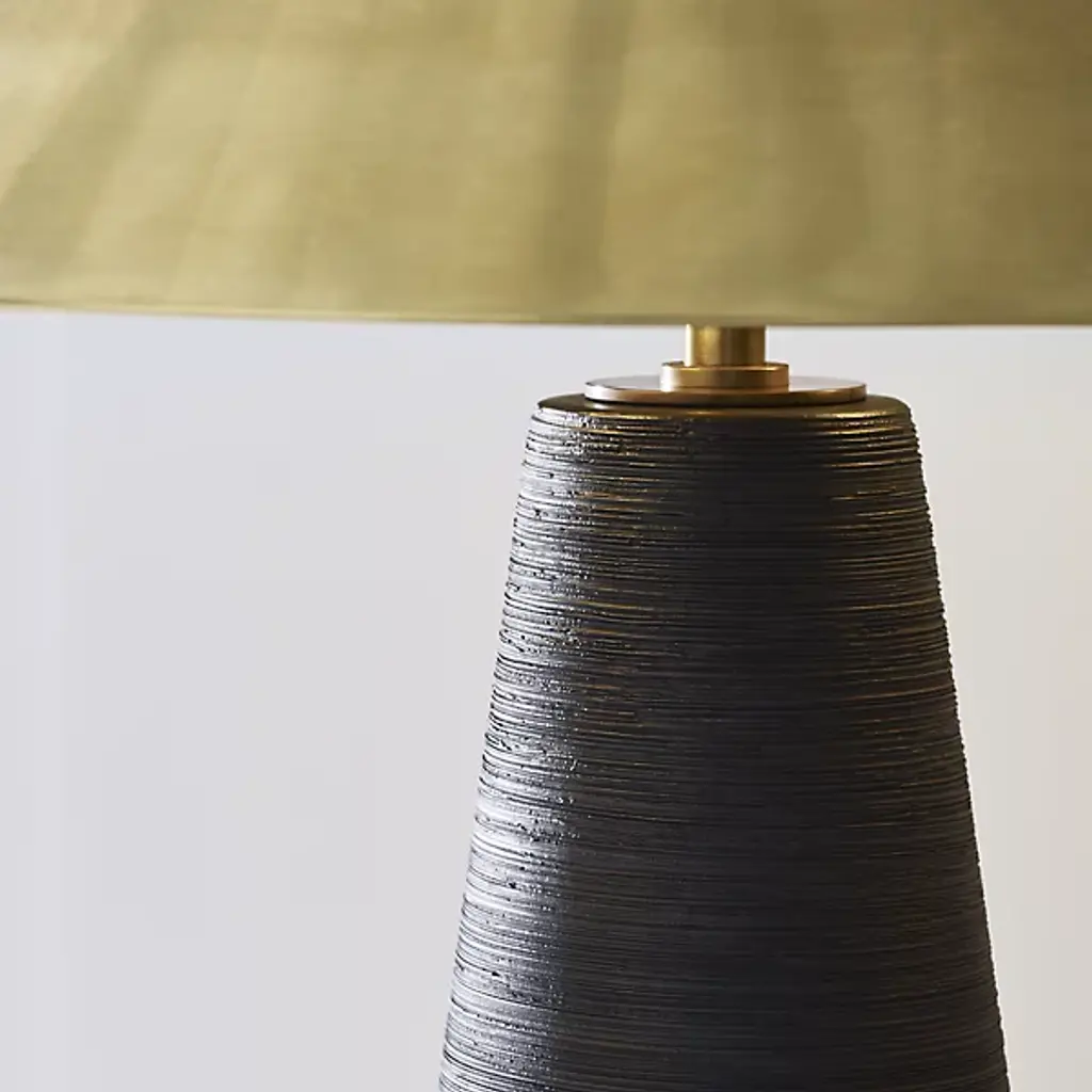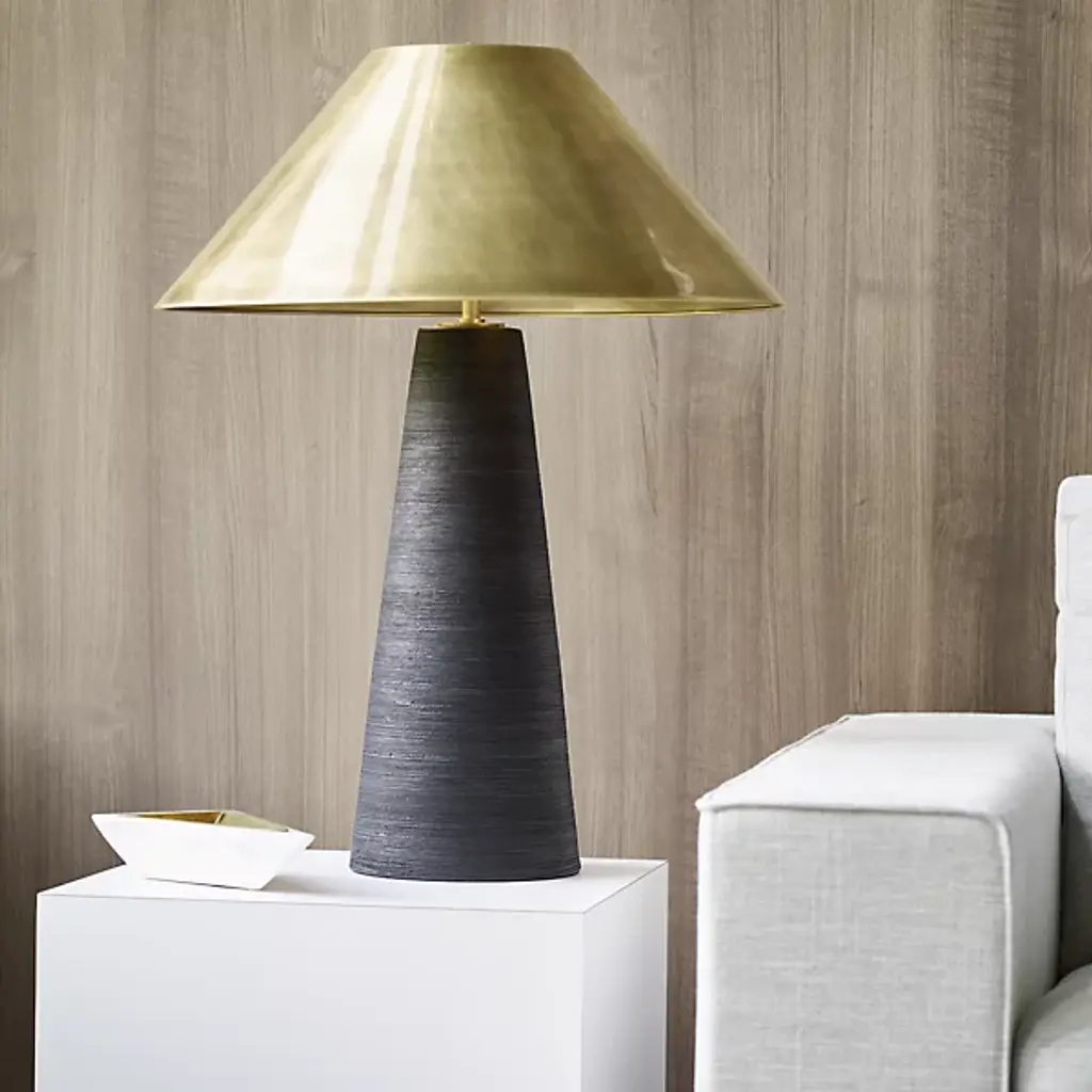 The Karam Table Lamp from Visual Comfort Modern matches natural texture with a simple form for a rustic and contemporary look. Designed by Sean Lavin, it features a conical, hand-combed ceramic base paired with a smooth brass shade, creating a layered lighting effect that casts a warm, ambient glow, enhanced by a slide socket dimmer for easy adjustment. The ceramic base and flared shade offer a contrasting mix of Mid-Century and Artisanal Modern character certain to enhance its surroundings.
