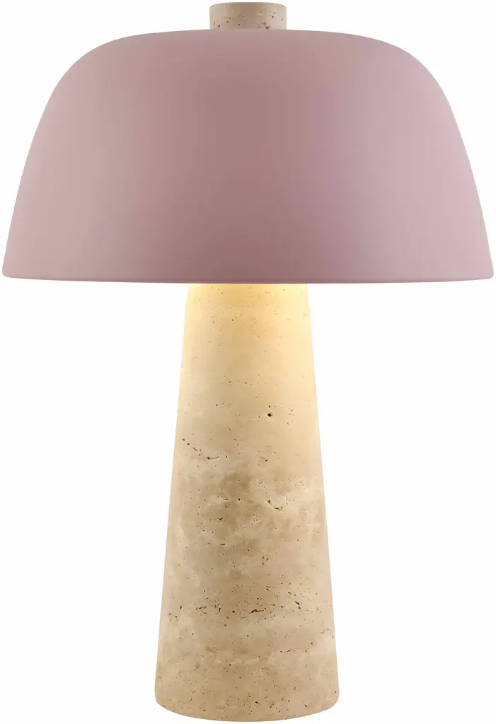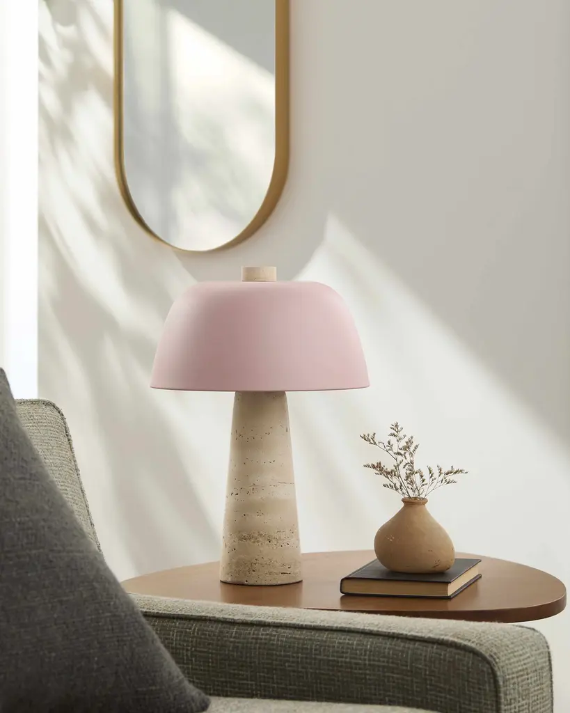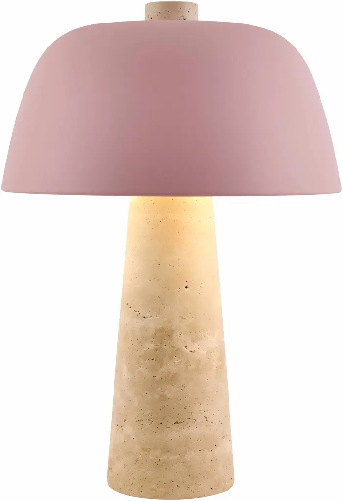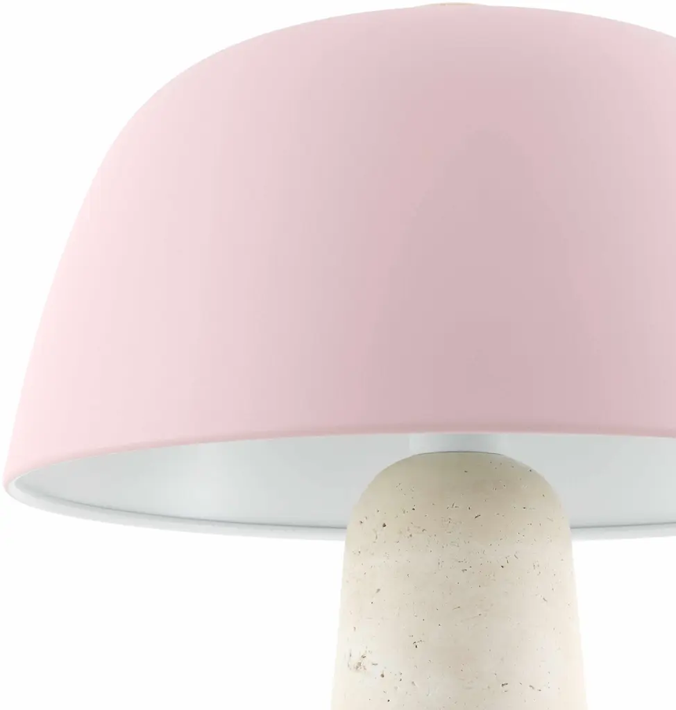 Collection: Karamadai Colors: Beige, Blush, White, Black Material: Body: Travertine / Shade (Outside): Metal / Shade (Inside): Metal Styles: Contemporary Made In: China Lighting Type: Accent Table Lighting Shade Material: Metal Shade Color: White, Blush Cord Length: 6' Switch Type: Rocker Number of Bulbs: 1 Socket Type: E-26 Bulb Wattage: 40W