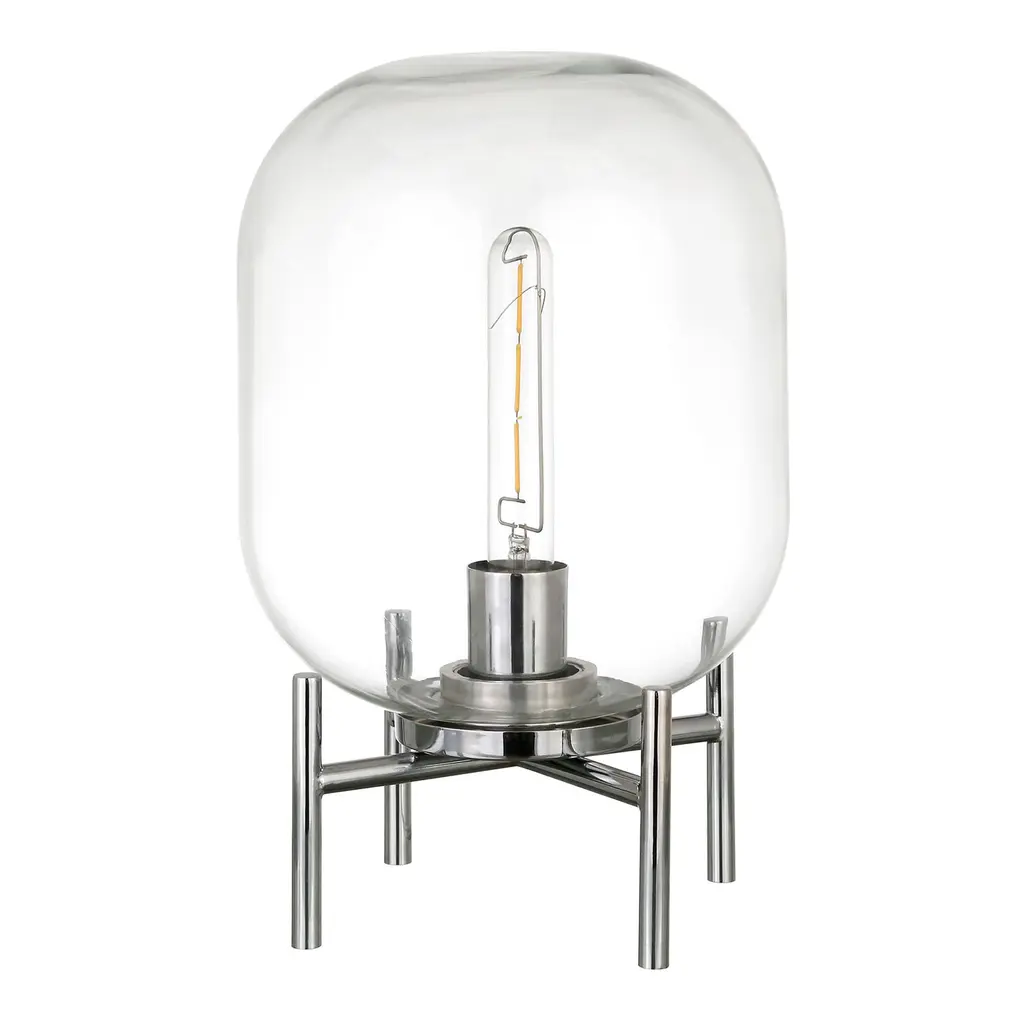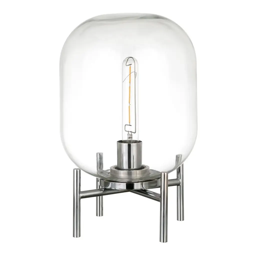 A petite desktop statement piece with an inspired industrial design, the Kari accent lamp is crafted of clear glass with an X-crossed metal stand in blackened bronze, golden brass or shining nickel. An eye-catching object lamp that complements a range of decor from mid-century modern to farmhouse, its transparent cylindrical shade makes it perfect for pairing with one of our vintage-style Edison light bulbs.
