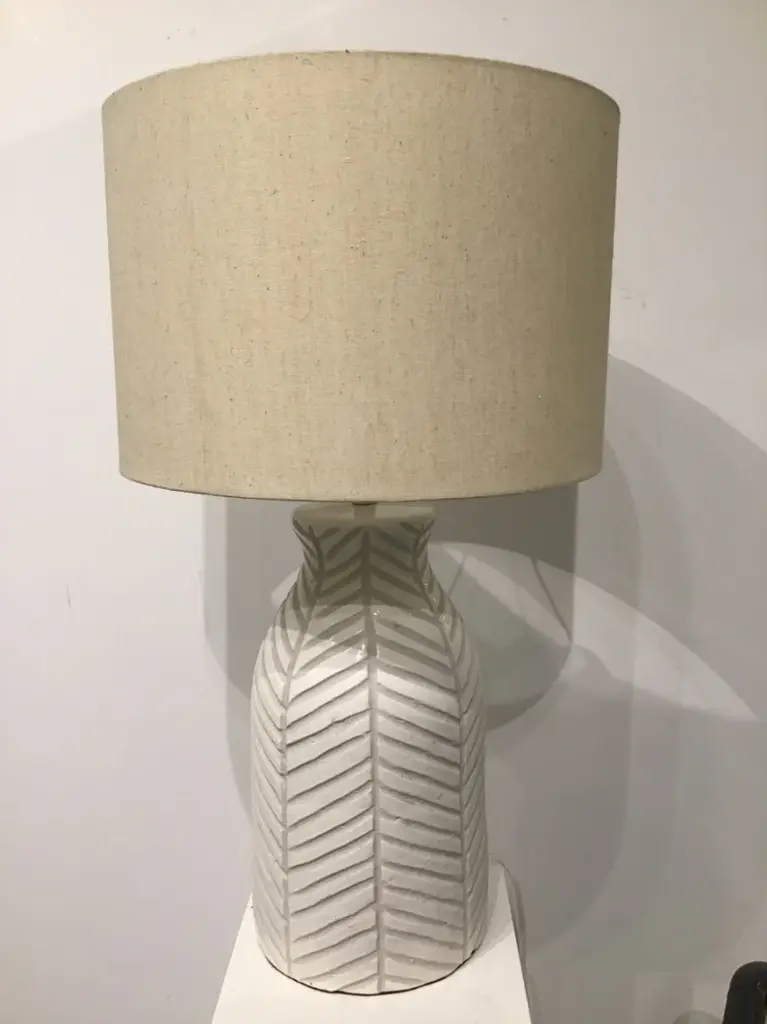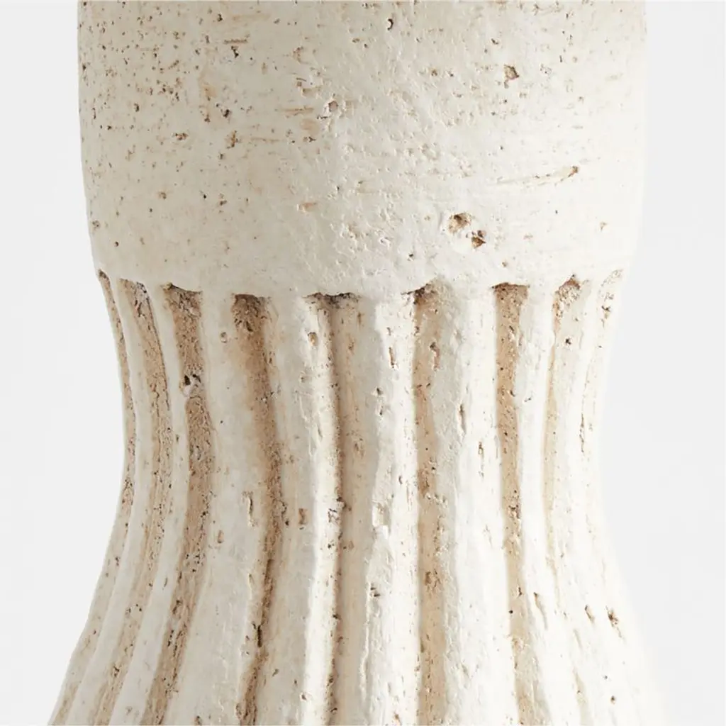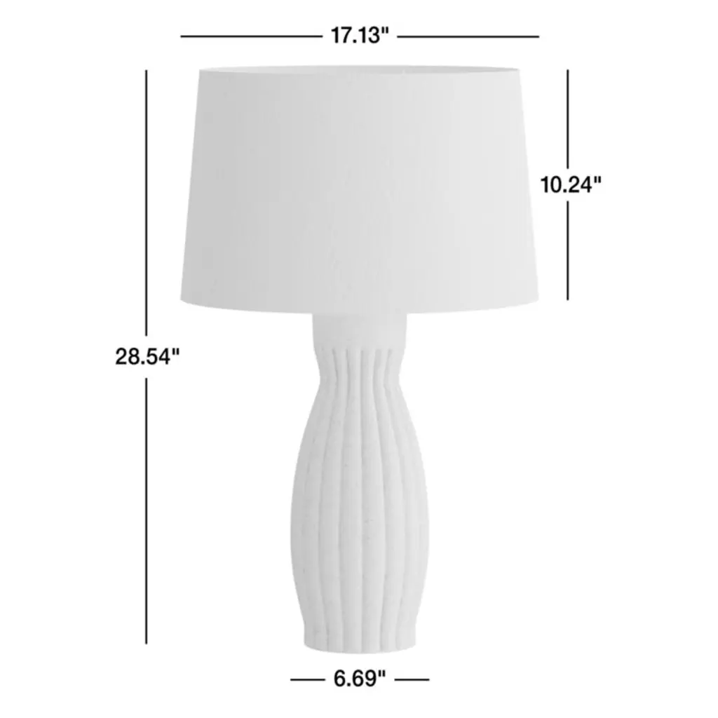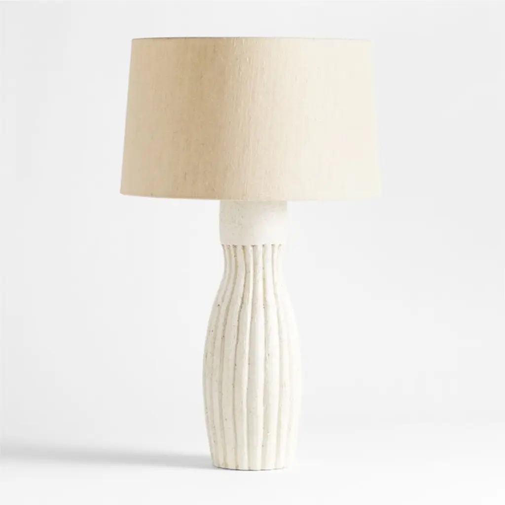 Deep ribbing textures our Karina table lamp, giving it the classical look of an ancient artifact. Hand-formed by skilled artisans, the terracotta base has a raw, pitted surface unified by the matte ivory finish. Topped with a slightly tapered jute shade in a matching hue, our Karina lamp has a regal yet approachable presence on a console, side table or dresser.