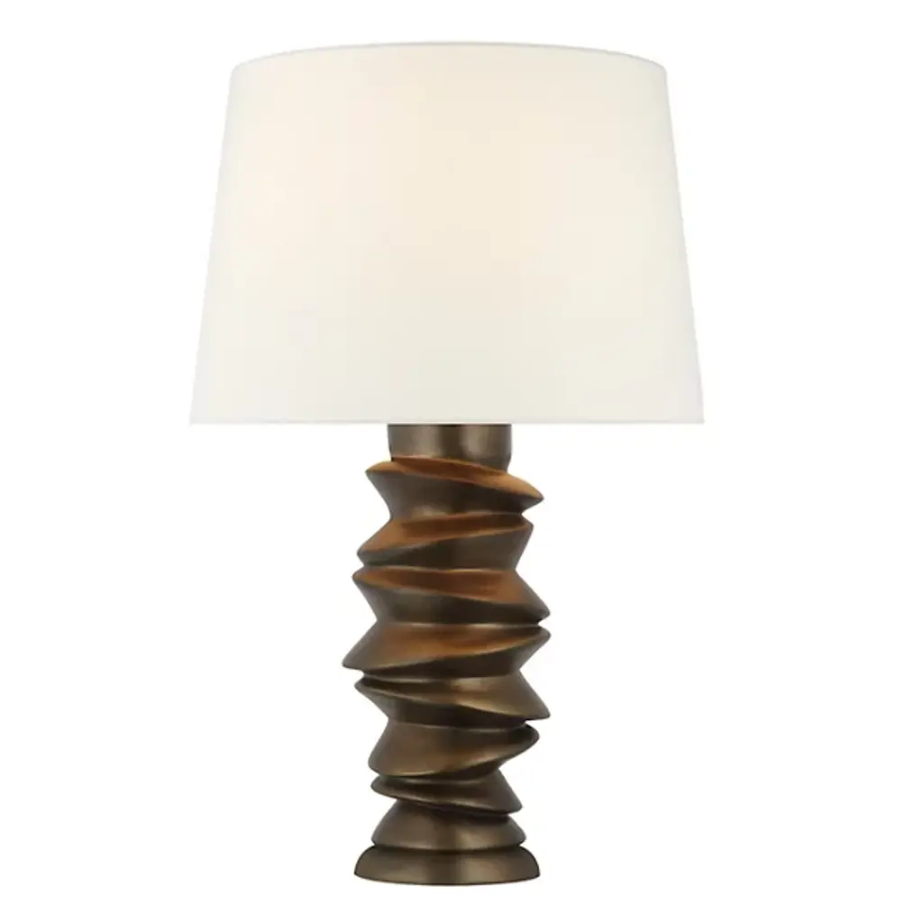 The Karissa Table Lamp from Visual Comfort Signature, formerly known as Visual Comfort, creates a journey for the eyes with a cascade of sculpted shapes glazed in a warm light. The modern piece is a source of intrigue and tells of the home’s aesthetic, whether over a console, side table, or nightstand. The base can serve as a standalone sculpture. It features a tower of protruding disc elements that excites with dynamism. A tapered linen shade balances the base out with a sense of calm. The glare-reducing shade filters and funnels the light to create a comfortable ambiance and a bold, stepped silhouette below.