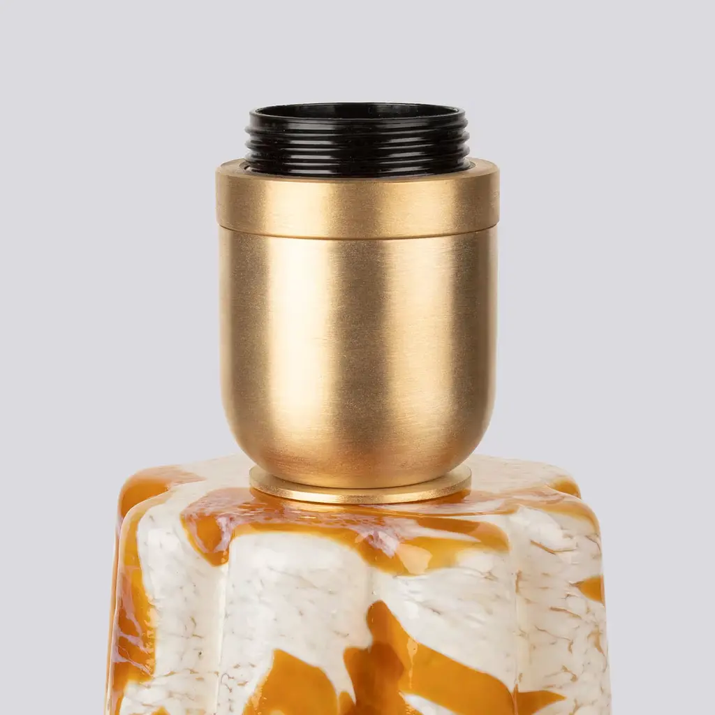 Introducing the Stories of Italy Bucket Table Lamp, a testament to craftsmanship. Its Murano blown glass base, made with the Nougat technique, features a flower-shaped design with amber glass shards on an ivory base, exuding elegance. Paired with a tropical-inspired rope lampshade, brass accents, and a champagne-colored fabric cord, it blends style and practicality. This lamp not only illuminates with a warm glow but also serves as a striking art piece, enhancing any space with timeless beauty.