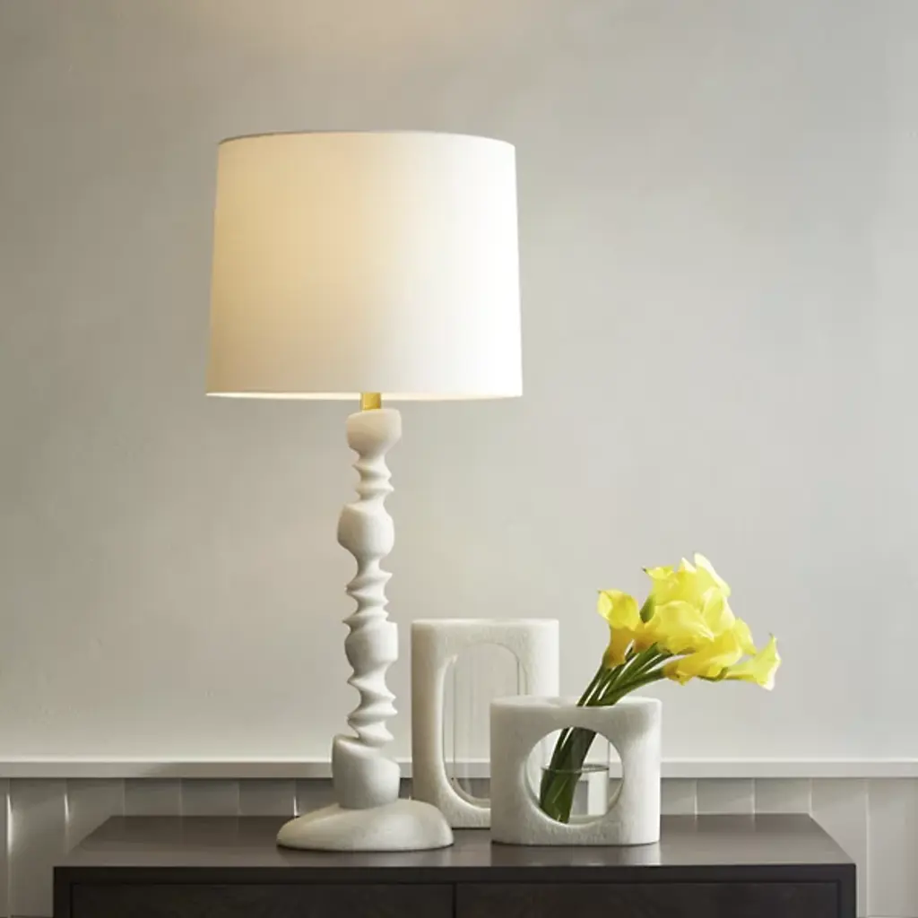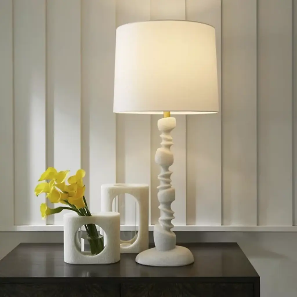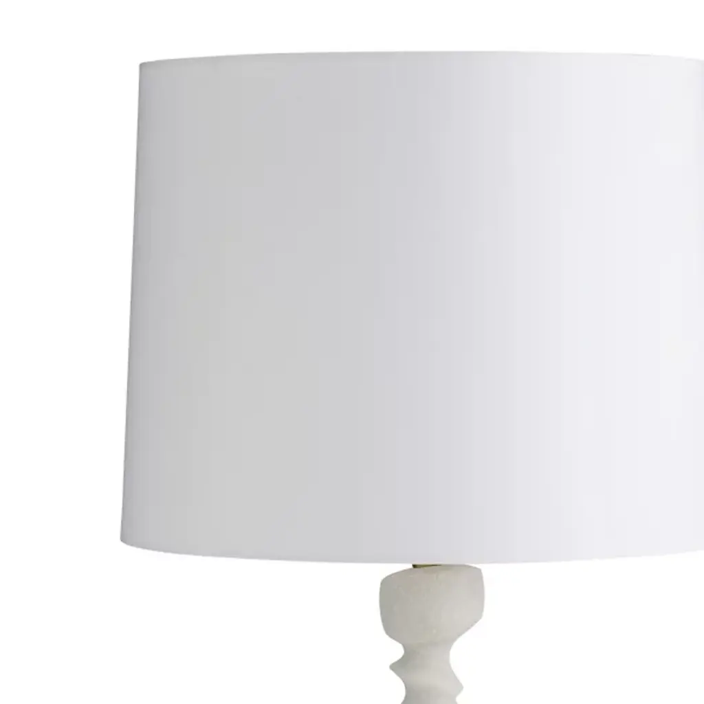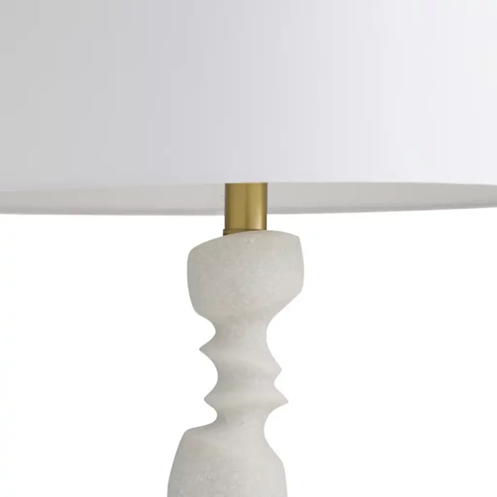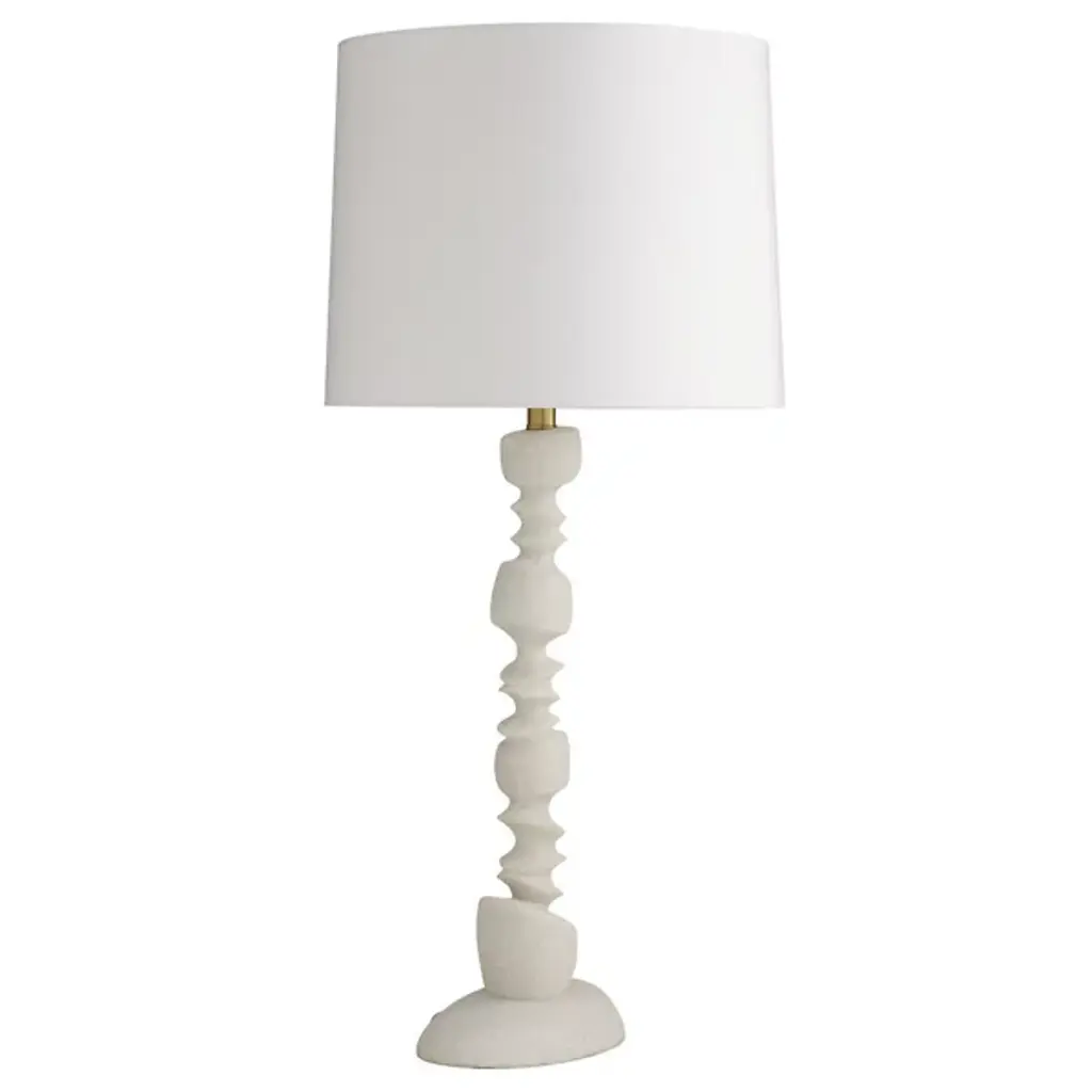 The Kashmir Table Lamp from Arteriors features an ivory ricestone composite base that rises like stacked river stones in a totemic sculpture. Each rounded segment builds upon the previous form, creating rhythmic movement through organic curves that suggest natural balance. The sculptural base provides meditative presence while the off-white linen drum shade with cotton lining offers gentle illumination. Antique brass hardware and finial add a metallic warmth to complete this serene composition, which captures the tranquil quality of stone balancing in a contemporary form.