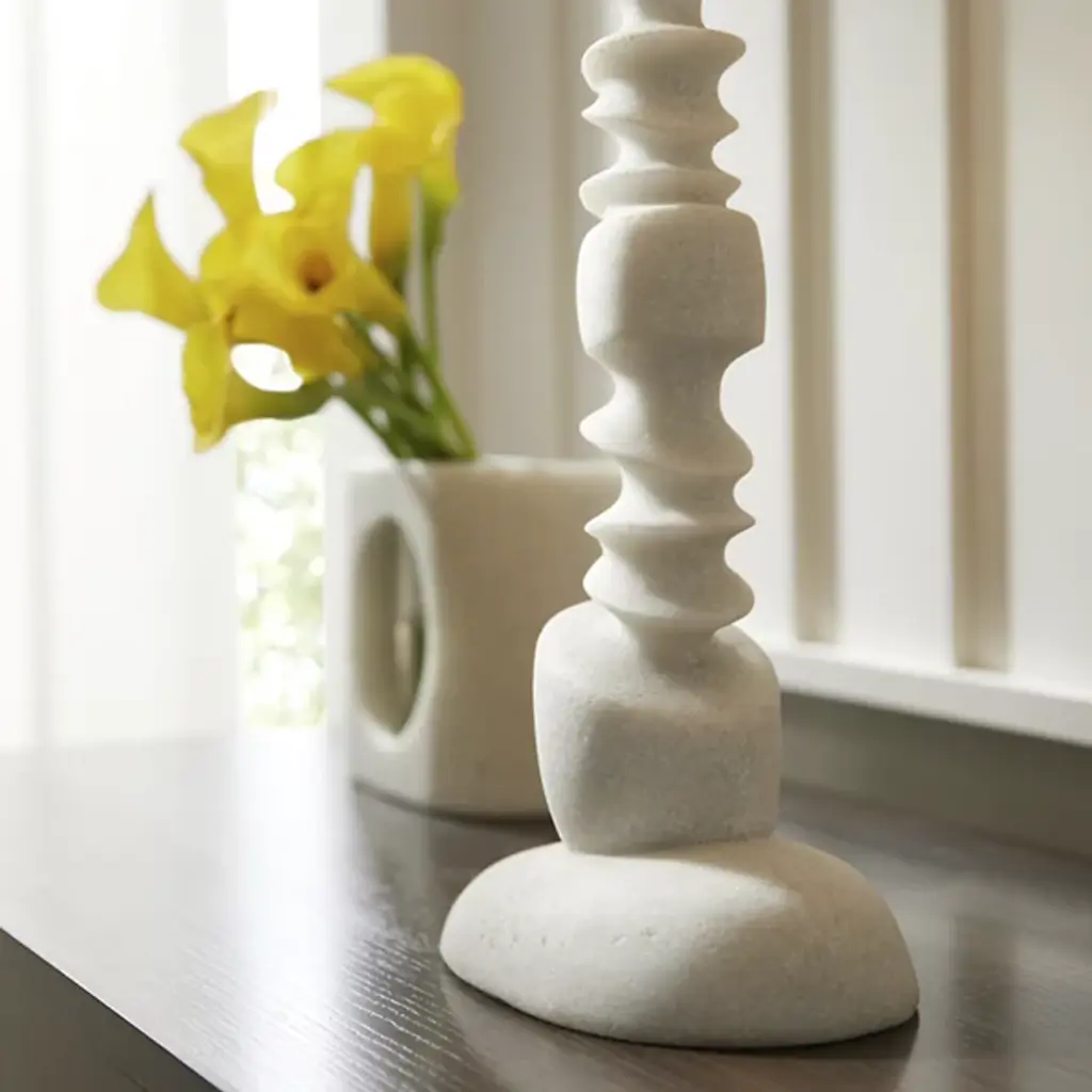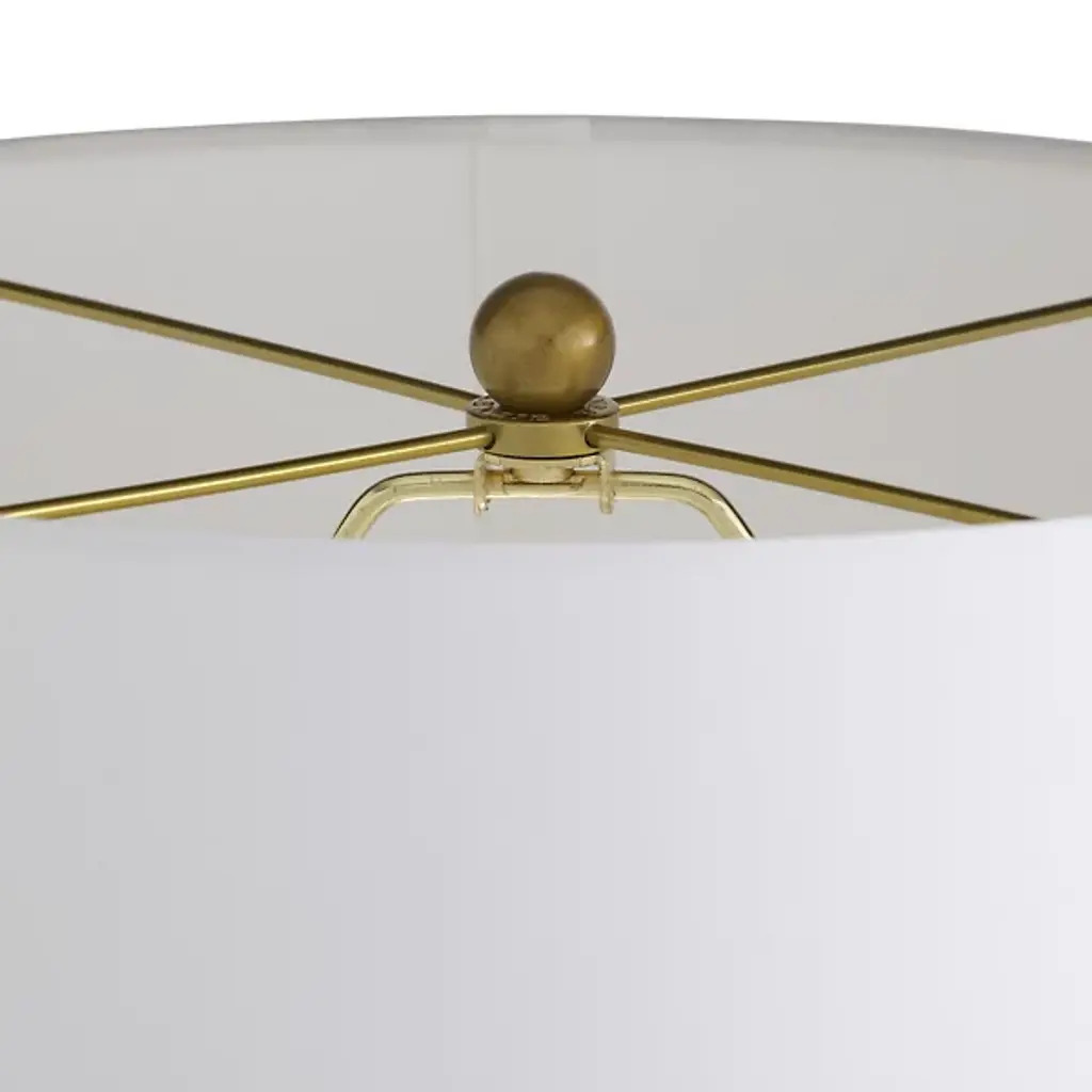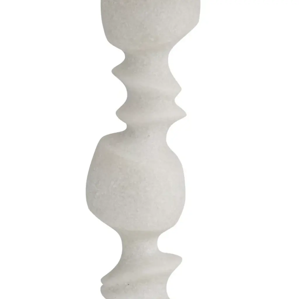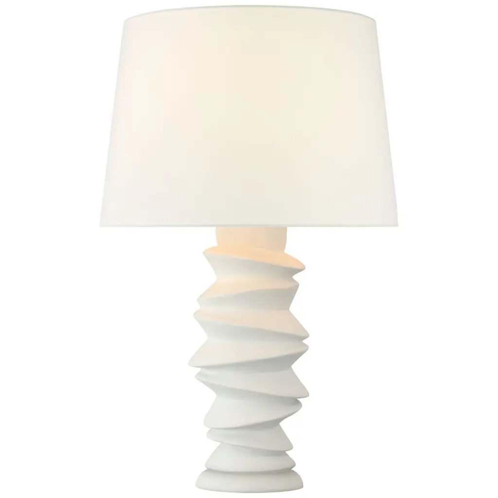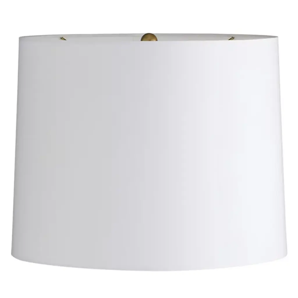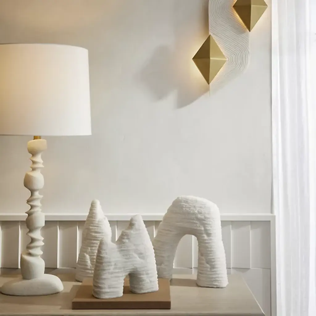 The Kashmir Table Lamp from Arteriors features an ivory ricestone composite base that rises like stacked river stones in a totemic sculpture. Each rounded segment builds upon the previous form, creating rhythmic movement through organic curves that suggest natural balance. The sculptural base provides meditative presence while the off-white linen drum shade with cotton lining offers gentle illumination. Antique brass hardware and finial add a metallic warmth to complete this serene composition, which captures the tranquil quality of stone balancing in a contemporary form.