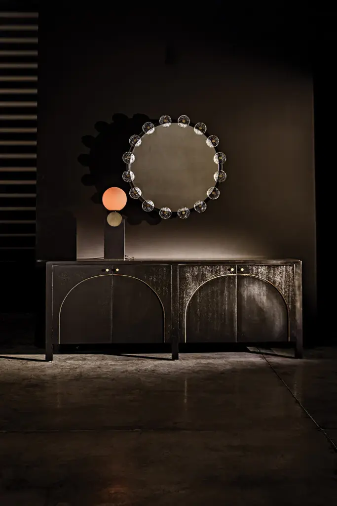 A dazzling display of design virtuosity, the artisan crafted Kate Table Lamp is an explosion of light. The piece finishes in matte black and aged brass for a modern look.