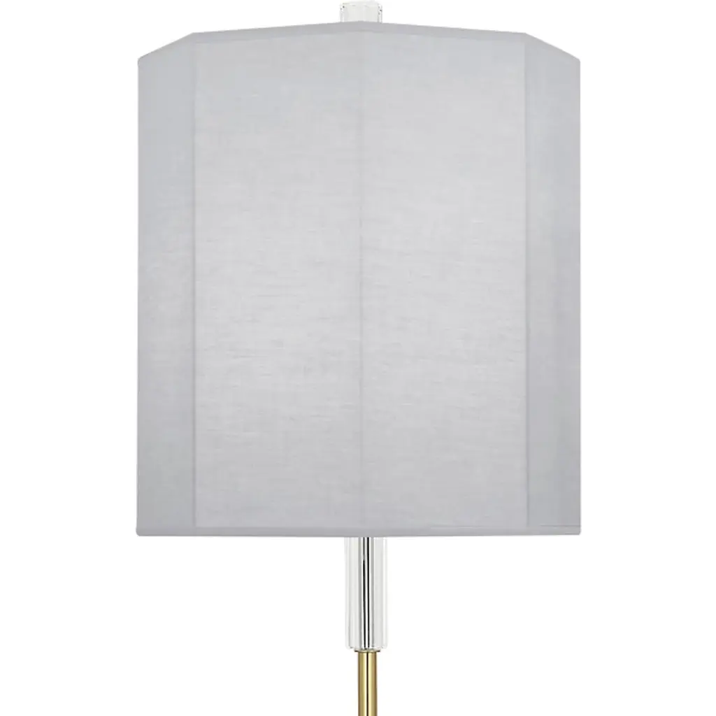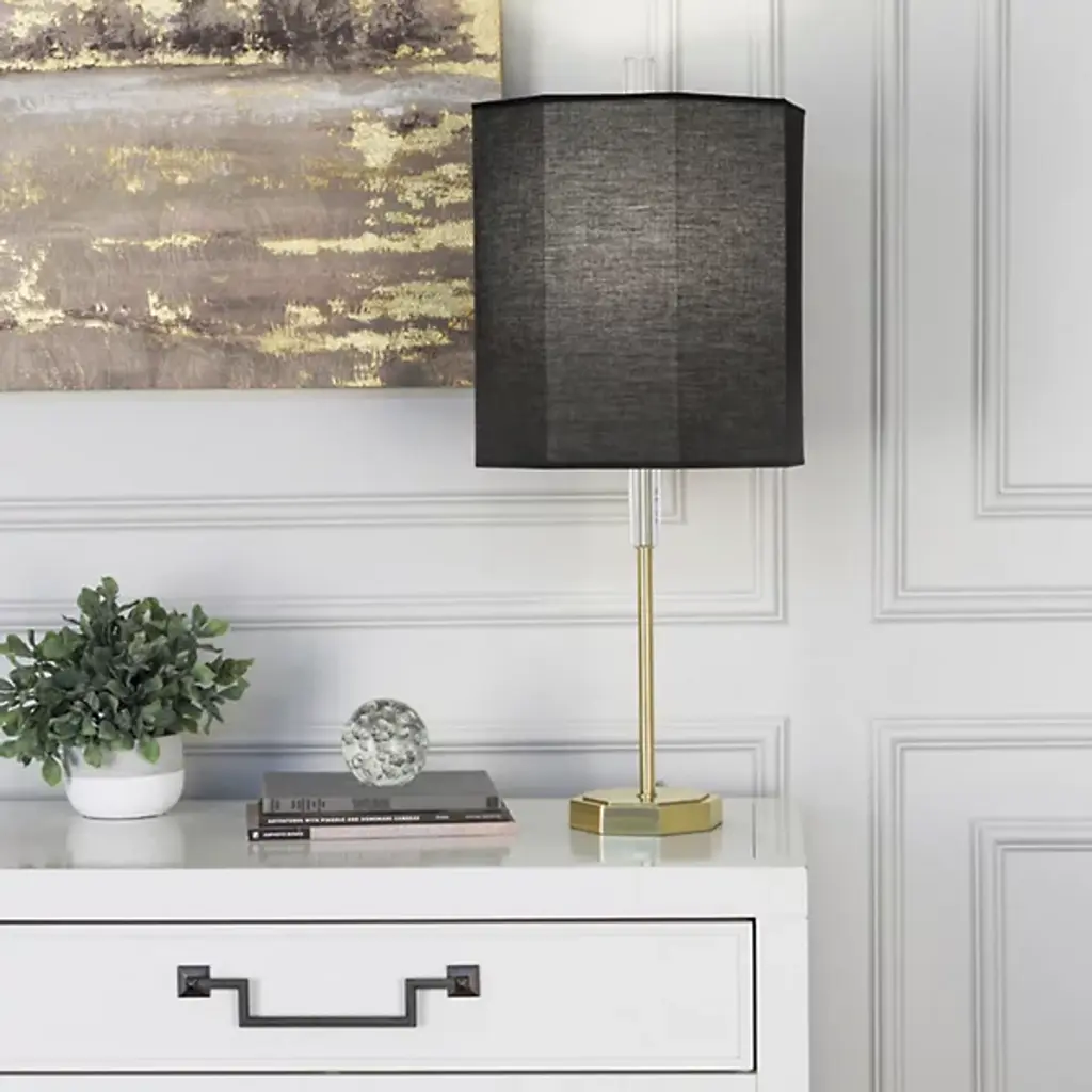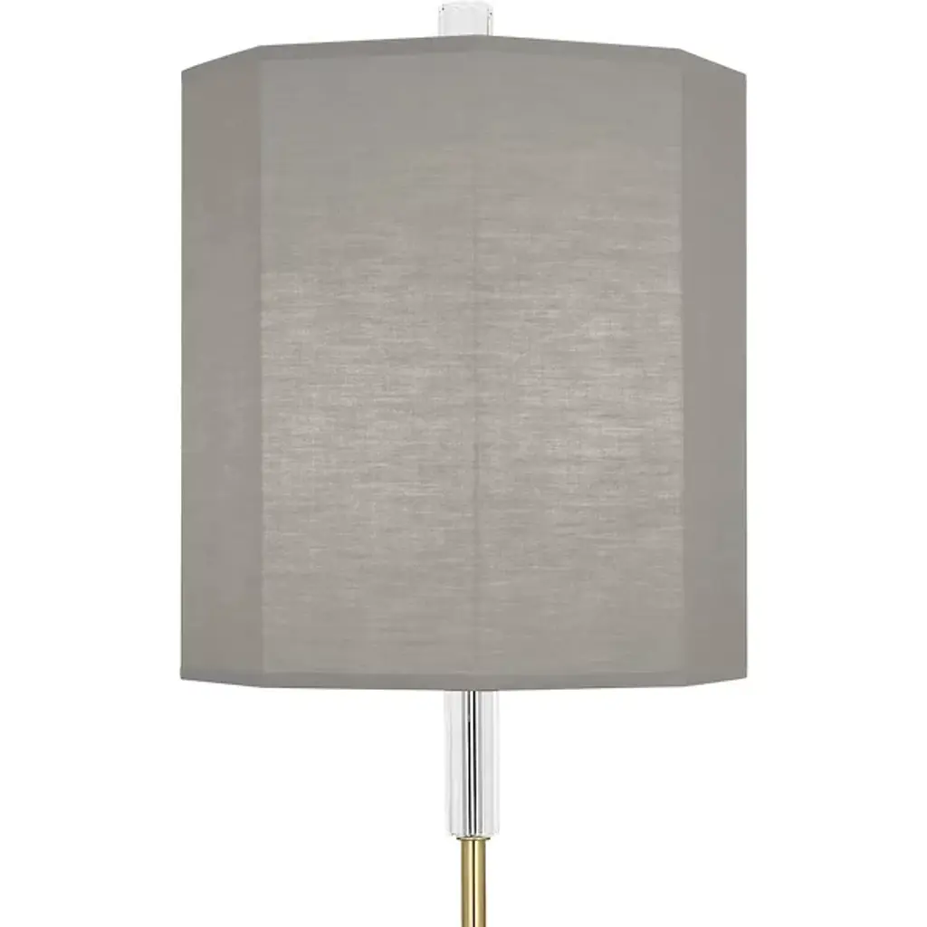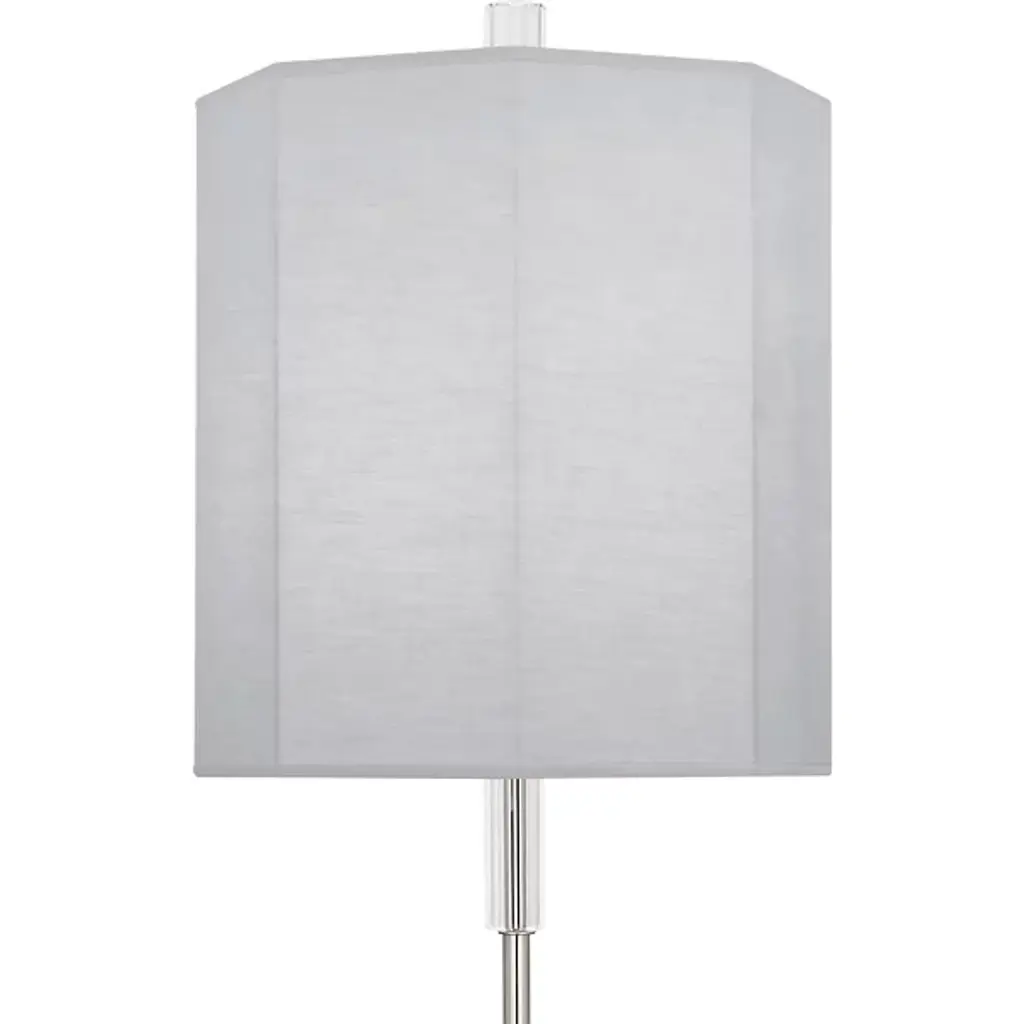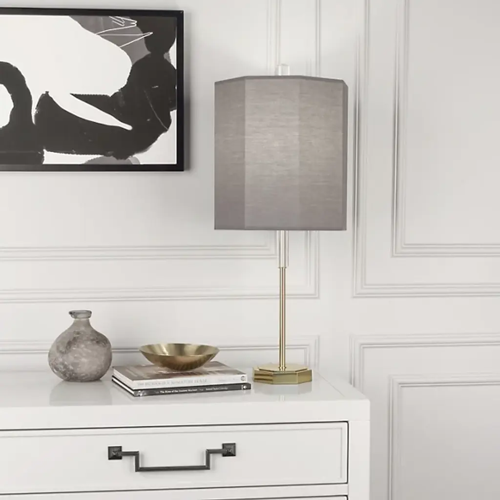 The Kate Table Lamp from Robert Abbey brings a clean and distinctive accent to a room as it illuminates with a gentle glow. Its refined hardback fabric shade features an octagonal shape that instantly refreshes its familiar silhouette. A thin polished metal body is held in place by a matching octagonal base while its incandescent lamping sends light filtering through the shade to brighten the room and set a relaxing tone.
