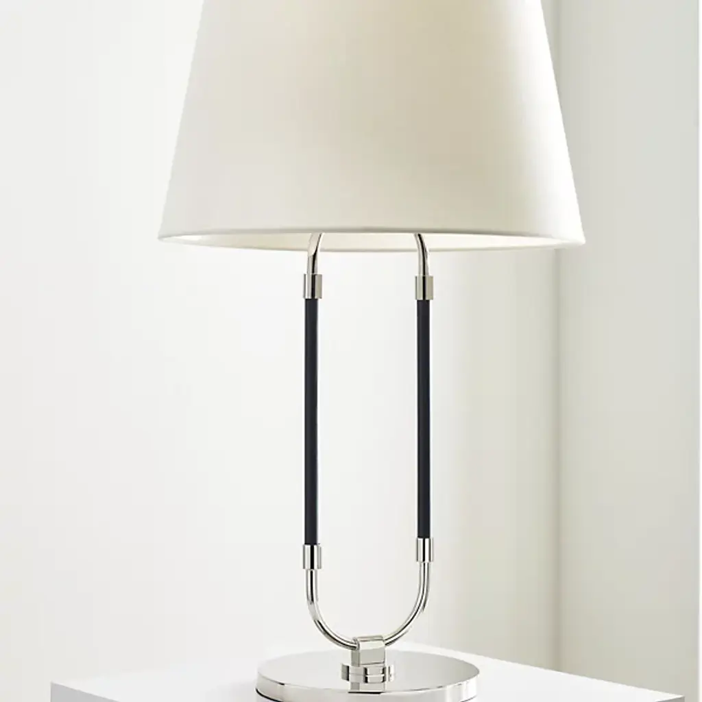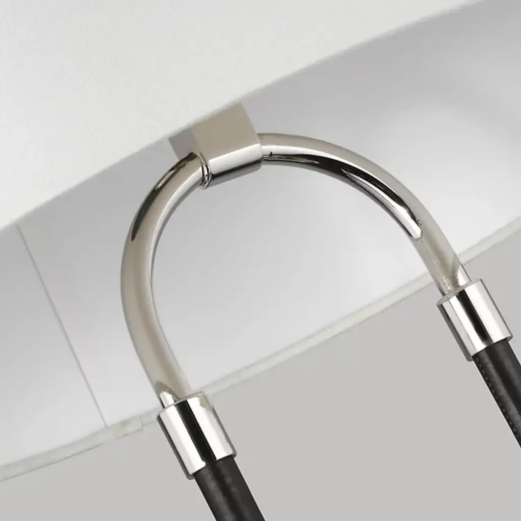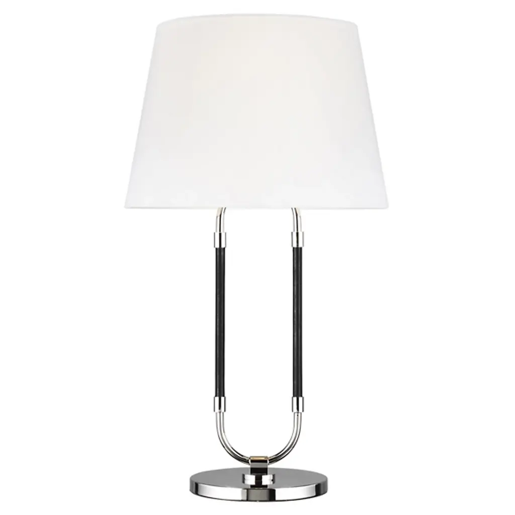 Add an open, sculptural structure to your indoor spaces with the Katie Table Lamp from Visual Comfort Studio, formerly known as Lauren Ralph Lauren. Starting with a disc base holding up a tall lozenge structure, its smooth vertical branches are wrapped with leather to contrast with the bare metal above and below it. The upper end of the body holds a single LED lamp under a flared shade of white linen, gentling direct glare to a pleasant ambiance.